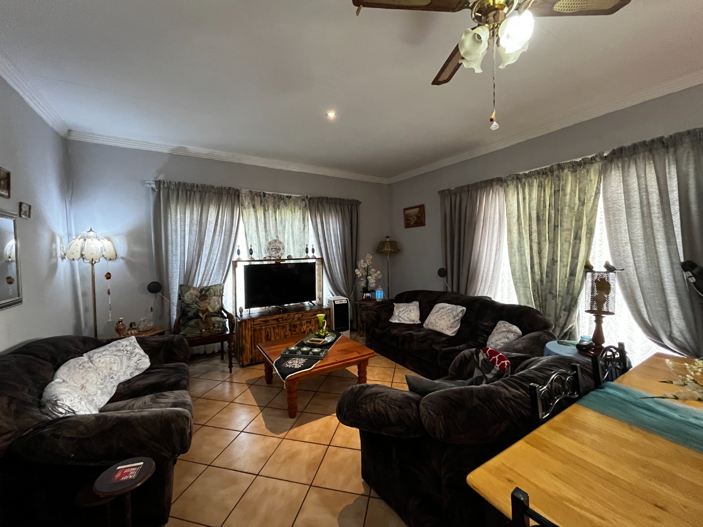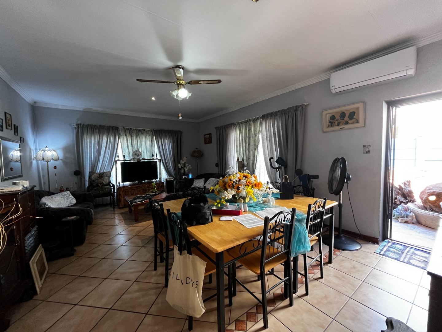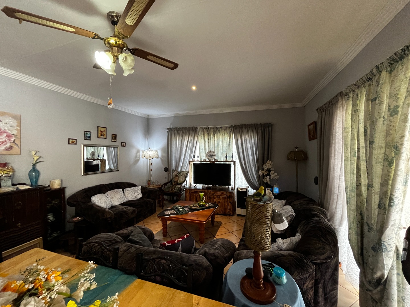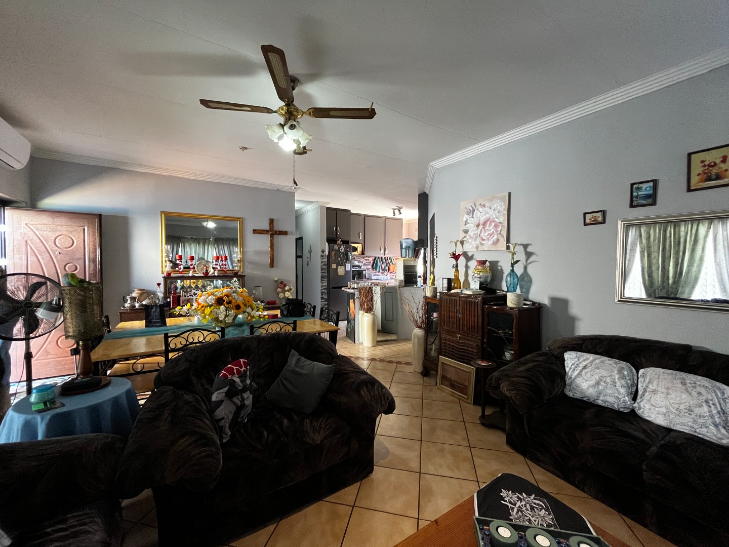 Step inside to an open-plan living and dining area, designed for flexible use and comfortable family life. This spacious zone features durable tile flooring and decorative crown molding. For year-round comfort, the area is equipped with ceiling fans and an air conditioning unit. The functional kitchen, visible from the living space, boasts ample cabinet storage and tiled flooring. An additional family TV room provides a versatile space for relaxation.