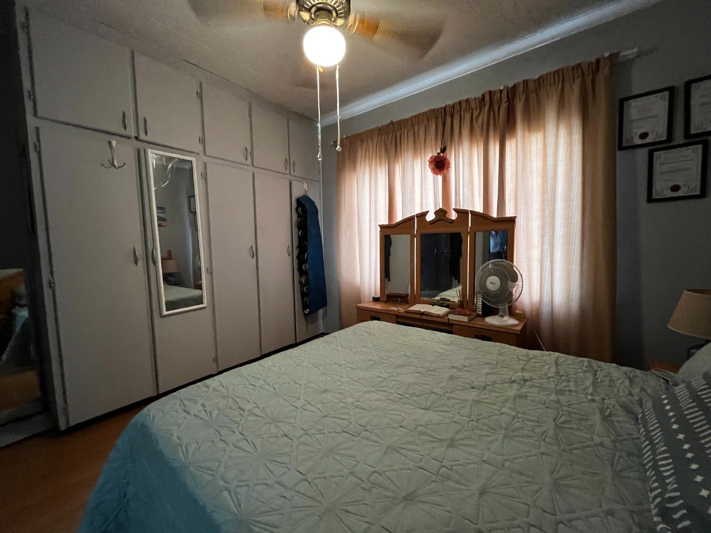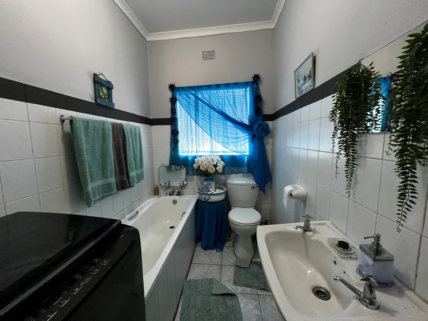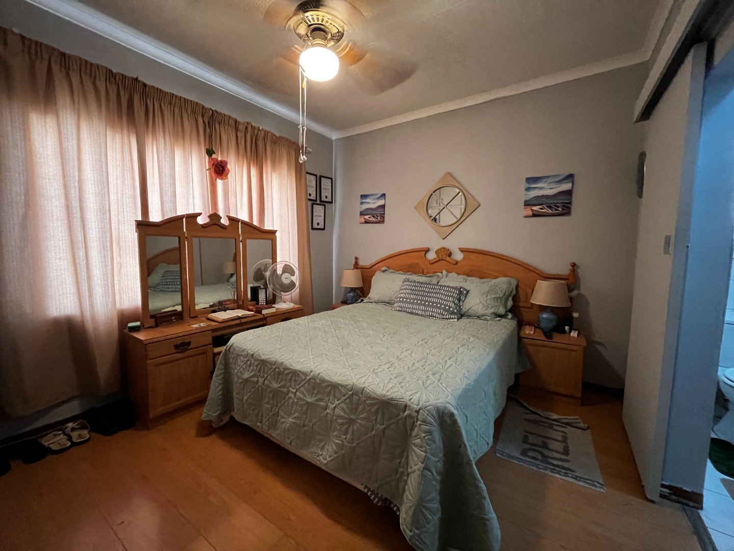 The residence offers three comfortable bedrooms, providing ample private space. One bedroom features appealing hardwood flooring and a ceiling fan, while another benefits from extensive built-in wardrobes for practical storage. There are two bathrooms in total, with one being an ensuite, offering convenience and privacy. The main bathroom includes a bathtub and toilet, with tiled walls for easy maintenance.