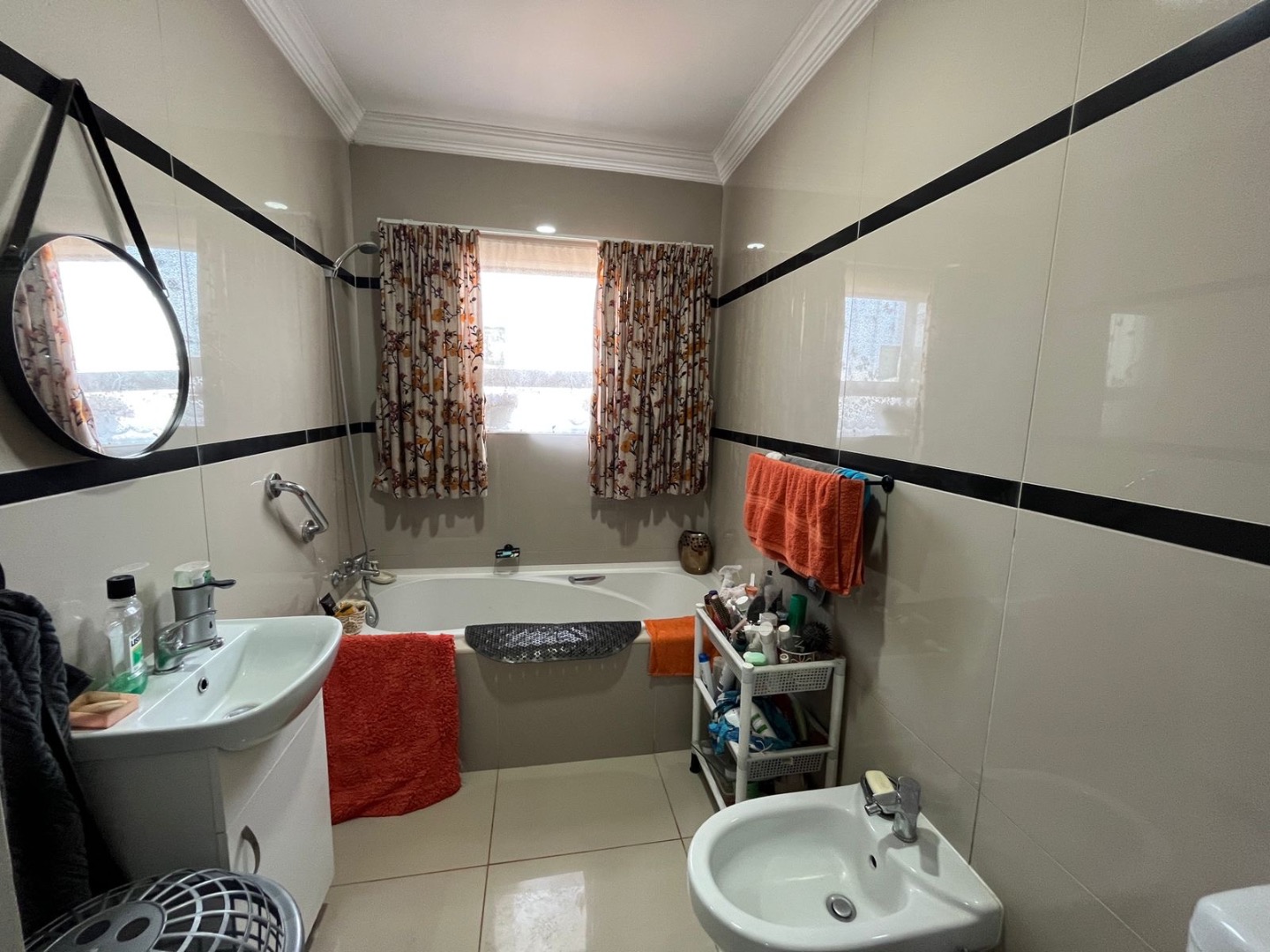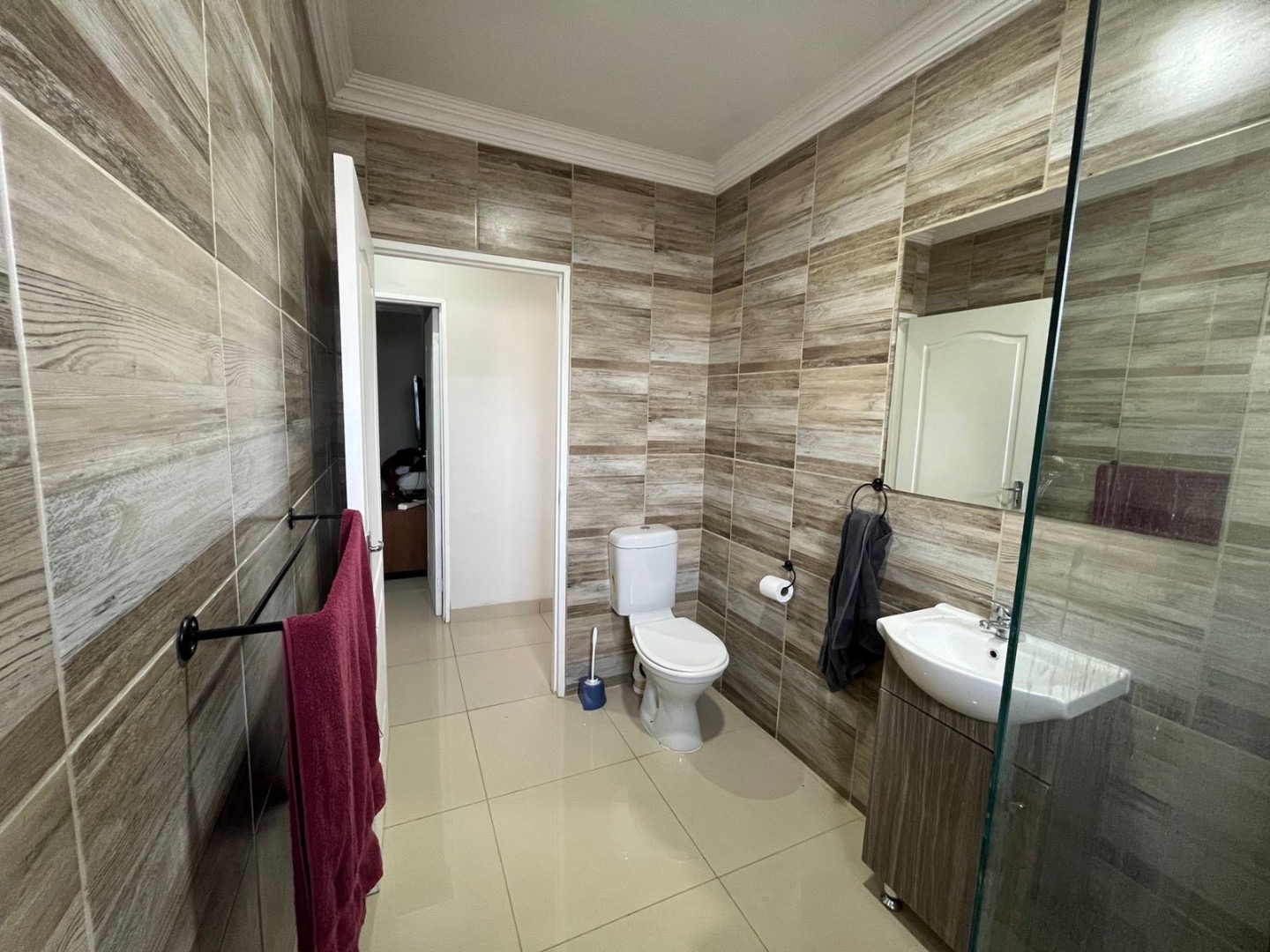 The accommodation comprises four well-proportioned bedrooms, each designed for comfort and tranquility. These private retreats feature durable tiled flooring, ceiling fans for optimal air circulation, and neutral wall colours that provide a versatile canvas for personal décor. Ample storage is provided by built-in wooden wardrobes in at least one of the bedrooms, ensuring an organised living space. The property benefits from two impeccably appointed bathrooms, both configured as ensuites, offering ultimate convenience and privacy. One bathroom showcases modern wood-look wall tiles, light floor tiles, a contemporary vanity, and a glass shower partition. The second bathroom provides a comprehensive suite, including a bathtub with an overhead shower, a vanity sink with storage, and a bidet, all set against clean, modern tiled walls with an elegant accent stripe, further enhanced by crown molding and natural light from two windows.