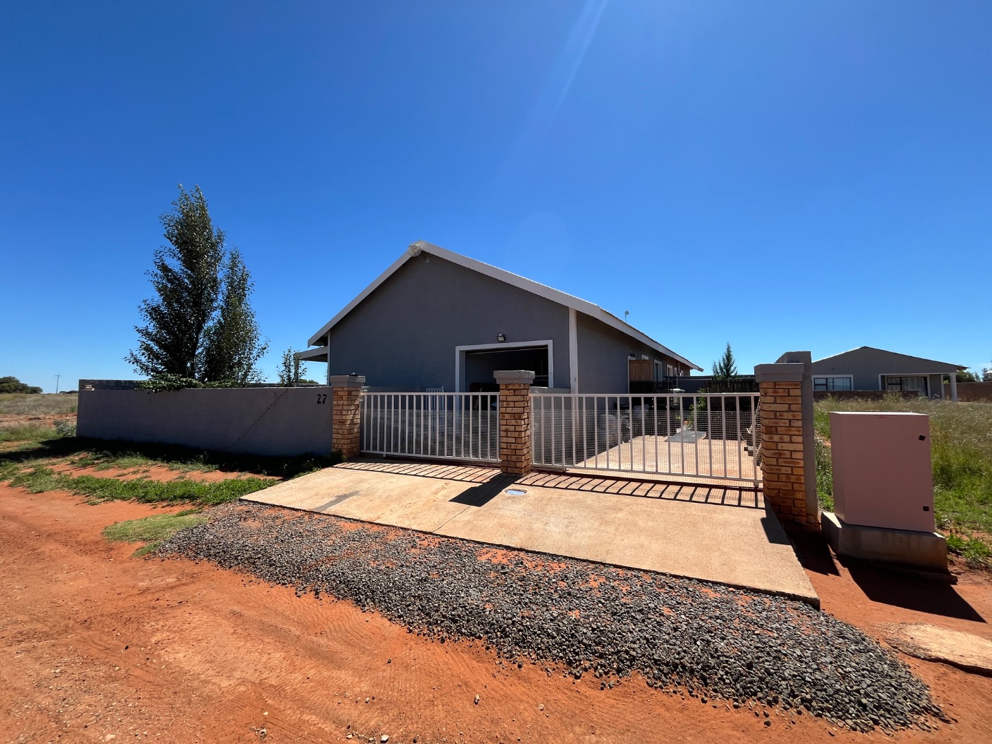 These two distinguished 2-Bedroom residences, situated within the desirable Camelot Estate in Kimberley, present an exceptional opportunity for discerning homeowners. The property immediately impresses with its modern, single-story grey exterior, complemented by a robust gated and walled perimeter that ensures both privacy and enhanced security. A paved entrance area provides convenient off-street parking, leading to a welcoming covered patio, ideal for outdoor relaxation and entertaining, overlooking a neatly maintained small garden.