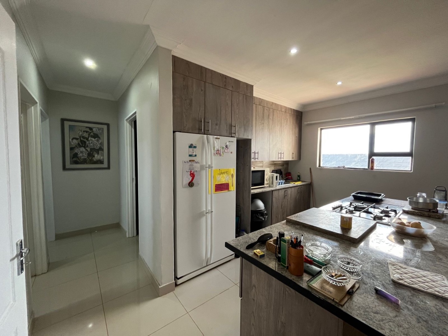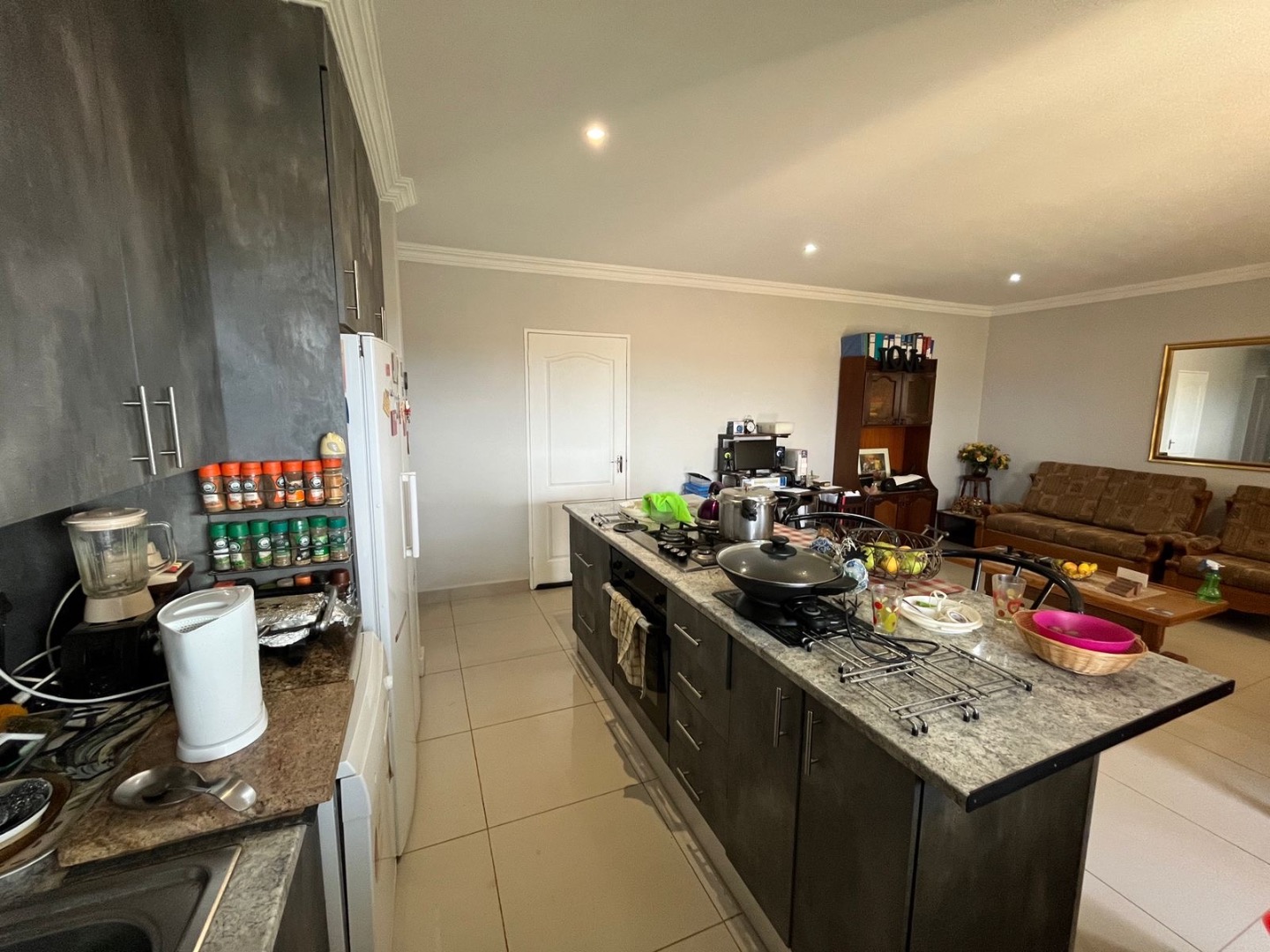 Upon entering, one is greeted by an intelligently designed interior that prioritises both functionality and aesthetic appeal. The residence boasts two distinct, modern kitchens, each featuring contemporary cabinetry—one with elegant wood-grain finishes and and another with sleek grey units. Both kitchens are equipped with spacious islands, one incorporating a gas hob and ample counter space, while the other offers comfortable bar seating, facilitating versatile culinary experiences and social interaction. The open-plan design seamlessly integrates these culinary zones with two expansive lounge areas, creating a fluid and adaptable living environment. Throughout these communal spaces, tiled flooring ensures ease of maintenance, while recessed lighting and sophisticated crown molding add a touch of refined elegance. A dedicated workstation area further enhances the practicality of the living arrangement, catering to contemporary lifestyle needs.