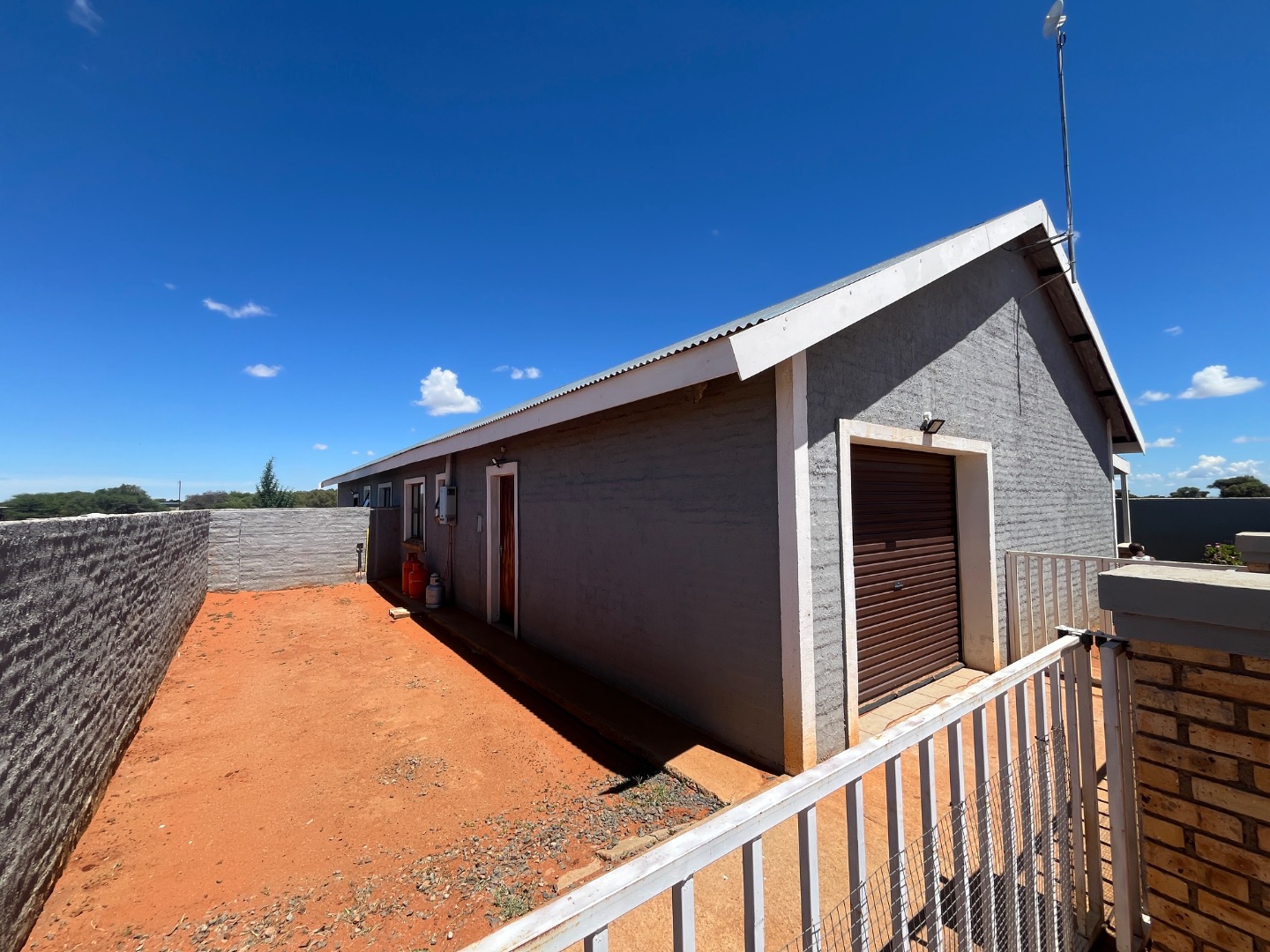 These two distinguished 2-Bedroom residences, situated within the desirable Camelot Estate in Kimberley, present an exceptional opportunity for discerning homeowners. The property immediately impresses with its modern, single-story grey exterior, complemented by a robust gated and walled perimeter that ensures both privacy and enhanced security. A paved entrance area provides convenient off-street parking, leading to a welcoming covered patio, ideal for outdoor relaxation and entertaining, overlooking a neatly maintained small garden.