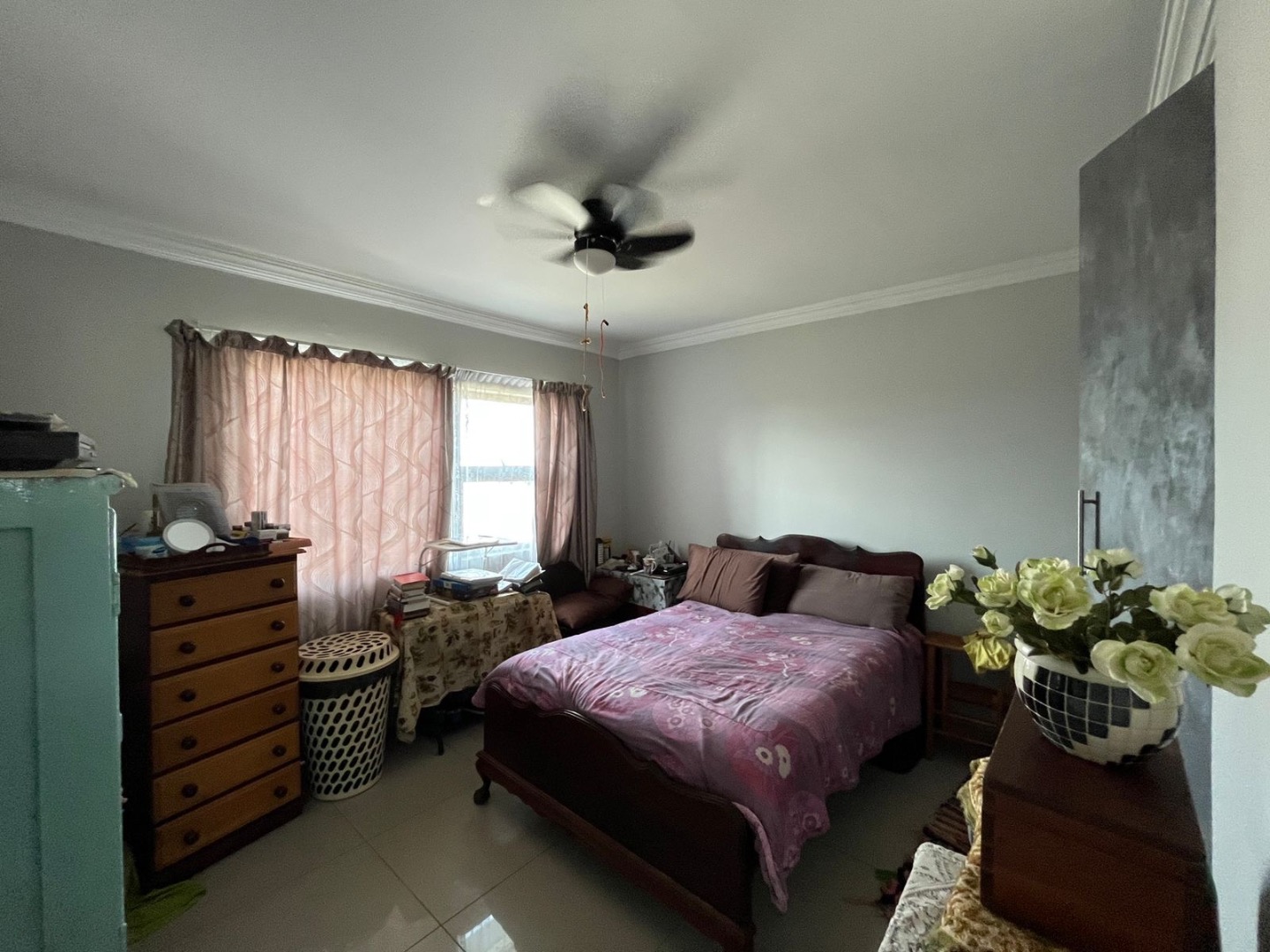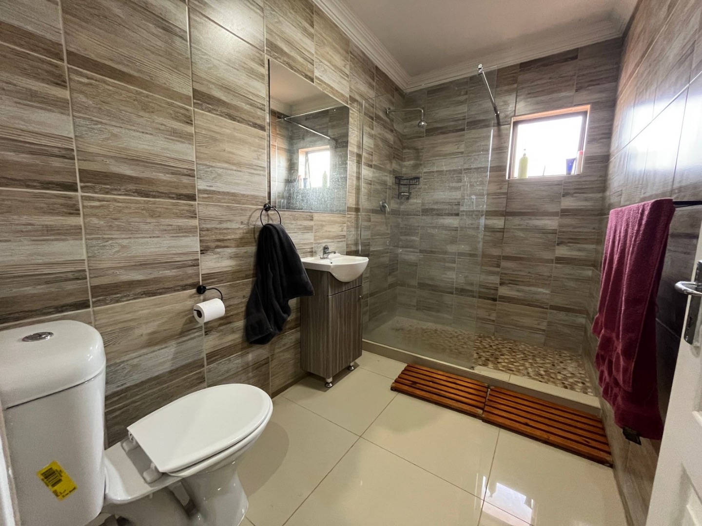 The accommodation comprises four well-proportioned bedrooms, each designed for comfort and tranquility. These private retreats feature durable tiled flooring, ceiling fans for optimal air circulation, and neutral wall colours that provide a versatile canvas for personal décor. Ample storage is provided by built-in wooden wardrobes in at least one of the bedrooms, ensuring an organised living space. The property benefits from two impeccably appointed bathrooms, both configured as ensuites, offering ultimate convenience and privacy. One bathroom showcases modern wood-look wall tiles, light floor tiles, a contemporary vanity, and a glass shower partition. The second bathroom provides a comprehensive suite, including a bathtub with an overhead shower, a vanity sink with storage, and a bidet, all set against clean, modern tiled walls with an elegant accent stripe, further enhanced by crown molding and natural light from two windows.