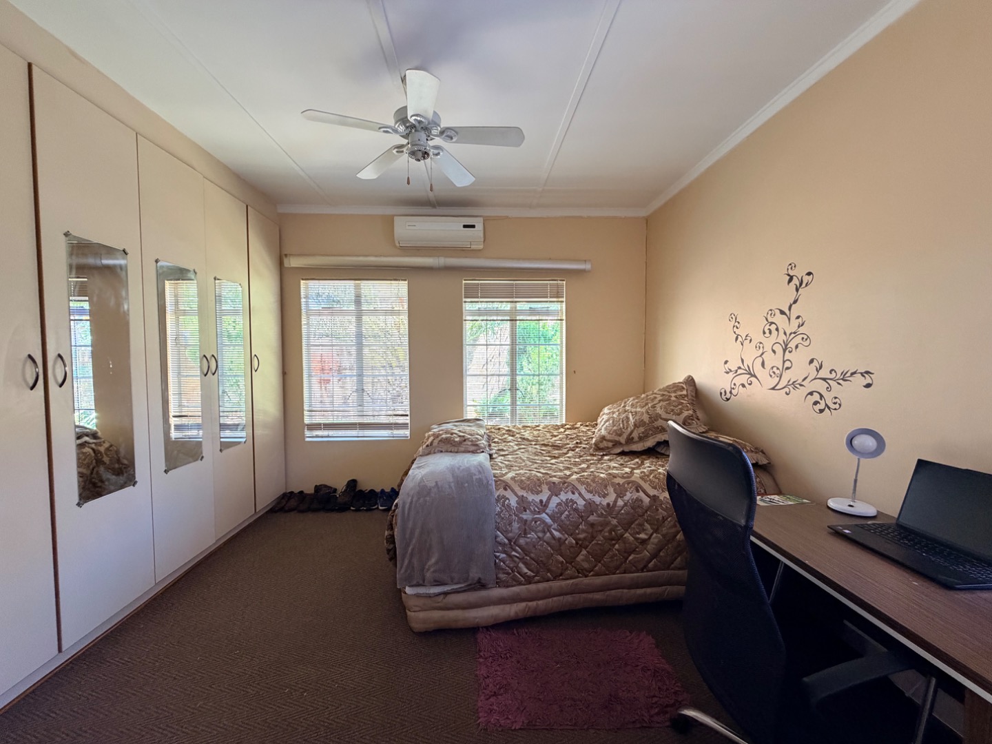 Accommodation includes three well-sized bedrooms, each with ceiling fans, built-in cupboards, and plenty of natural light. The main bedroom offers a full en-suite bathroom with bath, shower, and toilet, while a second bathroom with shower and toilet serves the remaining bedrooms.