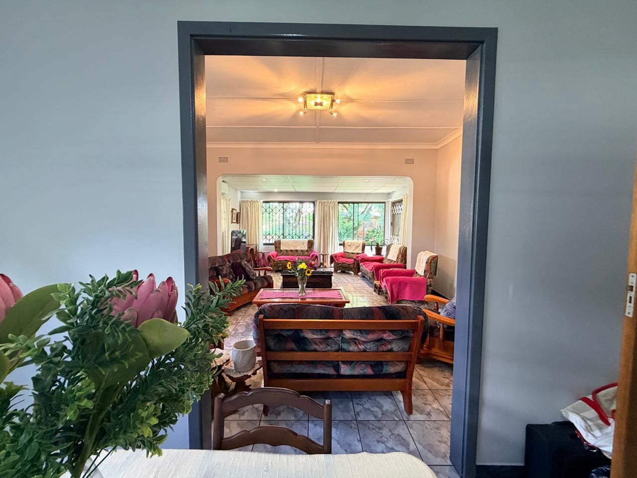 Inside, the home boasts a welcoming lounge and family TV room, providing a living area with large sliding windows to the garden for relaxation and entertaining. The layout offers a comfortable flow throughout the home while maintaining a warm and homely atmosphere.