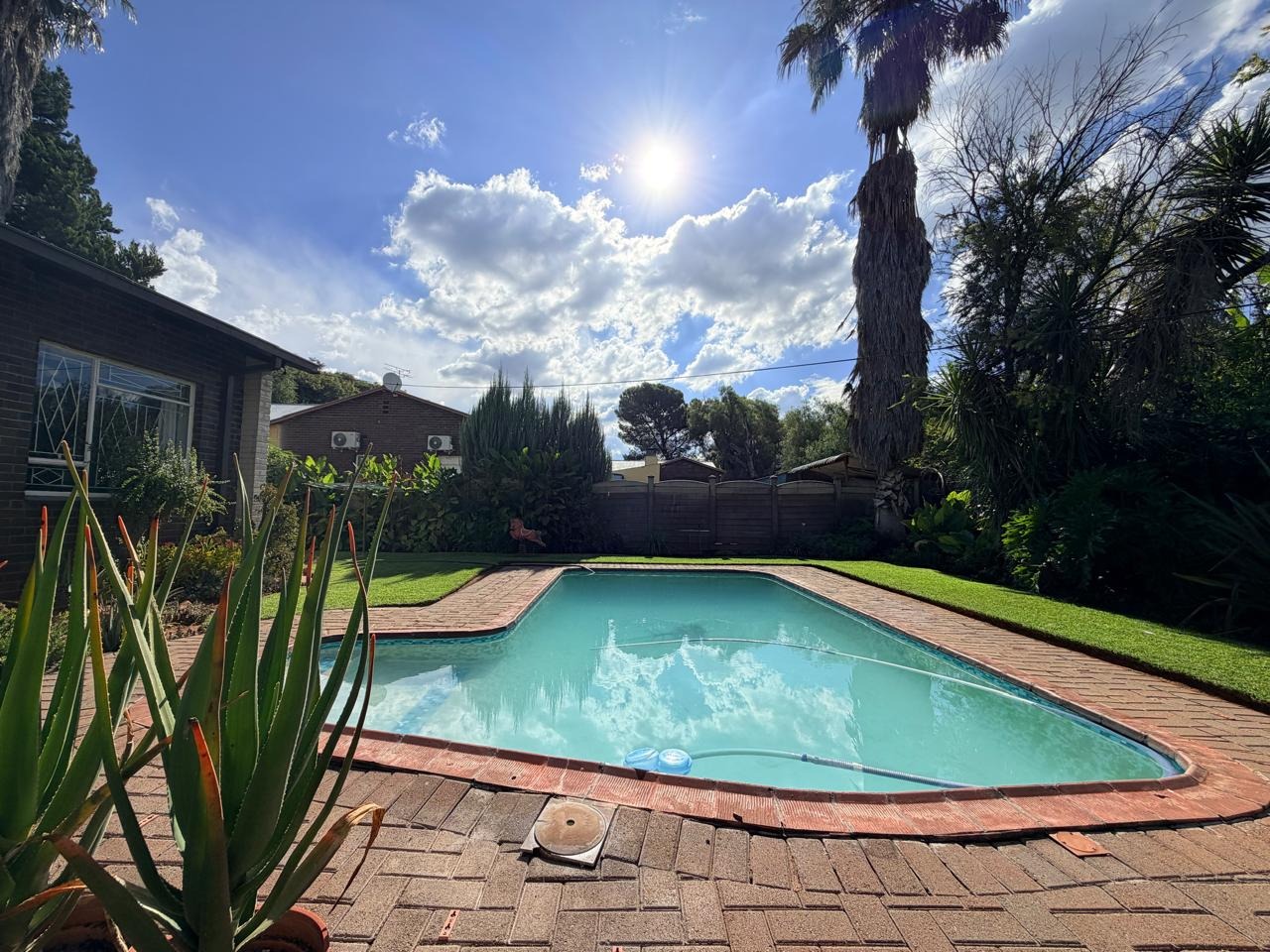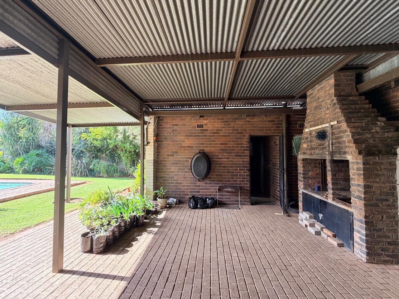 Step outside to a lush, well-maintained garden complemented by a borehole, ensuring a reliable water supply to keep the garden green year-round. The outdoor area is perfect for family gatherings and summer days, with a sparkling swimming pool adding to the appeal.