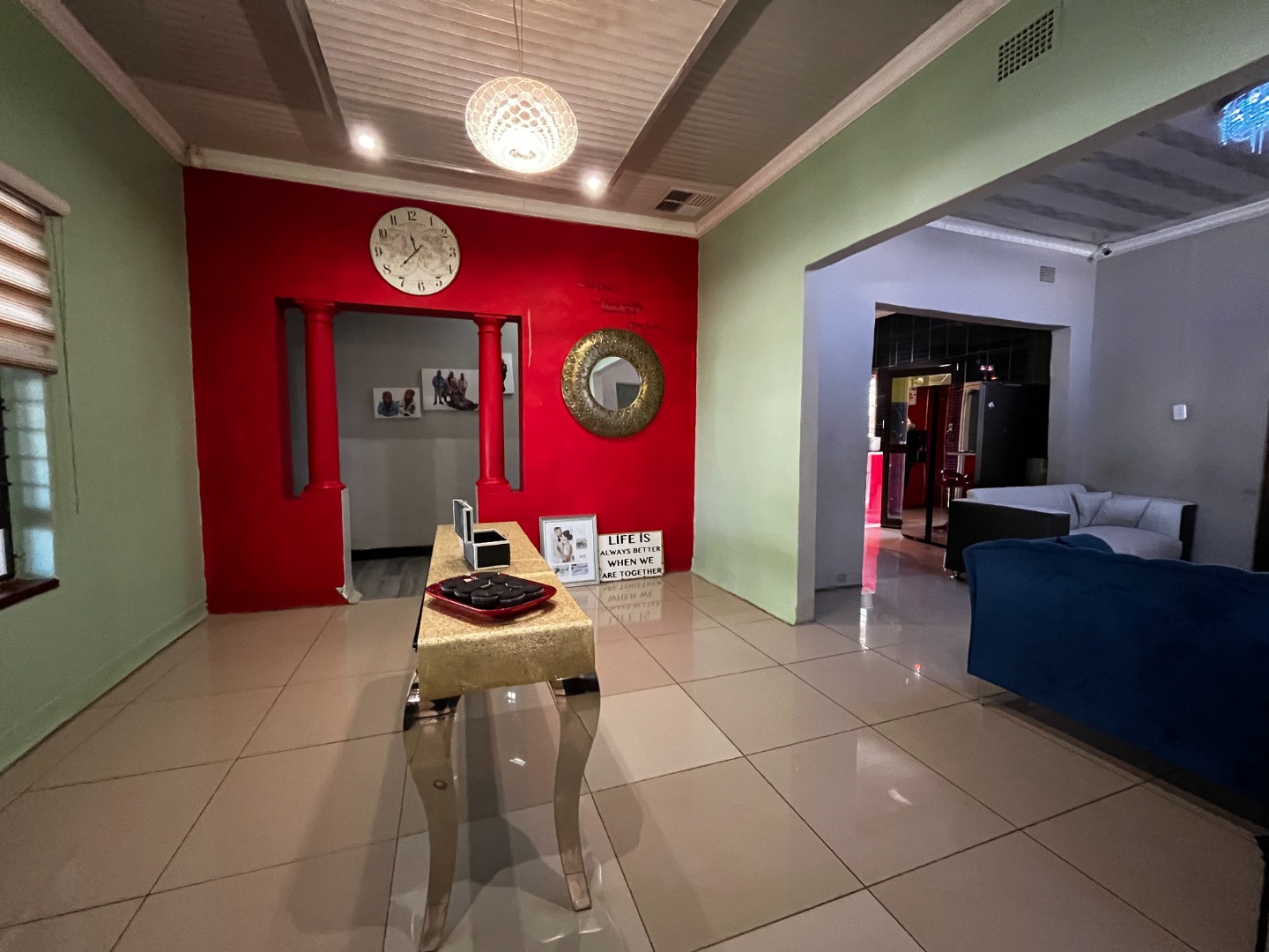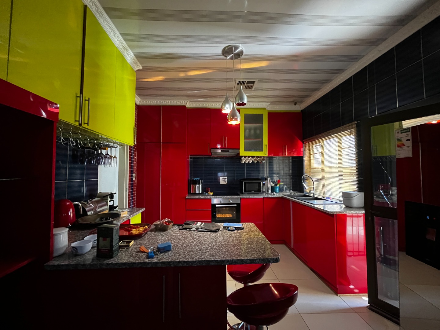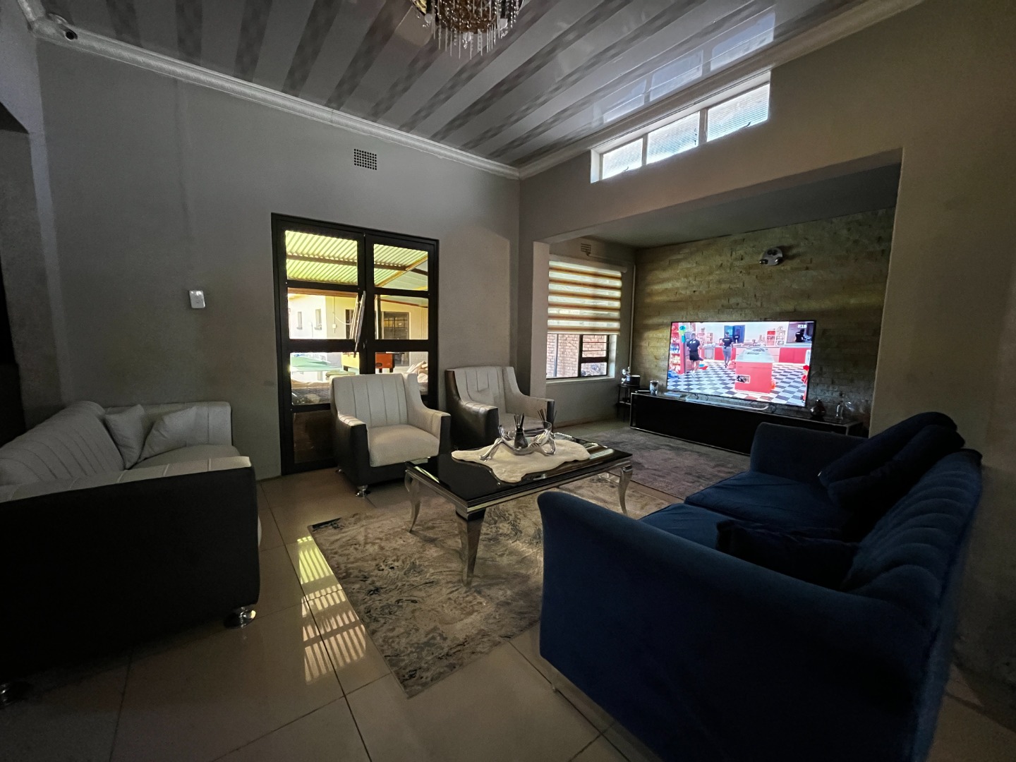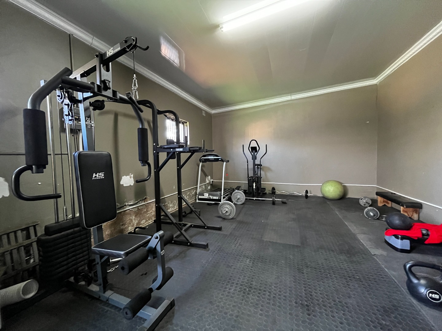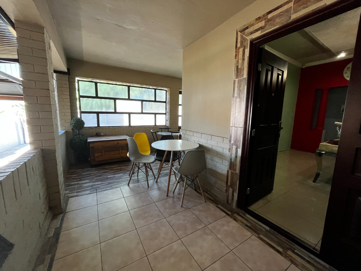 Step outside to a swimming pool with a built-in braai, creating the perfect space for gatherings with family and friends. The neat garden is complemented by a JoJo tank, ensuring a reliable water supply, while the secure garage with electric doors adds to the home’s practicality. Staff accommodation and a storeroom provide additional convenience.