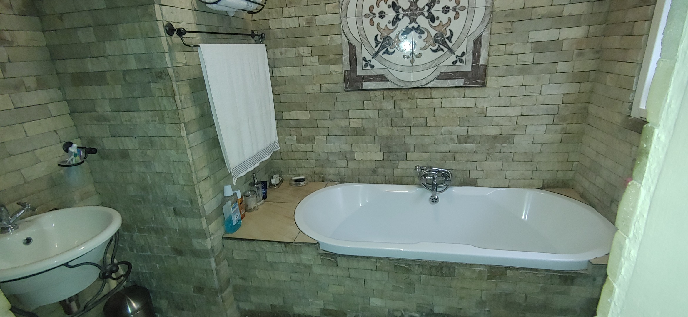 The three comfortable bedrooms offer private retreats, with two featuring en-suite bathrooms for added convenience and privacy. Ample storage is provided by built-in wardrobes, ensuring a clutter-free living environment. The bathrooms are well-appointed, featuring tiled finishes, pedestal sinks, and a built-in bathtub in one, alongside a modern sliding barn door adding a touch of contemporary style.