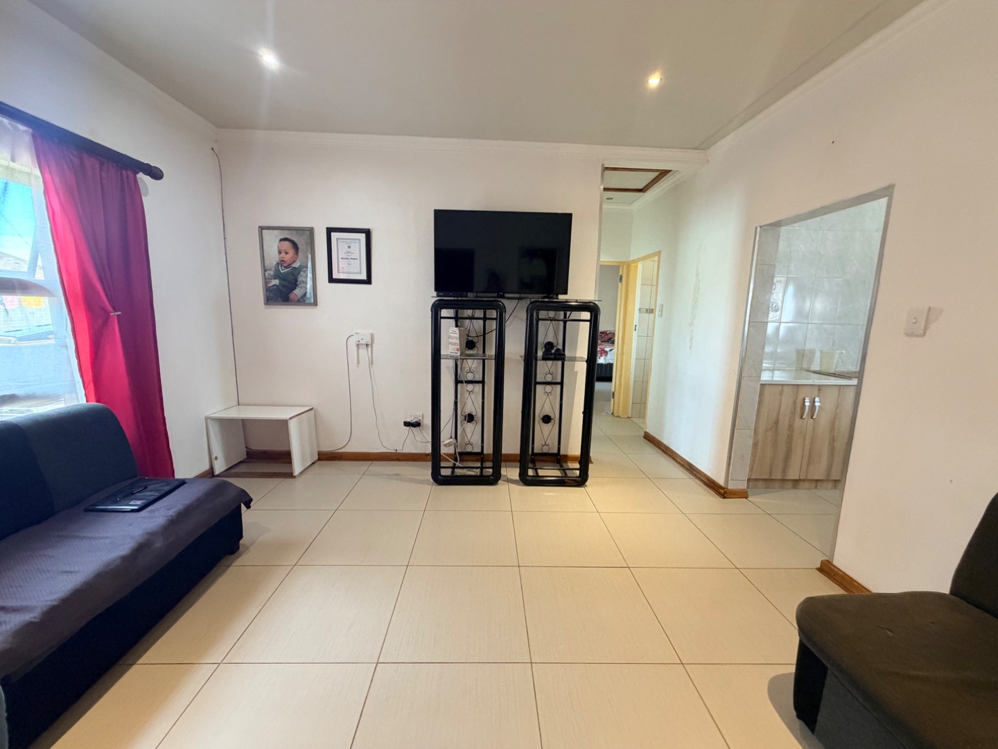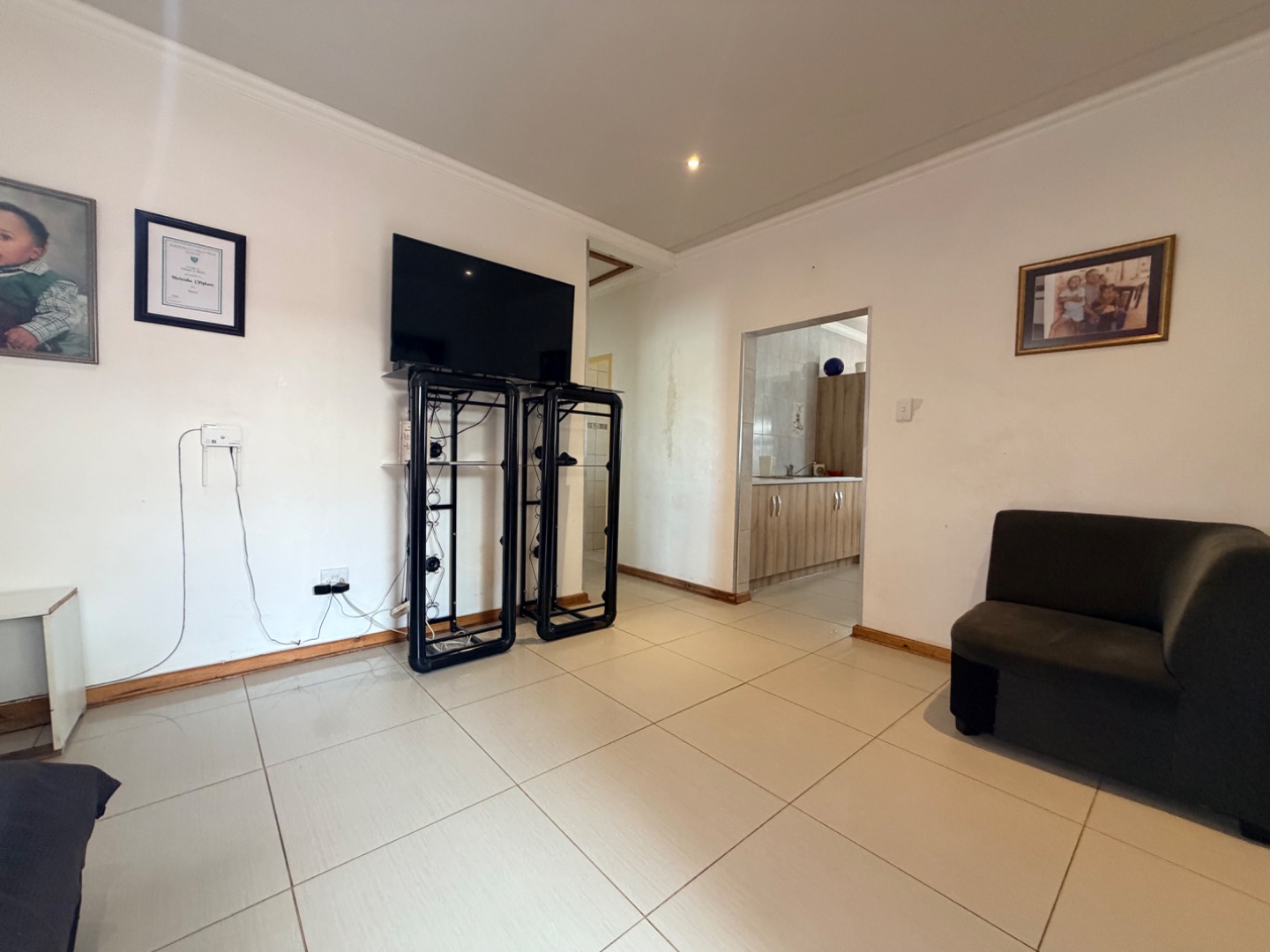 A passage off the living area leads to two well-proportioned bedrooms and two bathrooms, offering convenient accommodation. From the lounge, doors open to the rear of the property where a corrugated flatlet or storeroom provides valuable additional space. The backyard is well sized and features established fruit trees, adding character and usability.