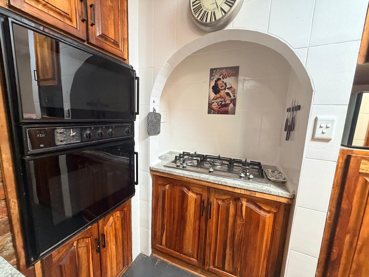 The entrance leads into a welcoming hallway, with the lounge and dining room set elegantly to the side, defined by charming arches and sliding doors that flow into a well-appointed, oversized kitchen. Here, the chef enjoys abundant marble-top prep space, ample wooden cabinetry, a gas stove, oven and food warmer, with tiled floors and ceiling fans positioned throughout for cool comfort.