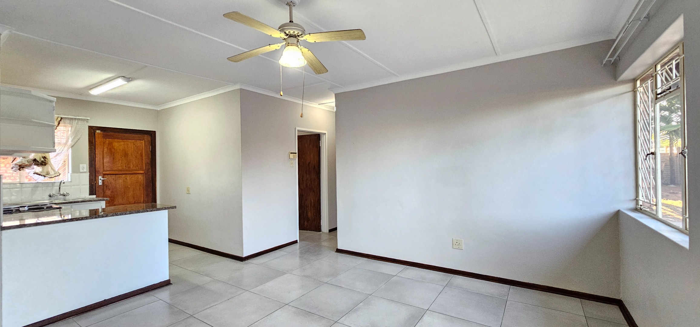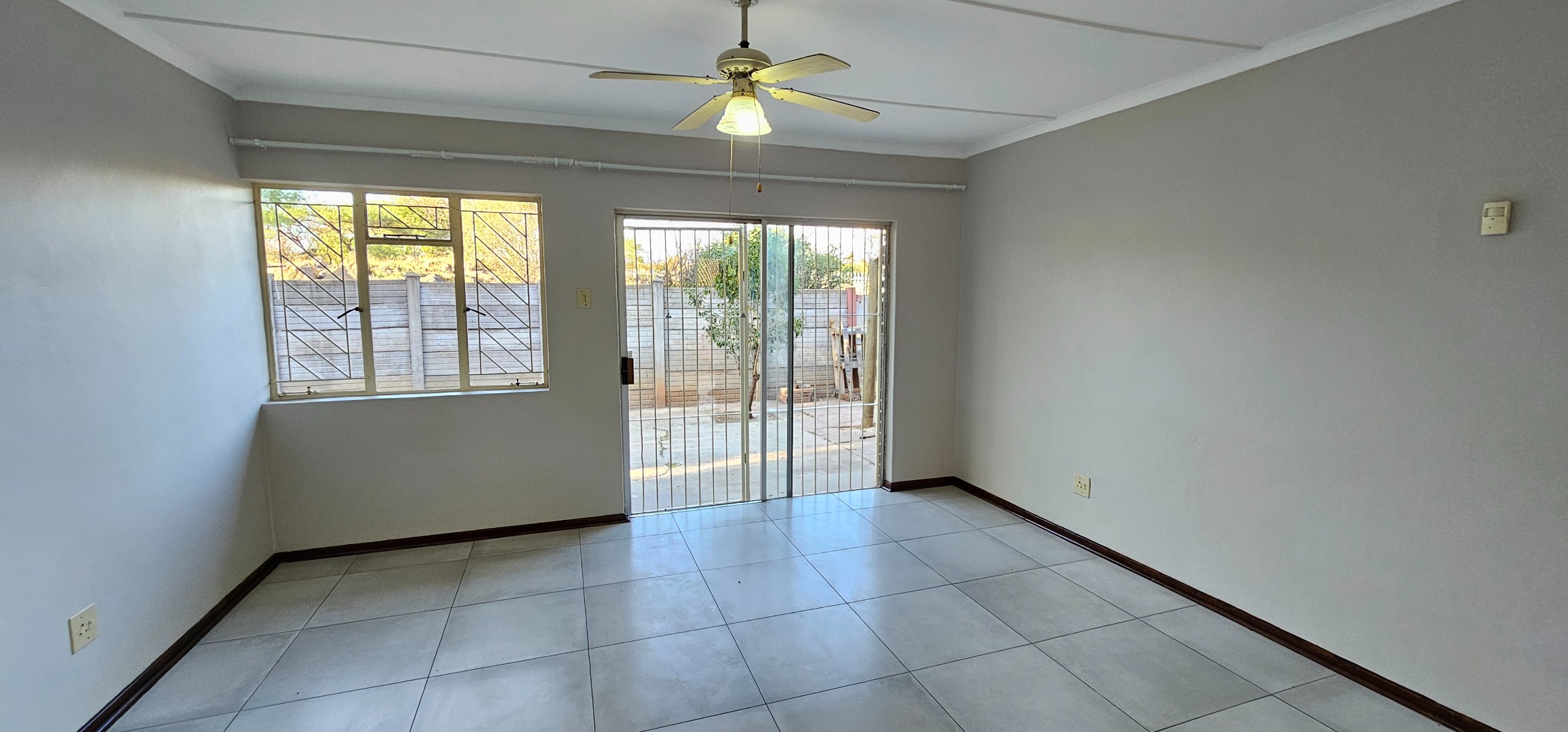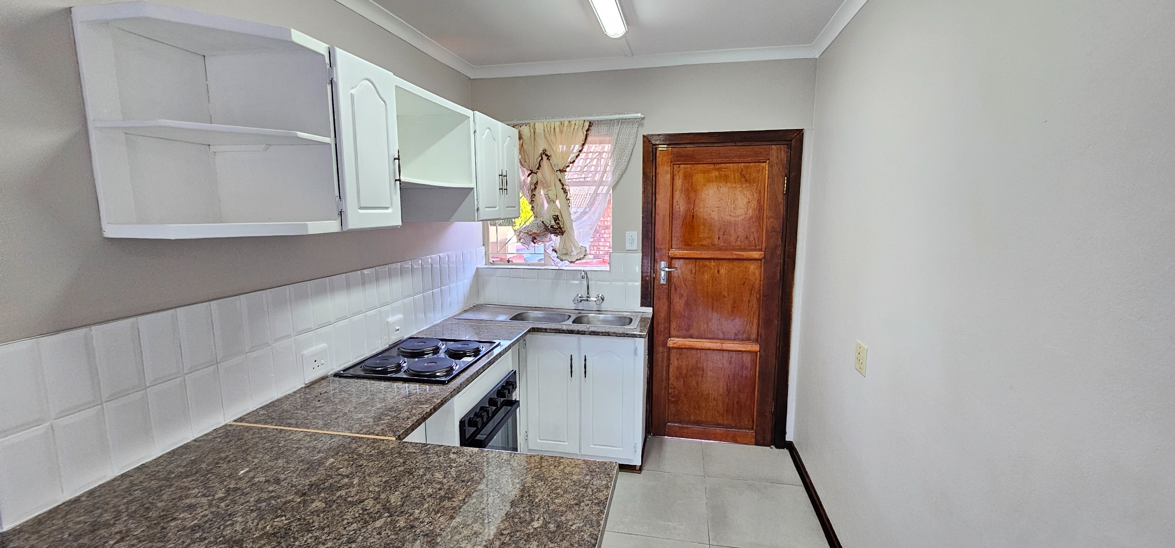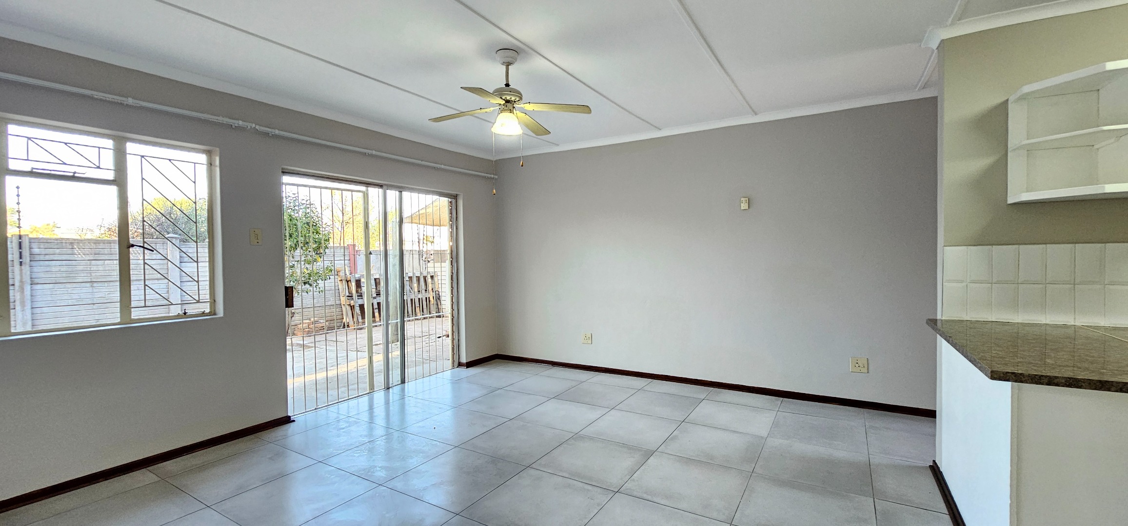 Open plan kitchen and living area. Kitchen with build in cupboards and stove. Lounge sliding door walking out on pet friendly garden. Bedrooms with tiled flooring and build in cupboards. 1 Bathroom. Single garage and single carport and open parking in front of carport and garage.