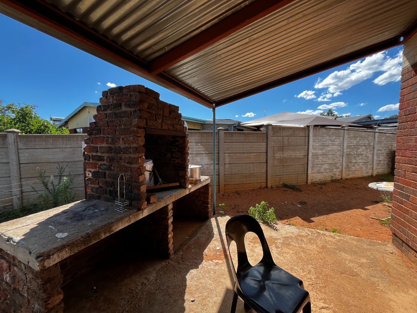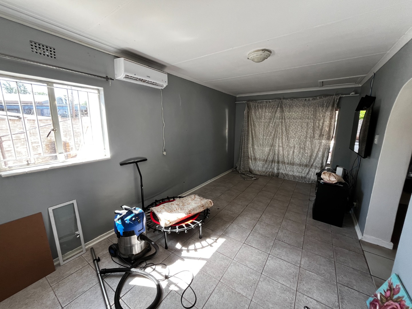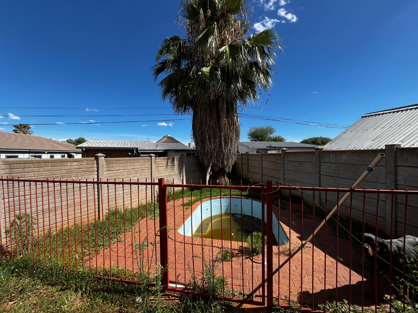 Outside, the property has a refreshing swimming pool, perfect for relaxation and entertaining. The large paved areas around the home ensure low maintenance, while the single garage and two additional parking spaces cater to all your vehicle needs. Security is enhanced with burglar bars on windows, offering peace of mind for residents.