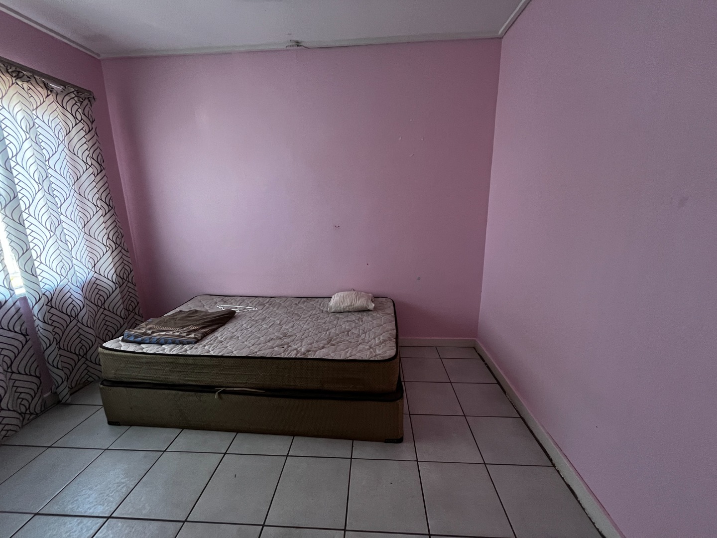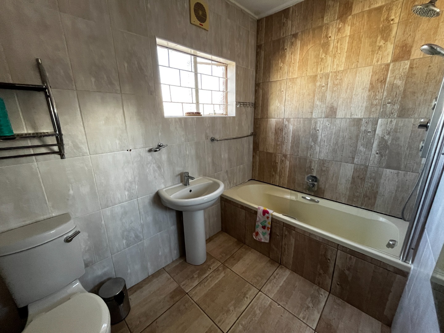 The home comprises three well-proportioned bedrooms, each featuring durable tiled flooring and offering a comfortable retreat. Two bedrooms benefit from air conditioning units, ensuring climate control. The main bathroom is fully tiled and there is a combination bathtub and shower, a pedestal sink, and a toilet, providing essential amenities.