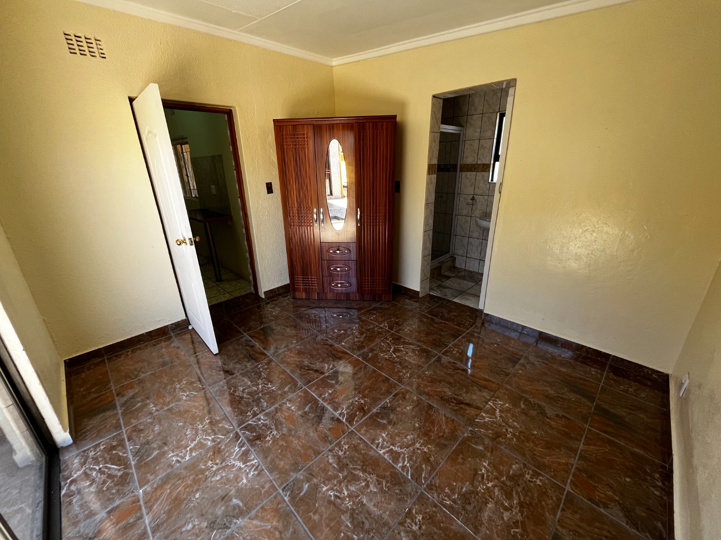 This neat bachelor unit offers an open-plan layout with a well-sized kitchen, bedroom area, and an en-suite bathroom fitted with a shower, toilet, and basin.