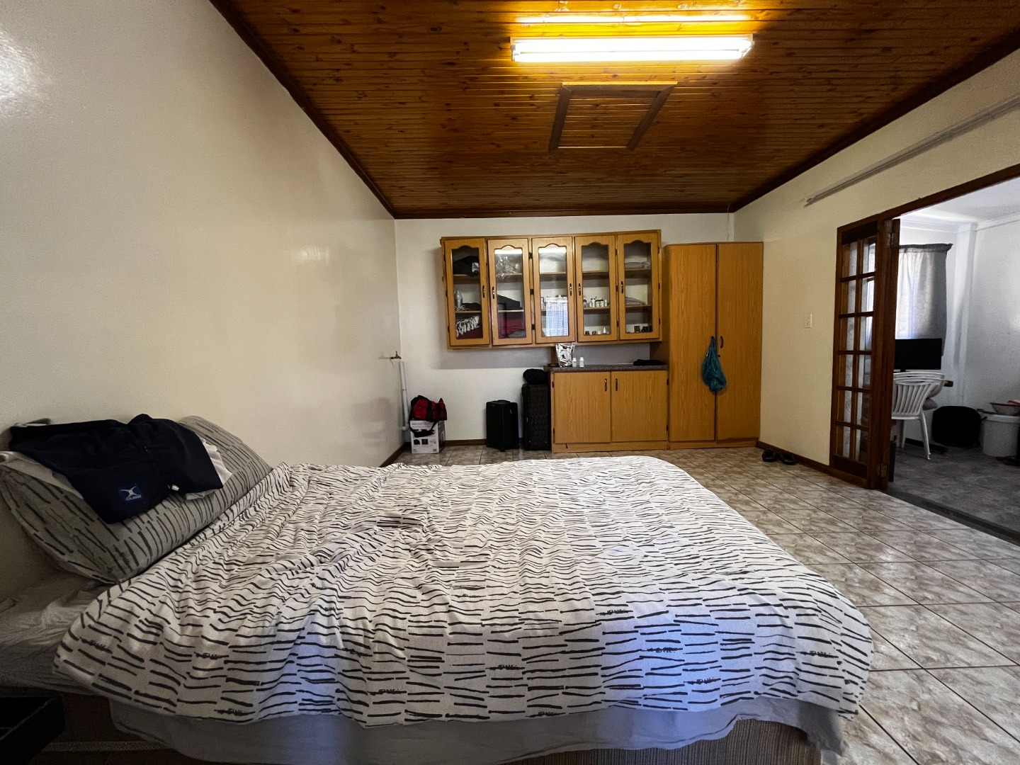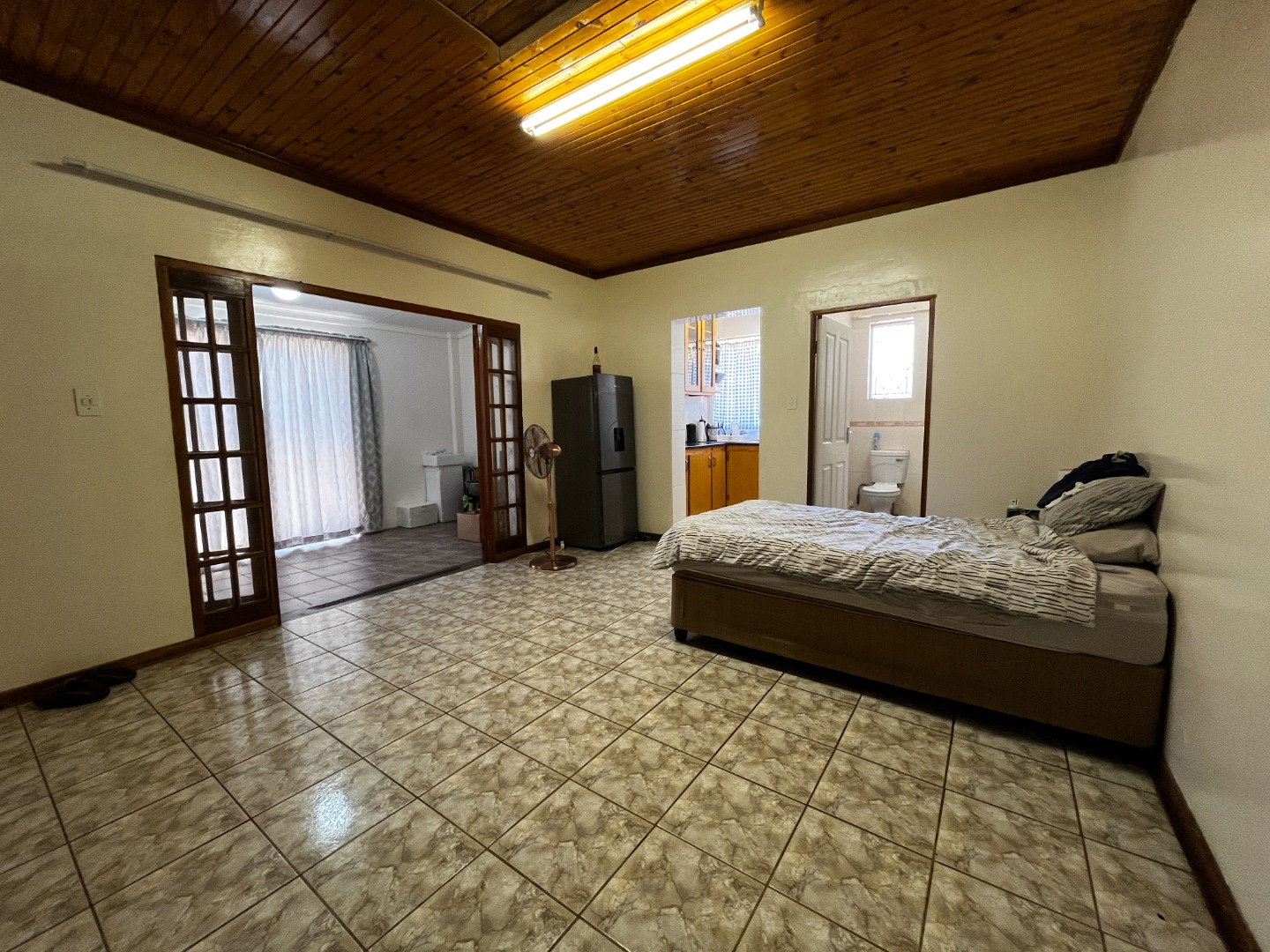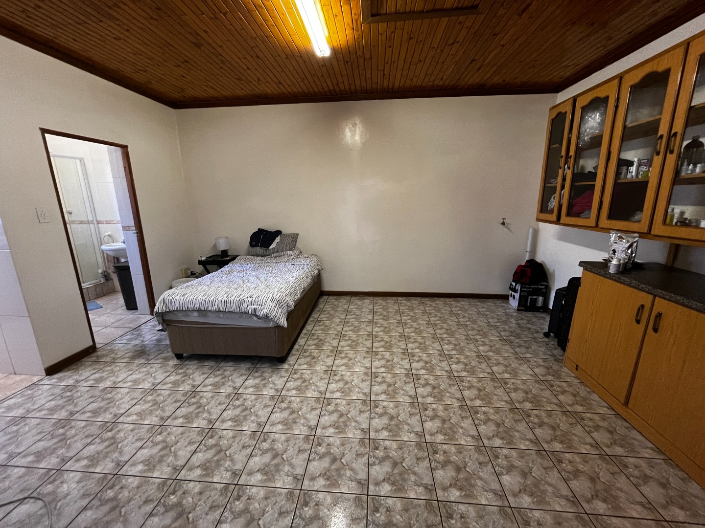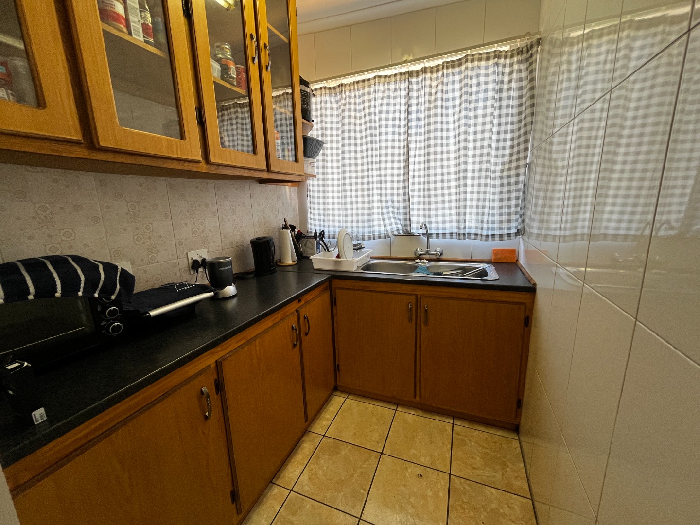 This compact 1-bedroom, 1-bathroom studio apartment offers a functional living space designed for convenience. The interior features durable tiled flooring throughout, complemented by unique wooden paneled ceilings that add character and warmth. The layout includes a comfortable lounge area and a practical kitchen equipped with built-in wooden cabinetry, providing essential storage solutions. The en-suite bathroom is fully tiled and includes a corner glass shower, ensuring a private and efficient space.
