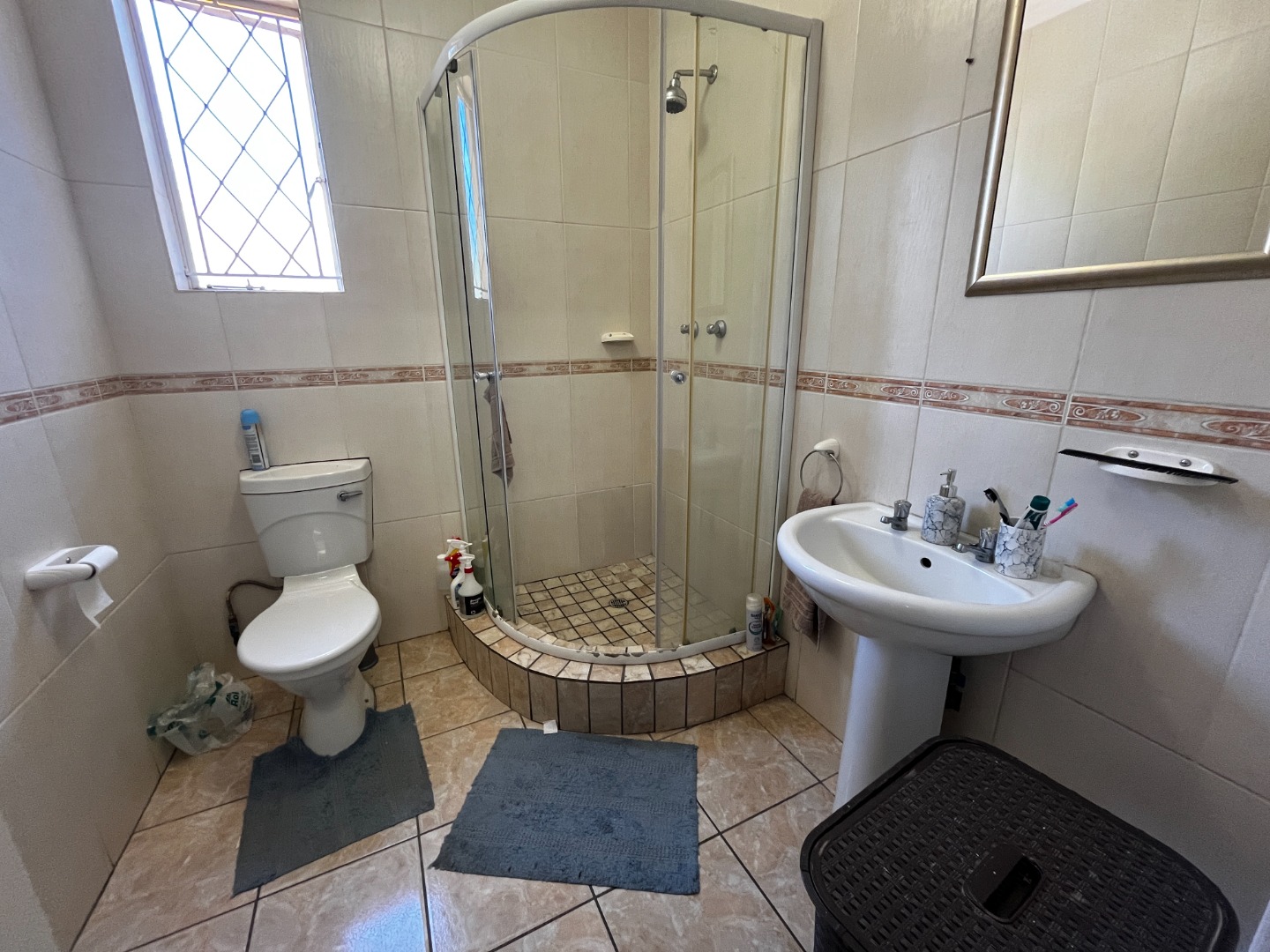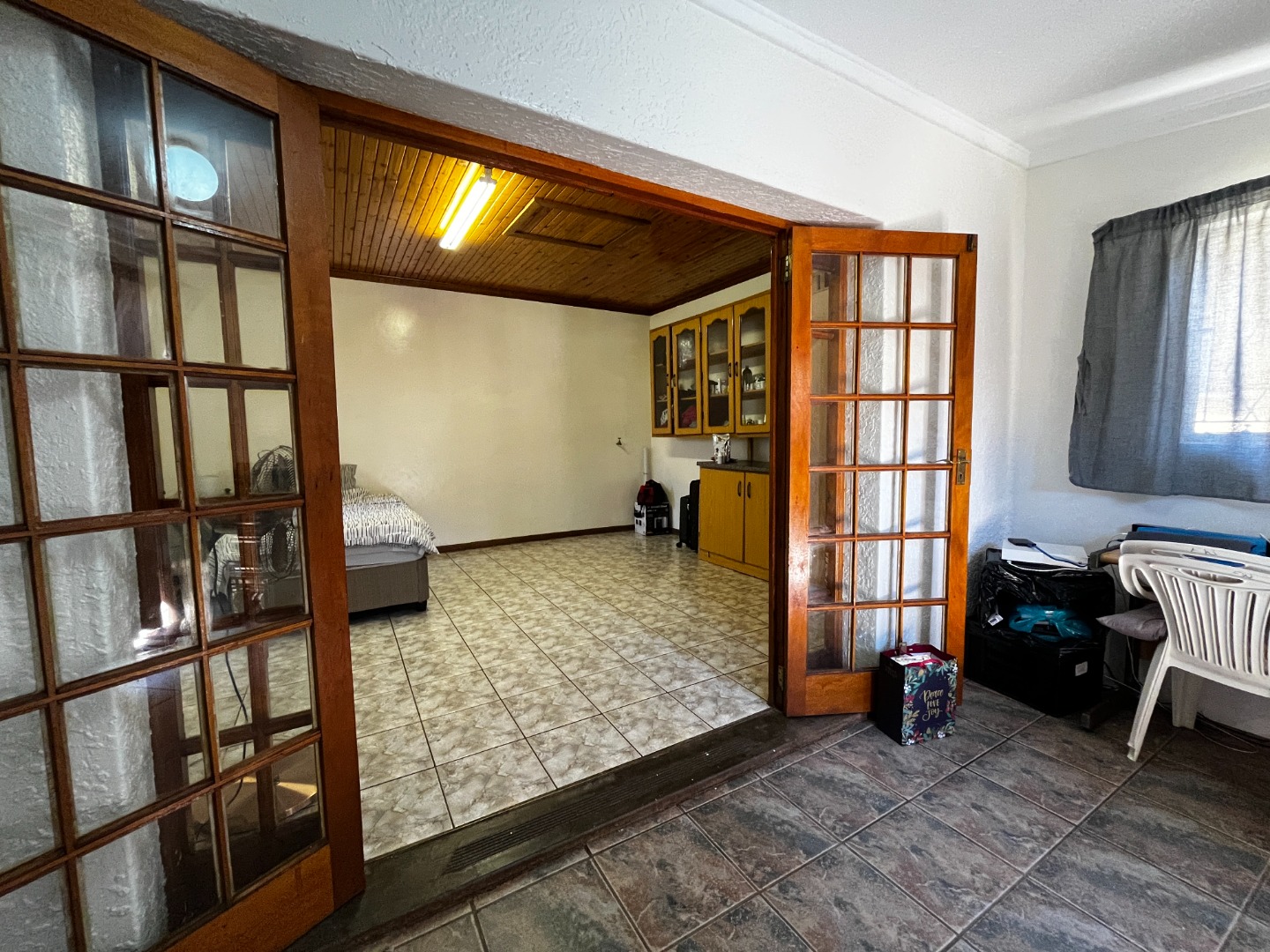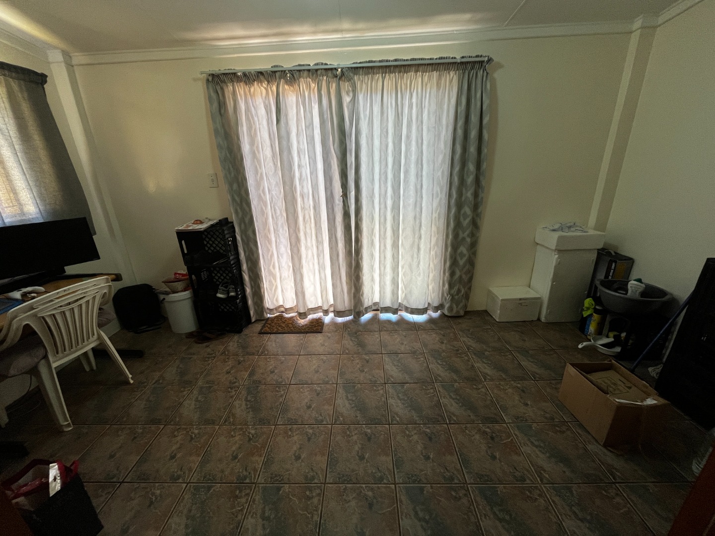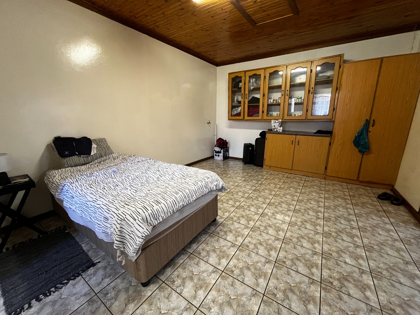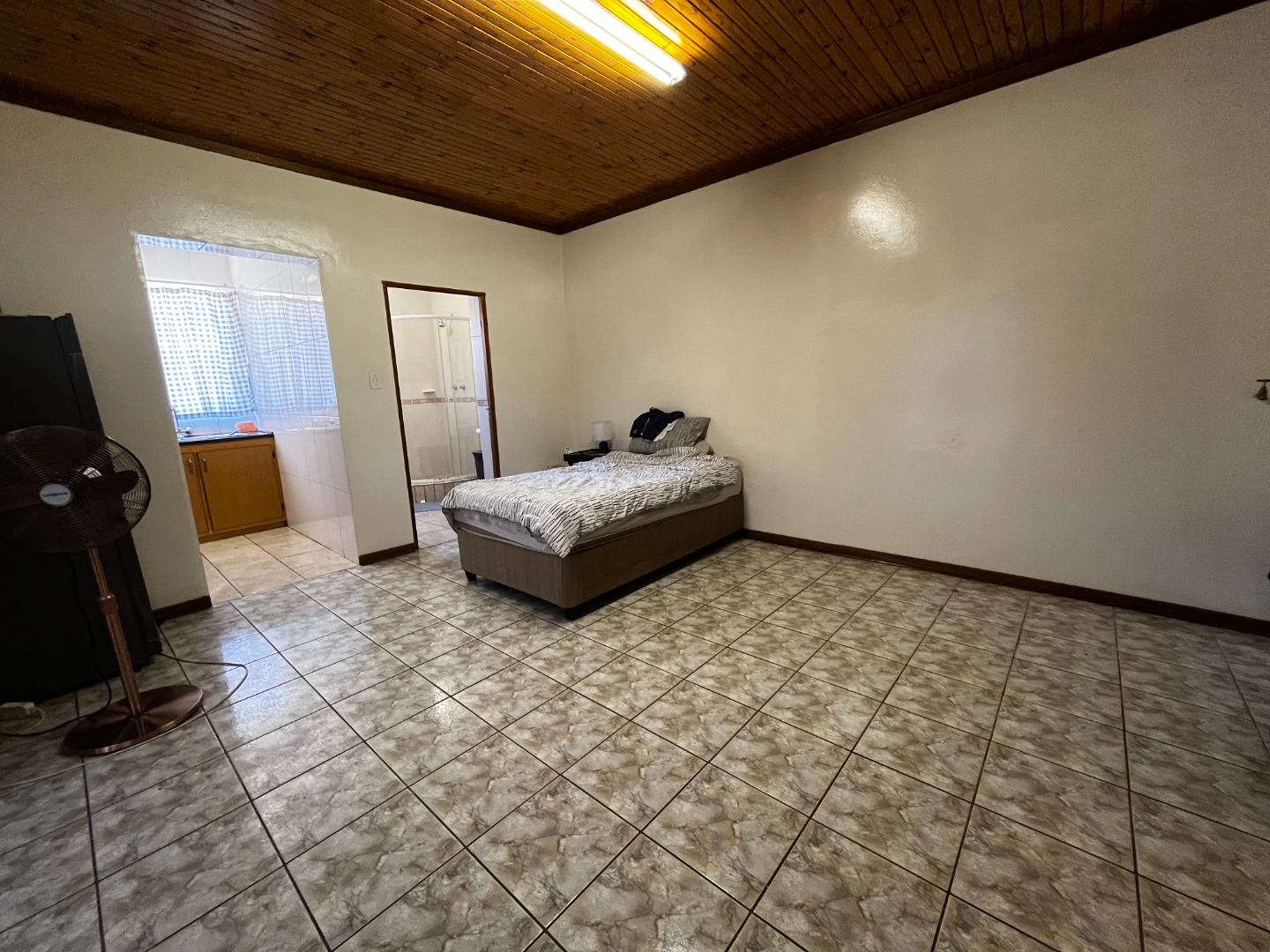 This compact 1-bedroom, 1-bathroom studio apartment offers a functional living space designed for convenience. The interior features durable tiled flooring throughout, complemented by unique wooden paneled ceilings that add character and warmth. The layout includes a comfortable lounge area and a practical kitchen equipped with built-in wooden cabinetry, providing essential storage solutions. The en-suite bathroom is fully tiled and includes a corner glass shower, ensuring a private and efficient space.