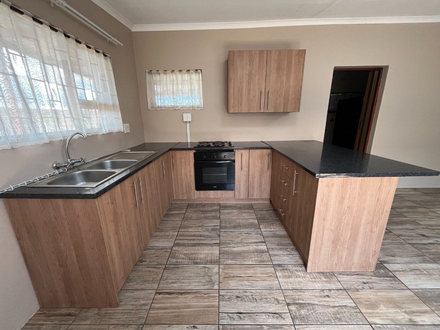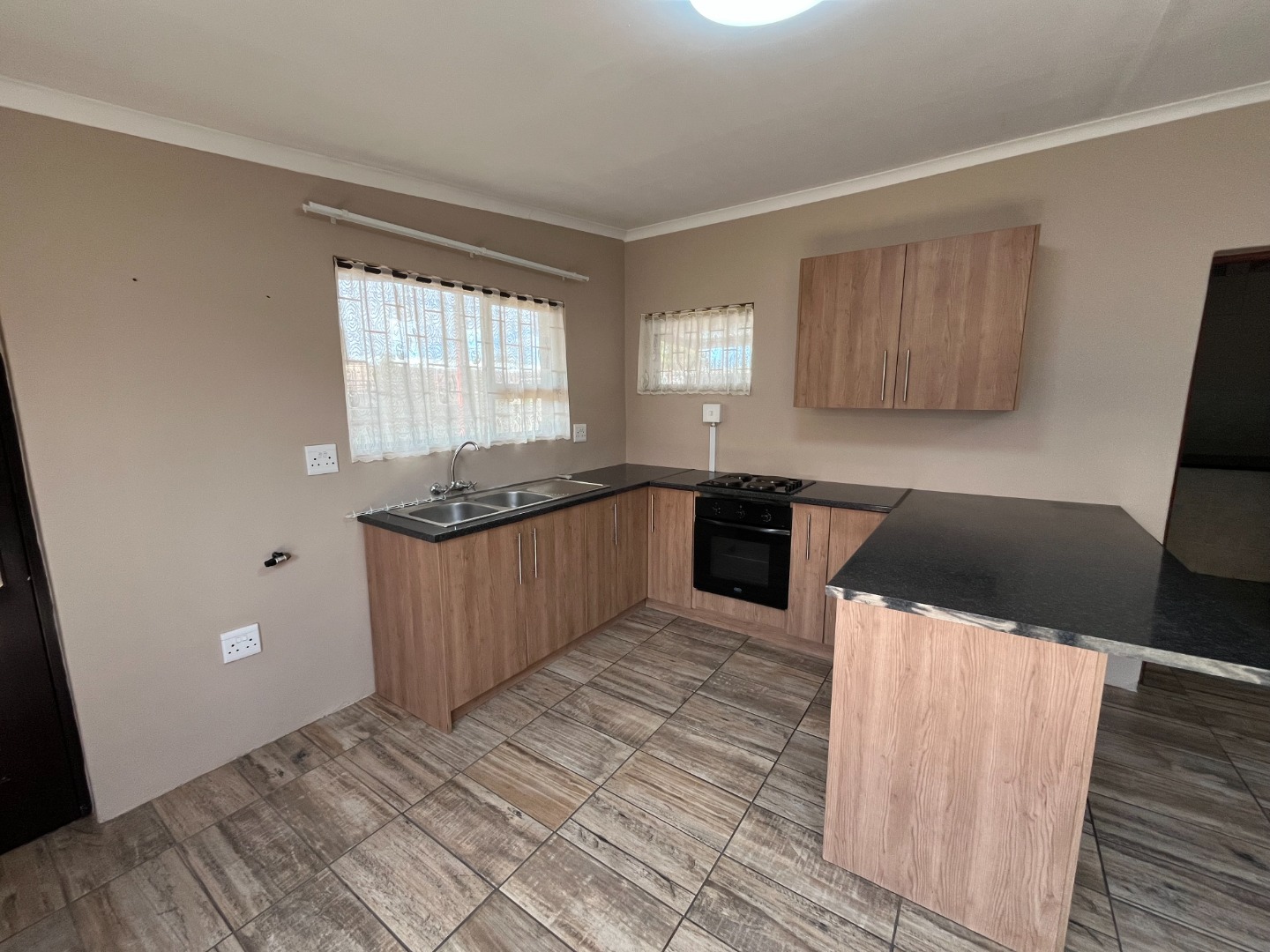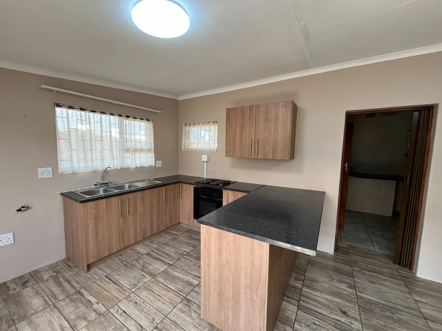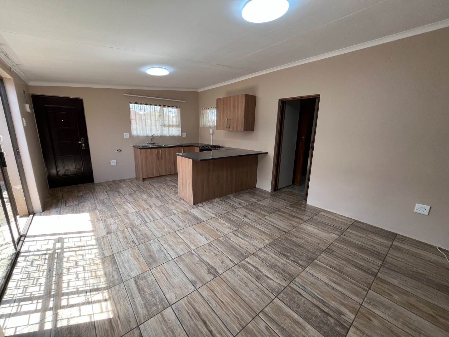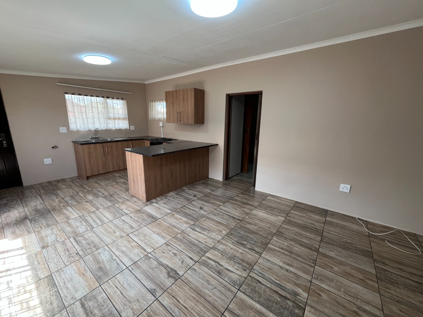 Modern kitchen with open plan living area.