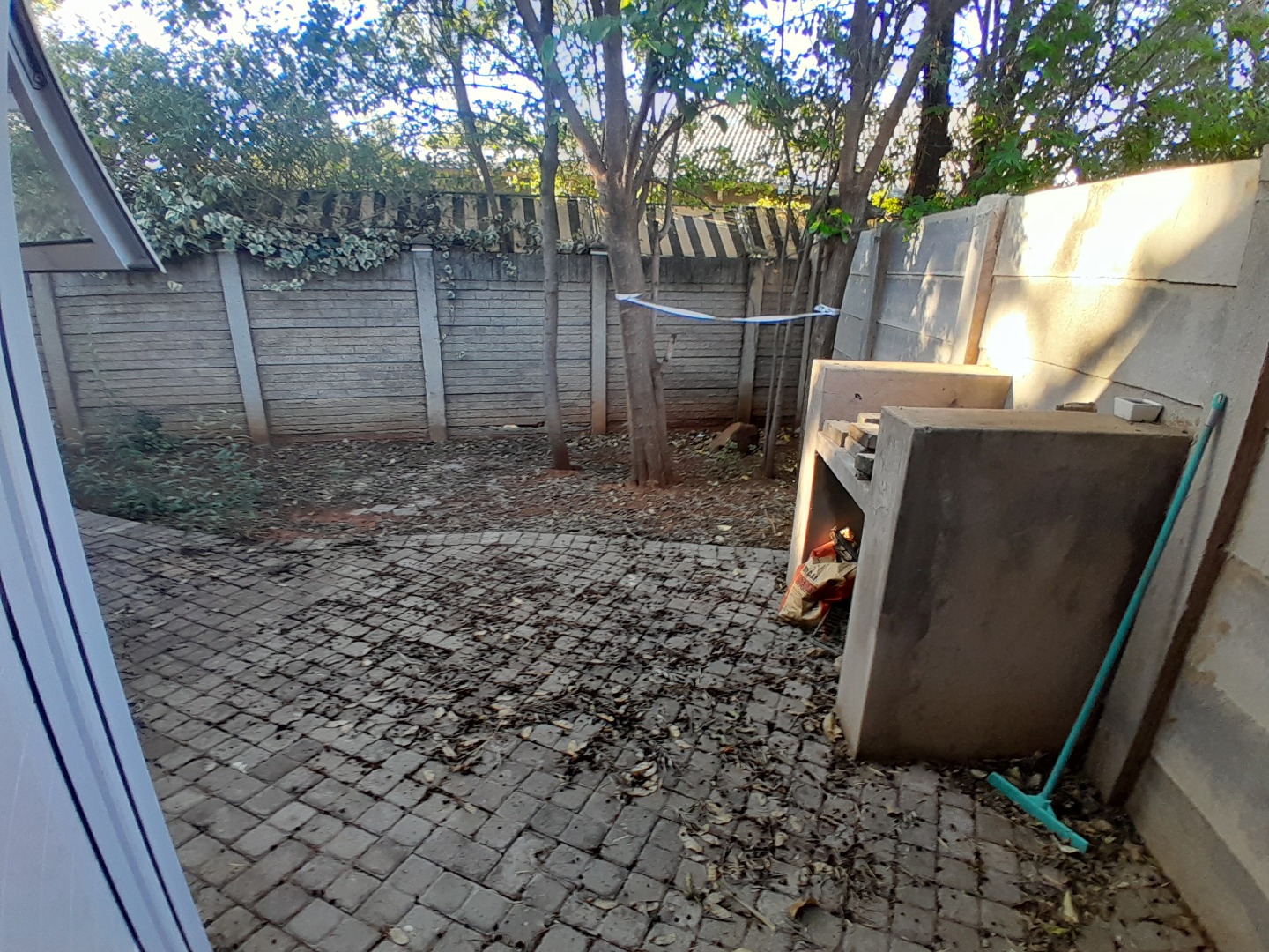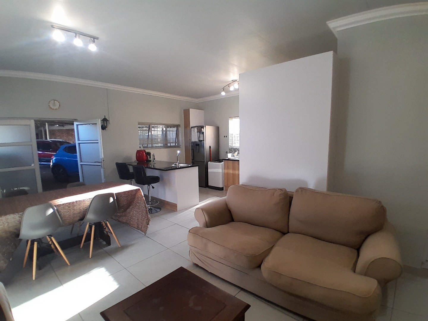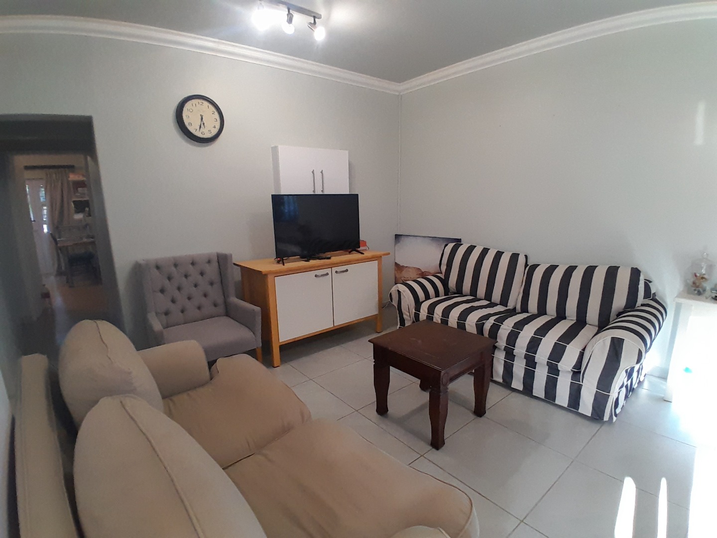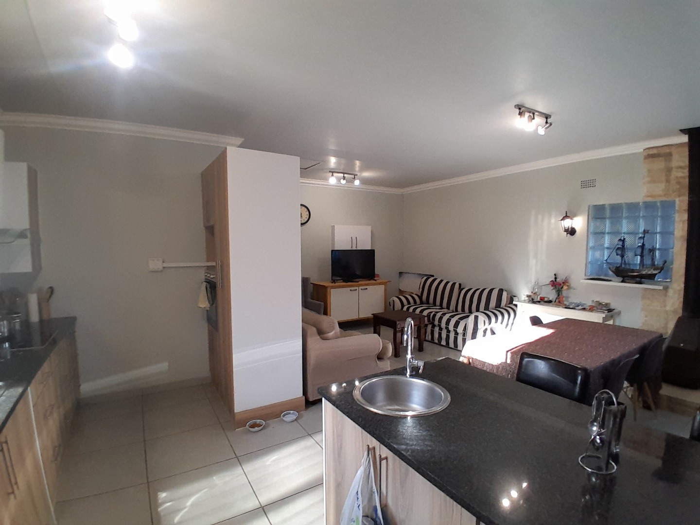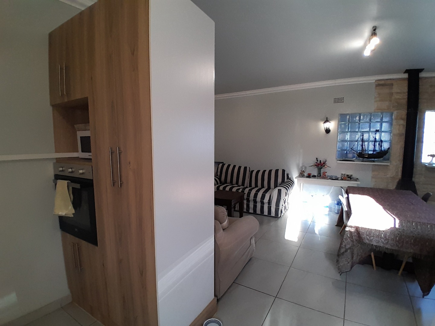 The modern open plan kitchen and lounge welcomes you into the property. The kitchen is equipped with a stove, microwave, fridge and washing machine. Cupboard space is not a problem. Air con.