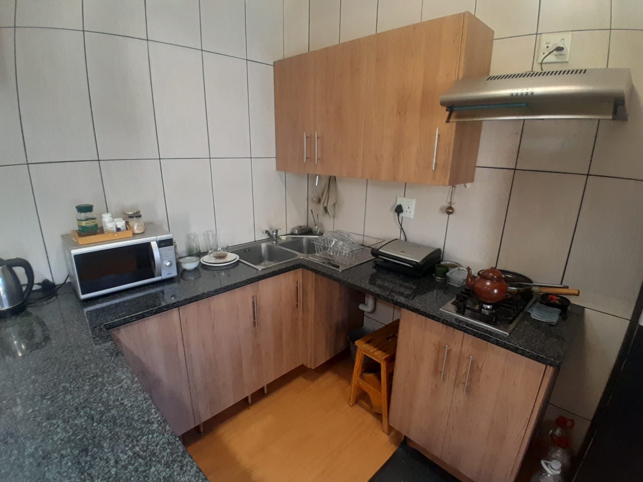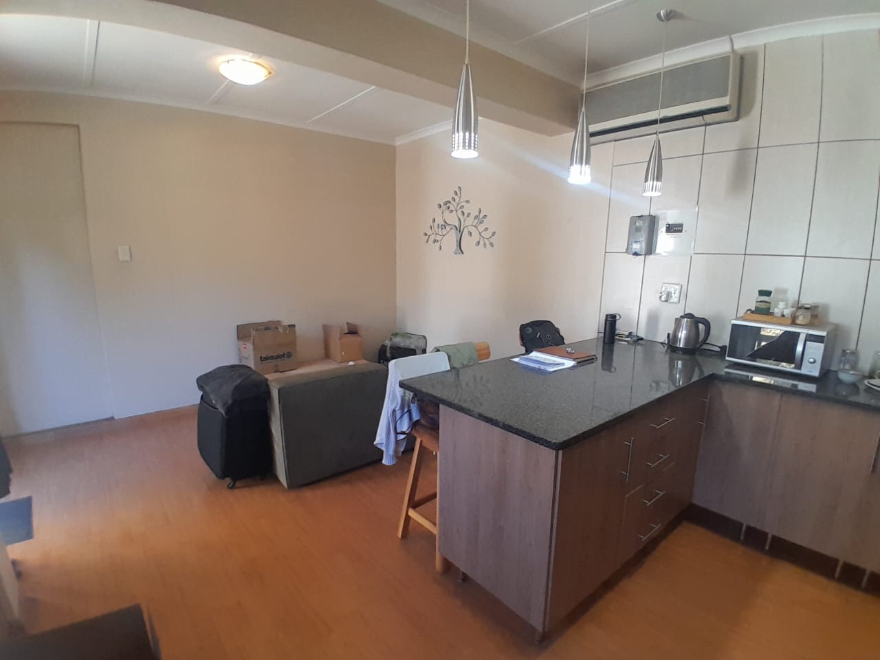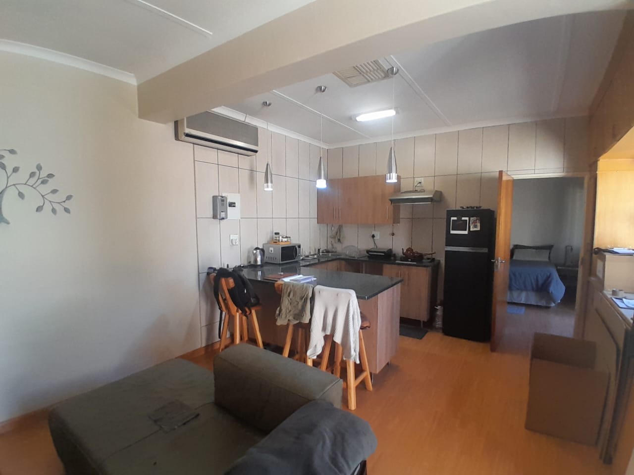 This inviting 1-bedroom, 1-bathroom rental property in Klisserville, Kimberley, offers a blend of modern comfort and practical living. The heart of the home features an open-plan living and kitchen area, bathed in natural light from large windows. The kitchen boasts modern wood-look cabinetry, dark granite-look countertops, a tiled backsplash, and is equipped with a built-in gas hob and extractor fan. Stylish pendant lighting illuminates the space, which also includes a convenient breakfast bar/island and an air conditioning unit for year-round comfort. Consistent laminate wood flooring flows throughout the main living areas, creating a cohesive and contemporary feel. The well-appointed bedroom provides a peaceful retreat with neutral walls, laminate flooring, and ample natural light, complemented by vertical blinds for privacy. The functional bathroom is fully tiled, featuring a vanity with a sink and wall-mounted shelving for storage. A dedicated utility or laundry area is also present, complete with durable tiled floors and walls, space for a washing machine, and practical countertop space with open shelving, ensuring household chores are managed with ease. This property is ideally suited for a single professional or a couple seeking a convenient, lock-up-and-go lifestyle. The secure environment is enhanced by a perimeter fence and an access gate, providing peace of mind. With its practical layout and modern touches, this rental offers a comfortable base for contemporary living. Nestled in this established Kimberley suburb, the rental provides easy access to local amenities and transport routes, making it a desirable location for residents. Key Features: * 1 Bedroom, 1 Bathroom * Open-plan Living & Kitchen * Modern Kitchen with Gas Hob * Air Conditioning Unit * Laminate Wood Flooring * Dedicated Laundry Area * Secure with Fence & Access Gate * 1 Parking Bay