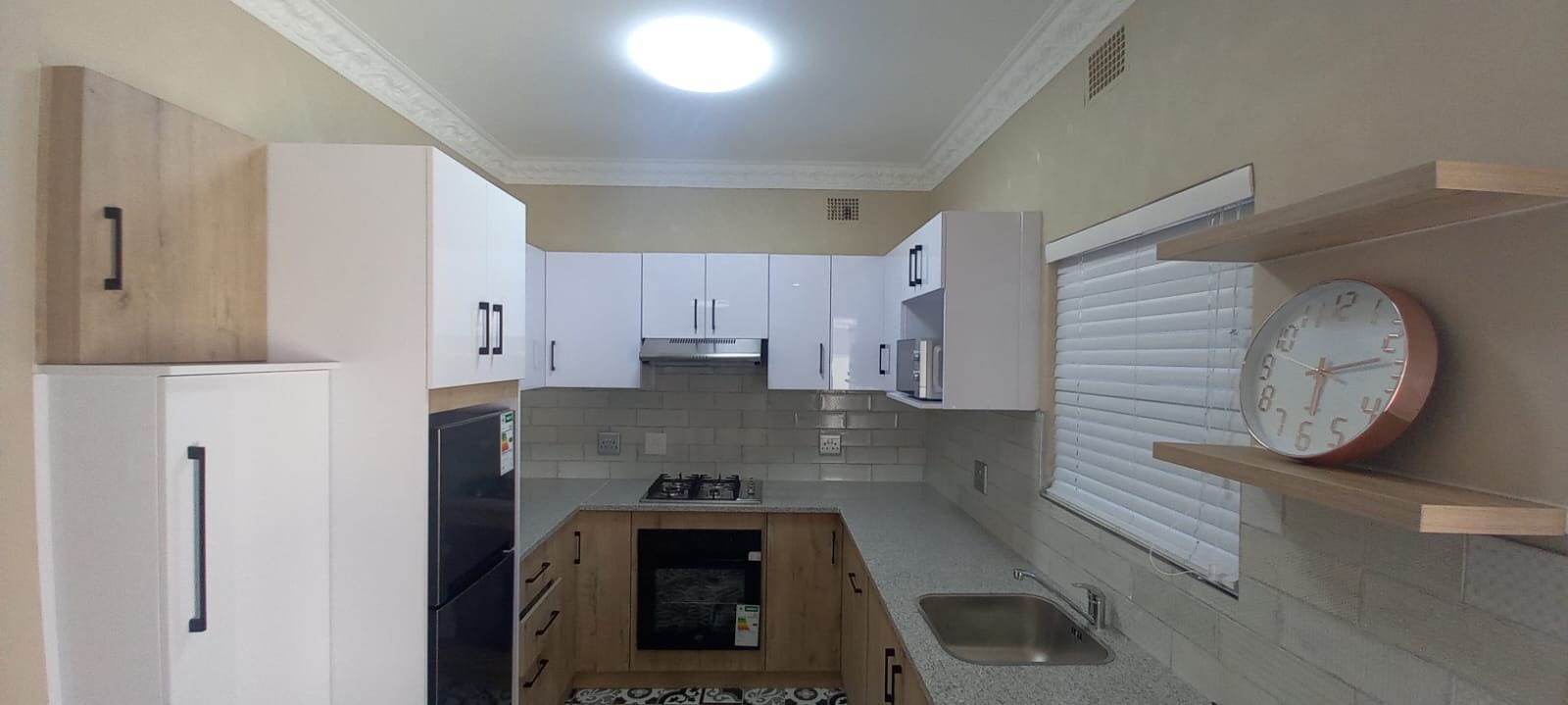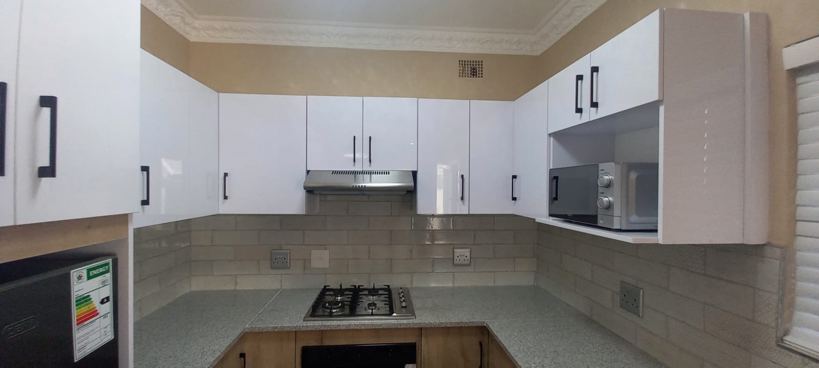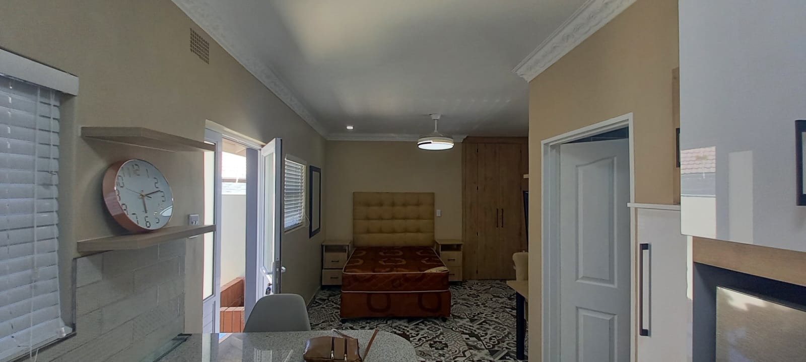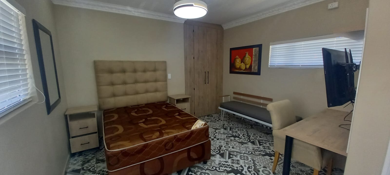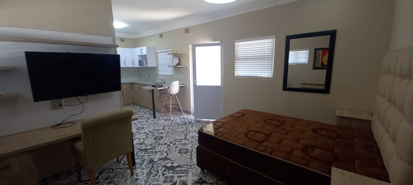 Beautiful kitchen with cupboards, stove, fridge and microwave. Bedroom with build in cupboards, double bed, couch and TV. 1 Bathroom. Own braai area. Communal undercover parking area and laundry area Electric fence and JoJo tank
