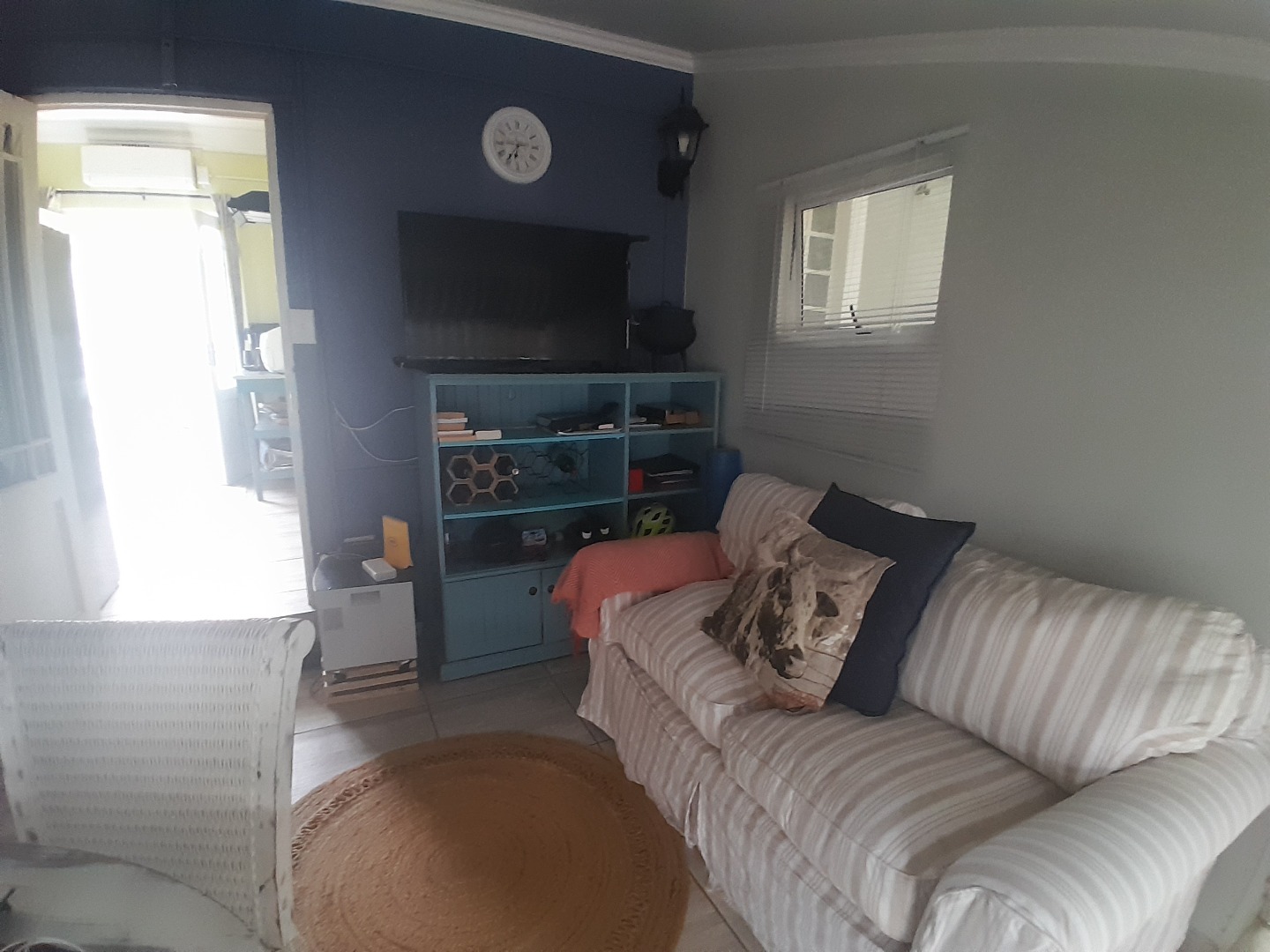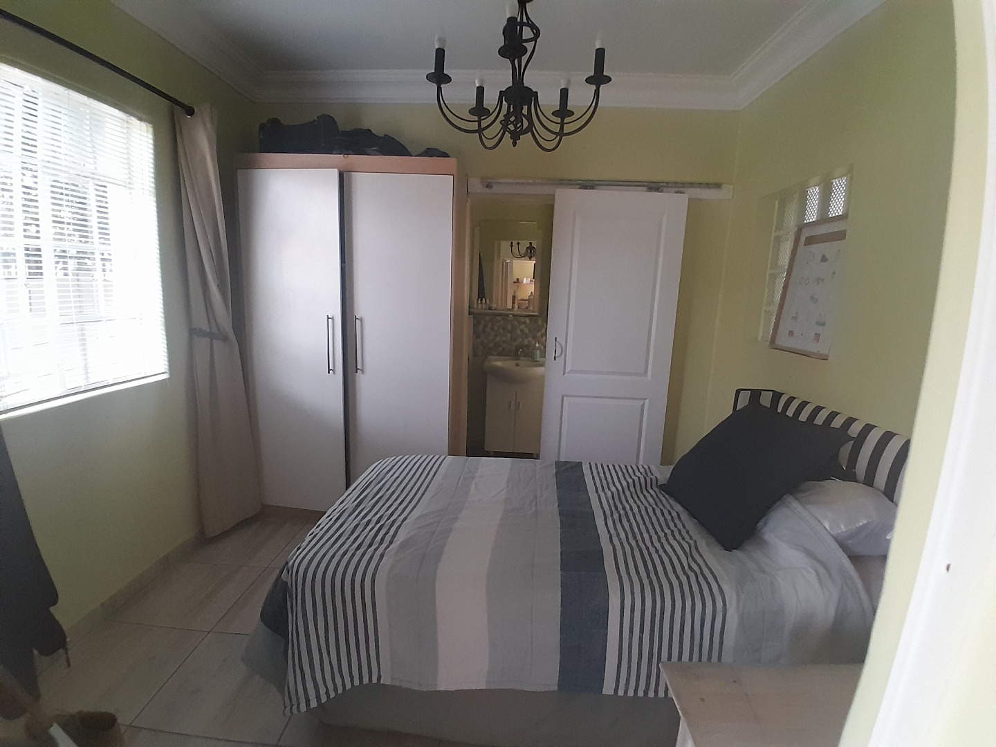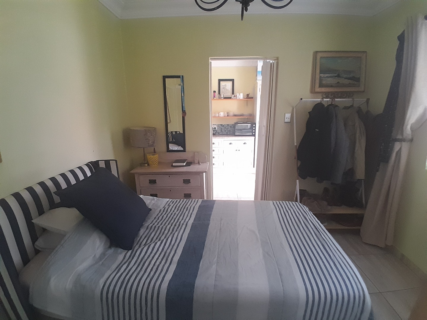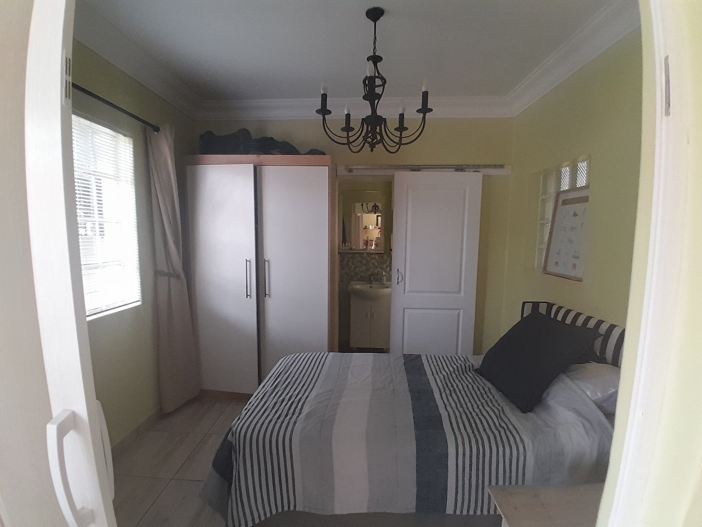 Bedroom with double bed, build in cupboards and en-suite bathroom. Living area with comfortable couch and a tv.
