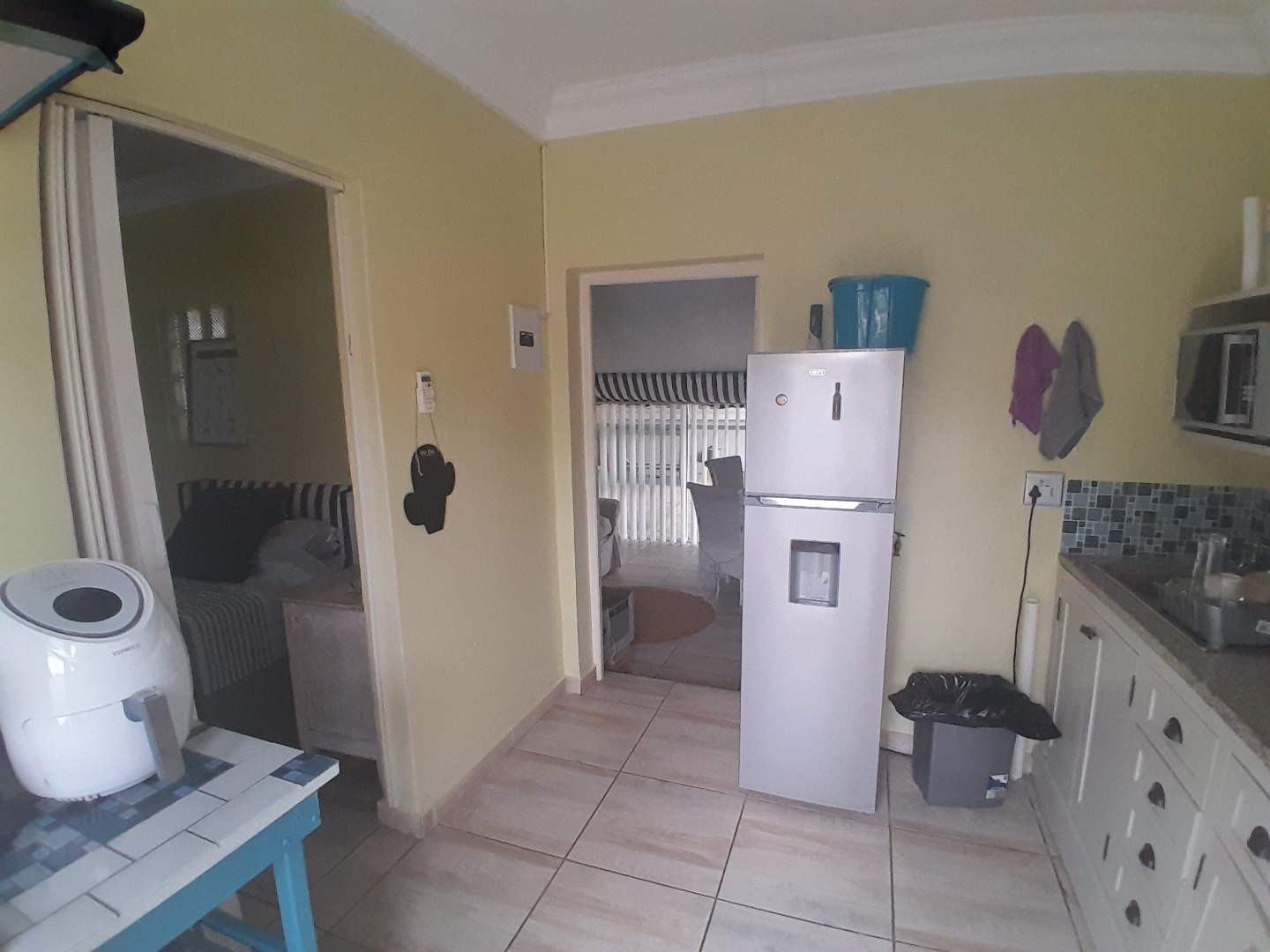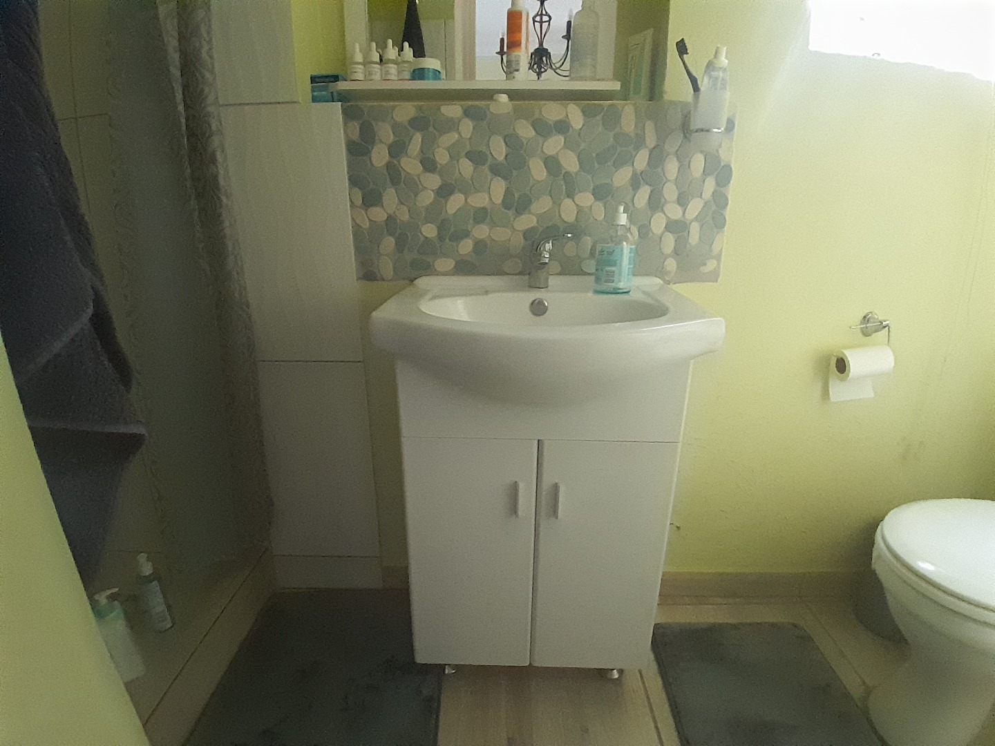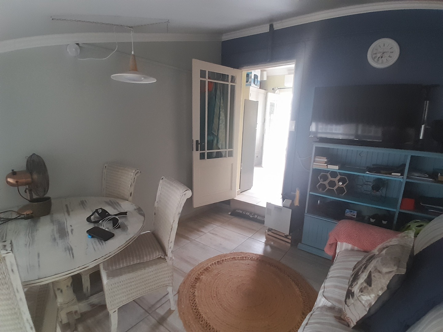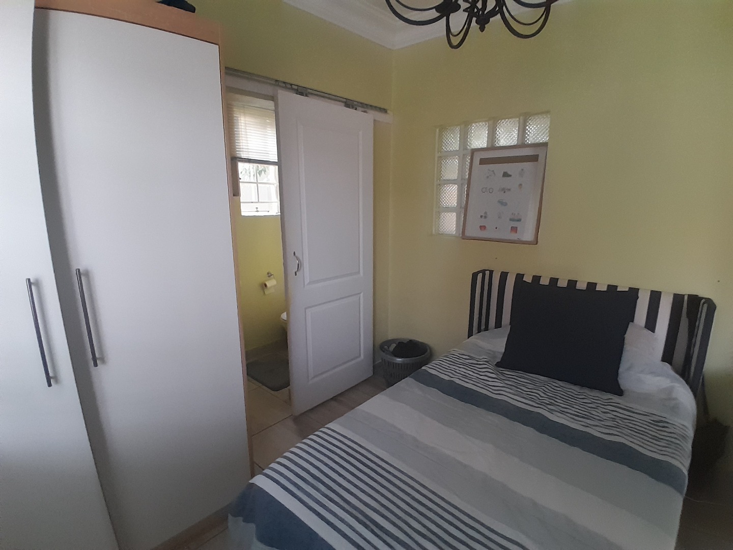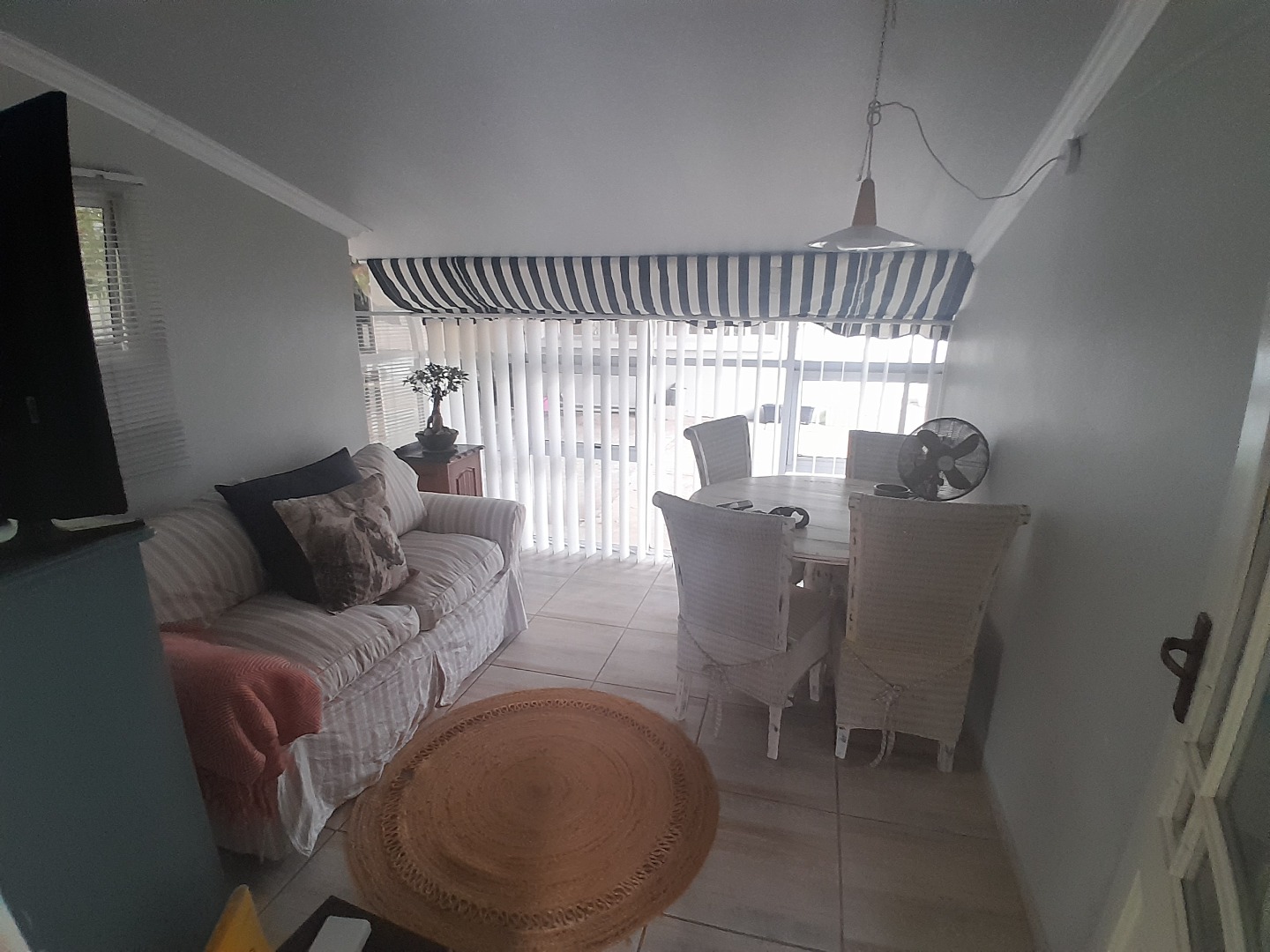 Bedroom with double bed, build in cupboards and en-suite bathroom. Living area with comfortable couch and a tv.