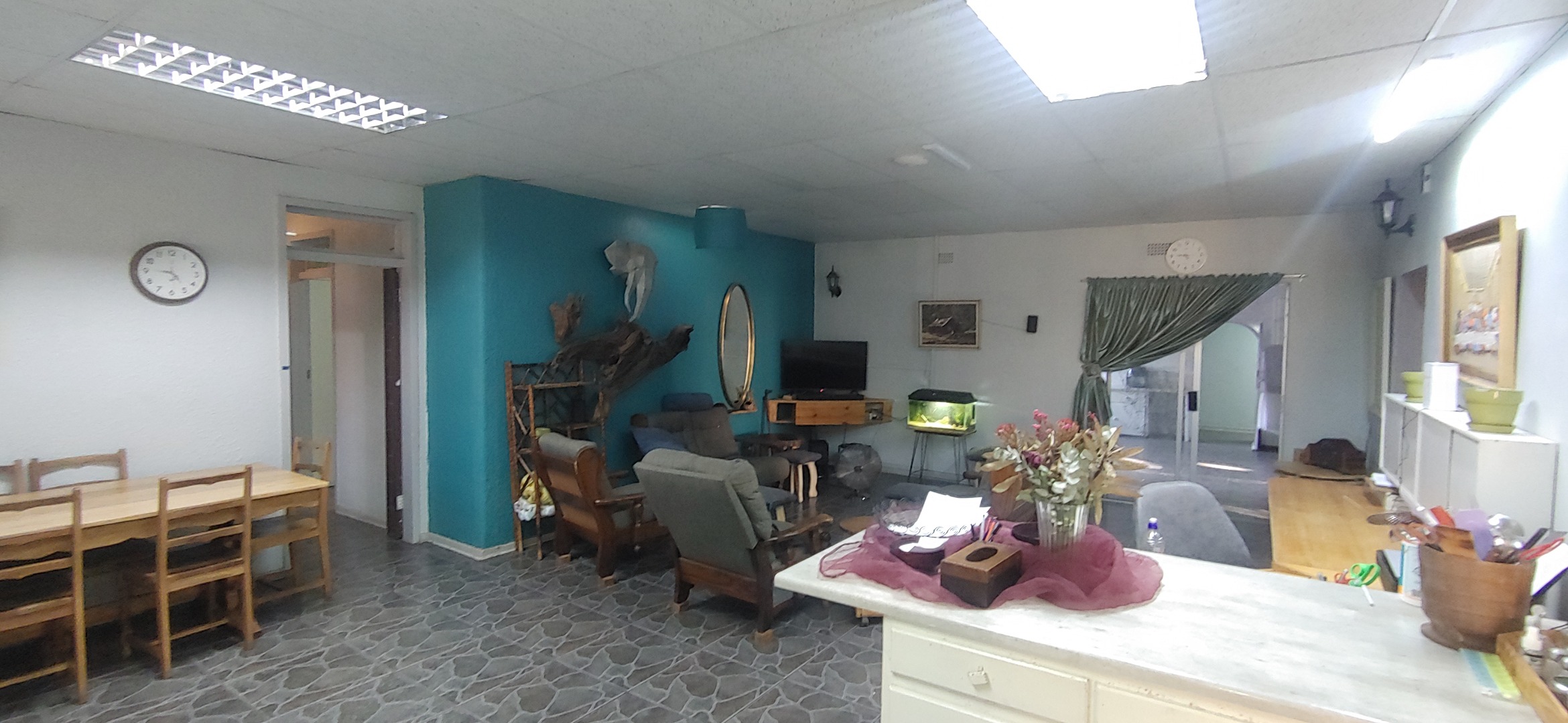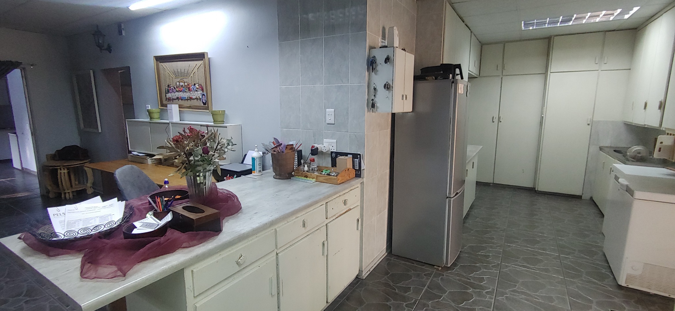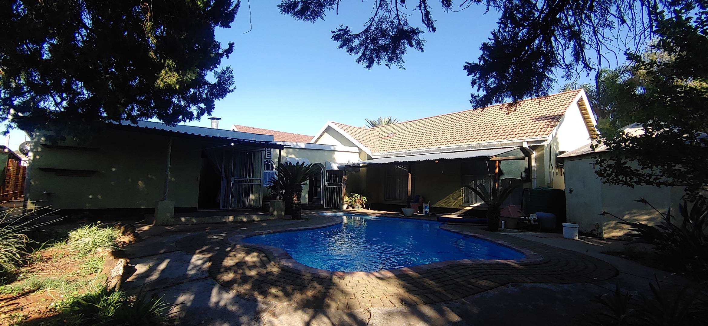 Located in the suburban heart of Carters Glen, Kimberley, this expansive property offers a significant footprint in a well-established South African neighbourhood. This substantial residence boasts 7 bedrooms and 5 bathrooms, including two ensuites, providing ample accommodation. The interior features two distinct kitchens, two dining rooms, and two lounges, alongside a dedicated family/TV room, offering versatile living arrangements. Tiled flooring is present throughout, and air conditioning units are installed in several rooms for comfort. While some areas present opportunities for cosmetic updates, the functional layout and built-in wardrobes offer practical living. Step outside to discover a large, inviting swimming pool, perfect for relaxation and entertaining. A covered patio area extends the living space outdoors, complemented by an established garden with both lush and drought-resistant plantings. The property provides generous parking with space for five vehicles, including a substantial carport, and features a built-in braai. The presence of a second house on the property further enhances its appeal, offering excellent dual living possibilities. Security is addressed with a totally walled perimeter, burglar bars, and security gates, including a spiked fence at the front. Fibre connectivity is available, ensuring modern communication needs are met. Water tanks are also on-site, contributing to water resilience. This property, with its architectural character and potential, awaits a discerning buyer to personalise and enhance its charm. Key Features: * 7 Bedrooms, 5 Bathrooms (2 Ensuites) * 2 Kitchens, 2 Lounges, 2 Dining Rooms * Large Swimming Pool & Covered Patio * Established Garden & Built-in Braai * 5 Parking Spaces & Carport * Second House / Dual Living Potential * Fibre Connectivity & Water Tanks * Walled Perimeter with Security Gates & Burglar Bars