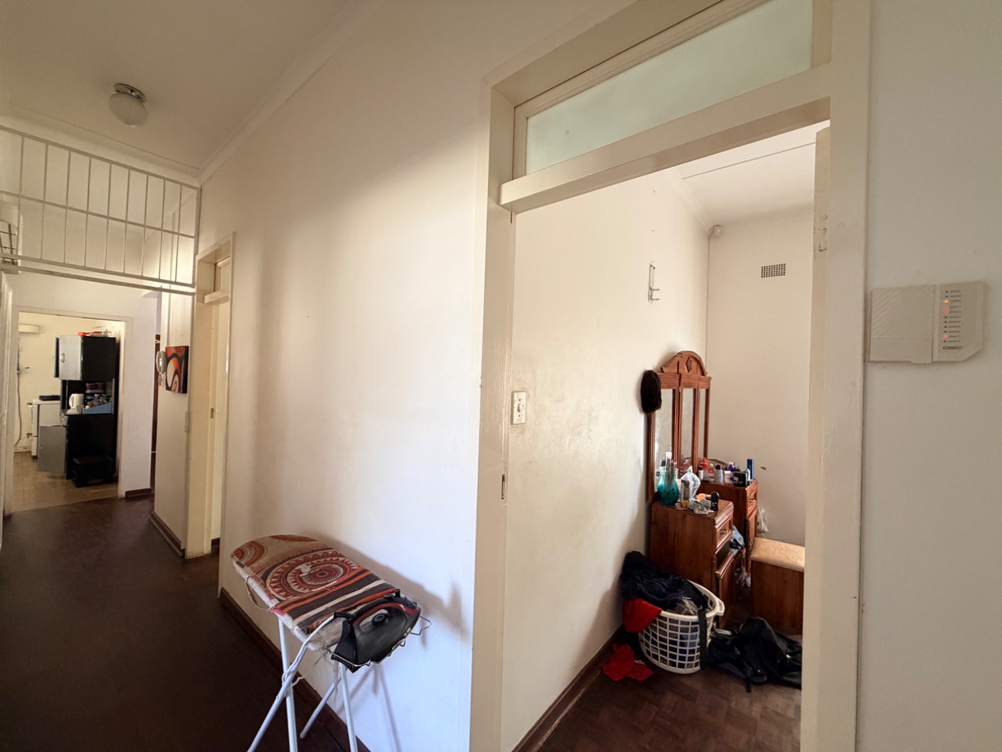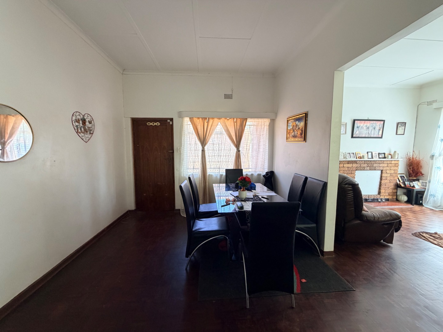 Entering through the front door, you are welcomed directly into the dining room, creating a central hub within the home. The property features dark brown mini parquet wood tile flooring throughout, adding warmth and character to the living spaces (excluding the bathroom, toilet, and kitchen areas).