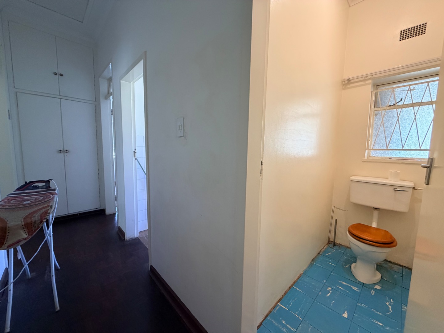 Entering through the front door, you are welcomed directly into the dining room, creating a central hub within the home. The property features dark brown mini parquet wood tile flooring throughout, adding warmth and character to the living spaces (excluding the bathroom, toilet, and kitchen areas).