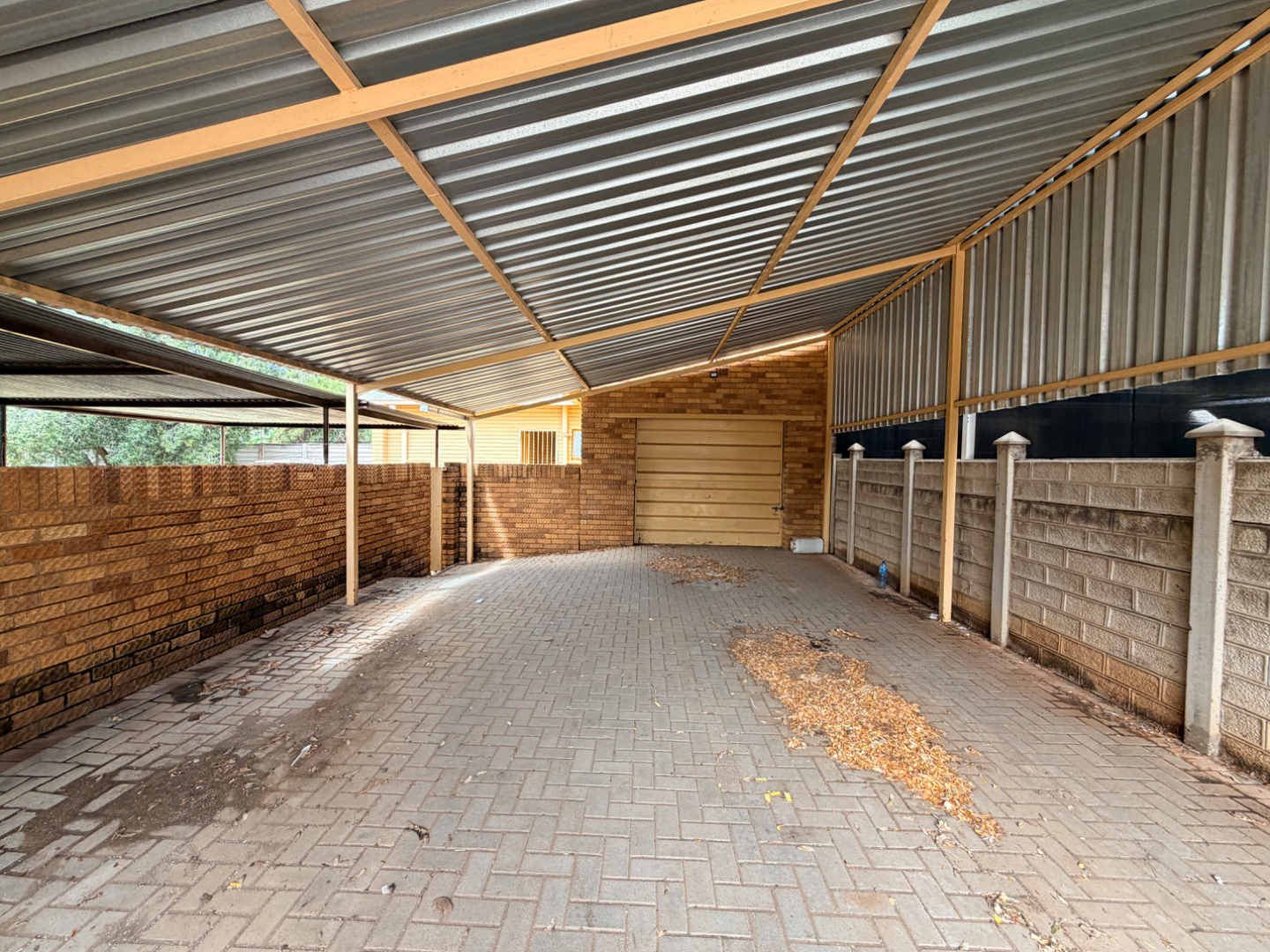A motorised gate provides secure access to a well-paved driveway leading to a single garage, complemented by a large carport accommodating up to four vehicles — perfect for families with multiple vehicles or visitors.