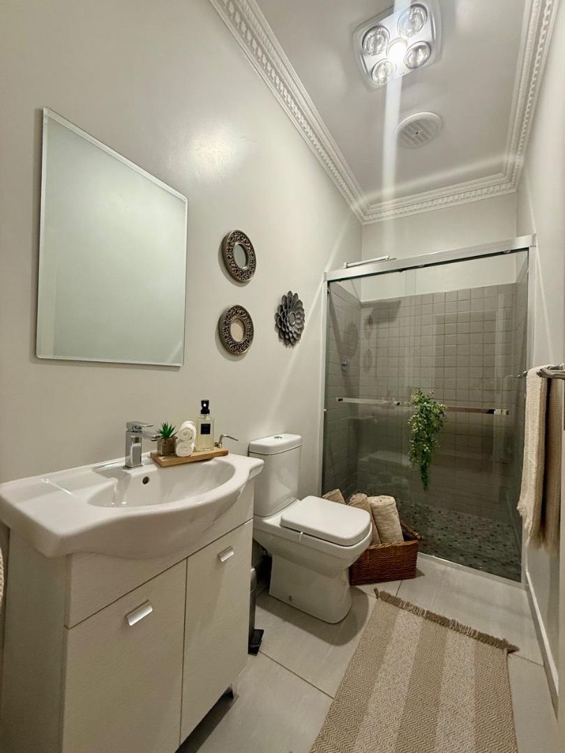The home offers four well-sized bedrooms, all filled with natural light. Two bedrooms feature en-suite bathrooms. The main bedroom includes a walk-in closet and an elegant en-suite bathroom with double basins, a toilet, and a shower. The second en-suite bathroom includes a bath, shower, and basin. A separate family bathroom with shower, toilet, and basin services the remaining bedrooms.