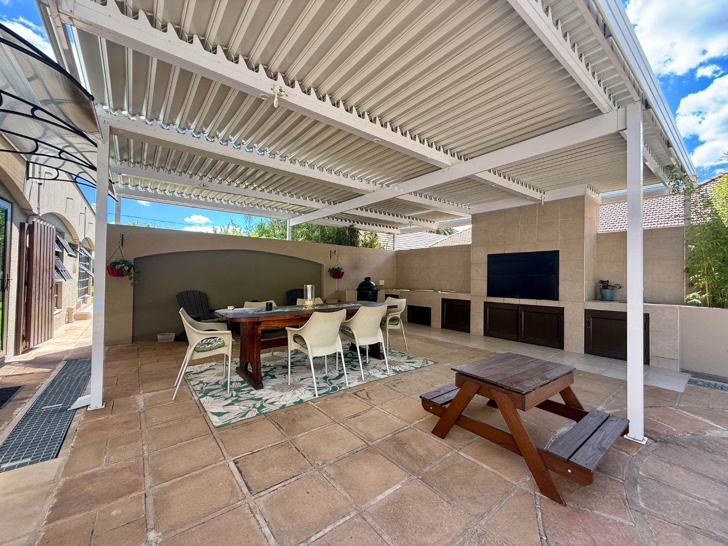 The outdoor entertainment area is designed for relaxed family living and memorable gatherings. A sparkling swimming pool is complemented by a patio and a covered braai area, making it the perfect setting for hosting friends and family all year round.