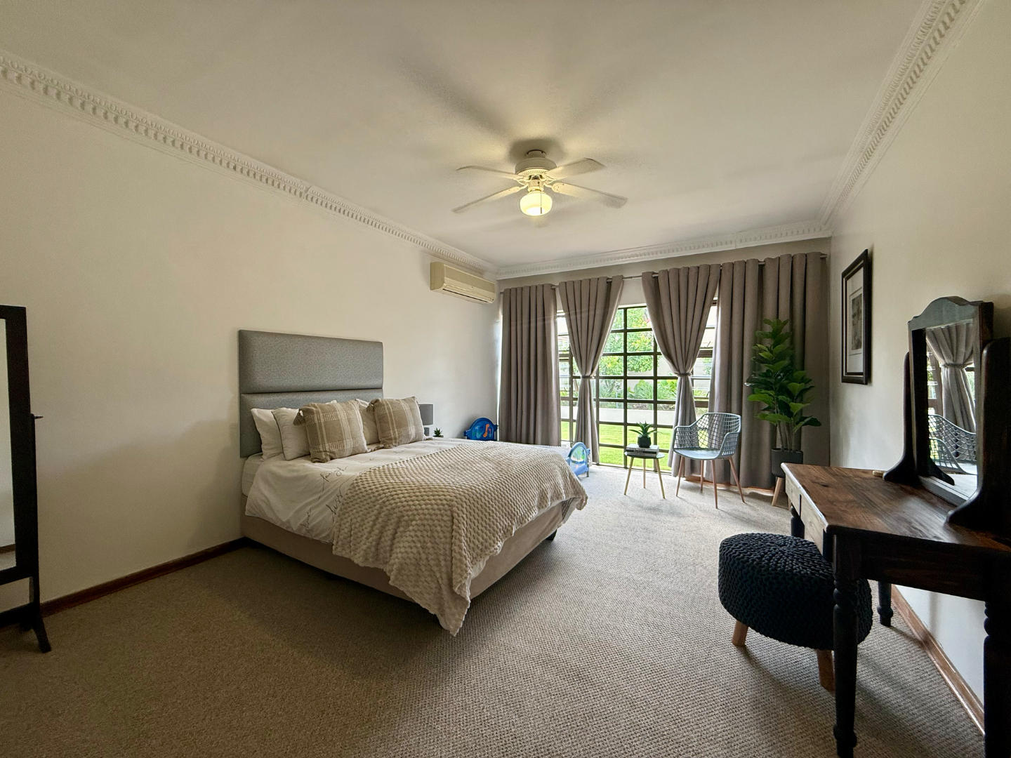 A major bonus is the property’s energy efficiency and water security. The home is equipped with a powerful 12.5 kW three-phase inverter, two 10 kW batteries, and 14 solar panels. A borehole producing approximately 1,600 litres per hour at a depth of 150 metres further enhances the property’s self-sufficiency.