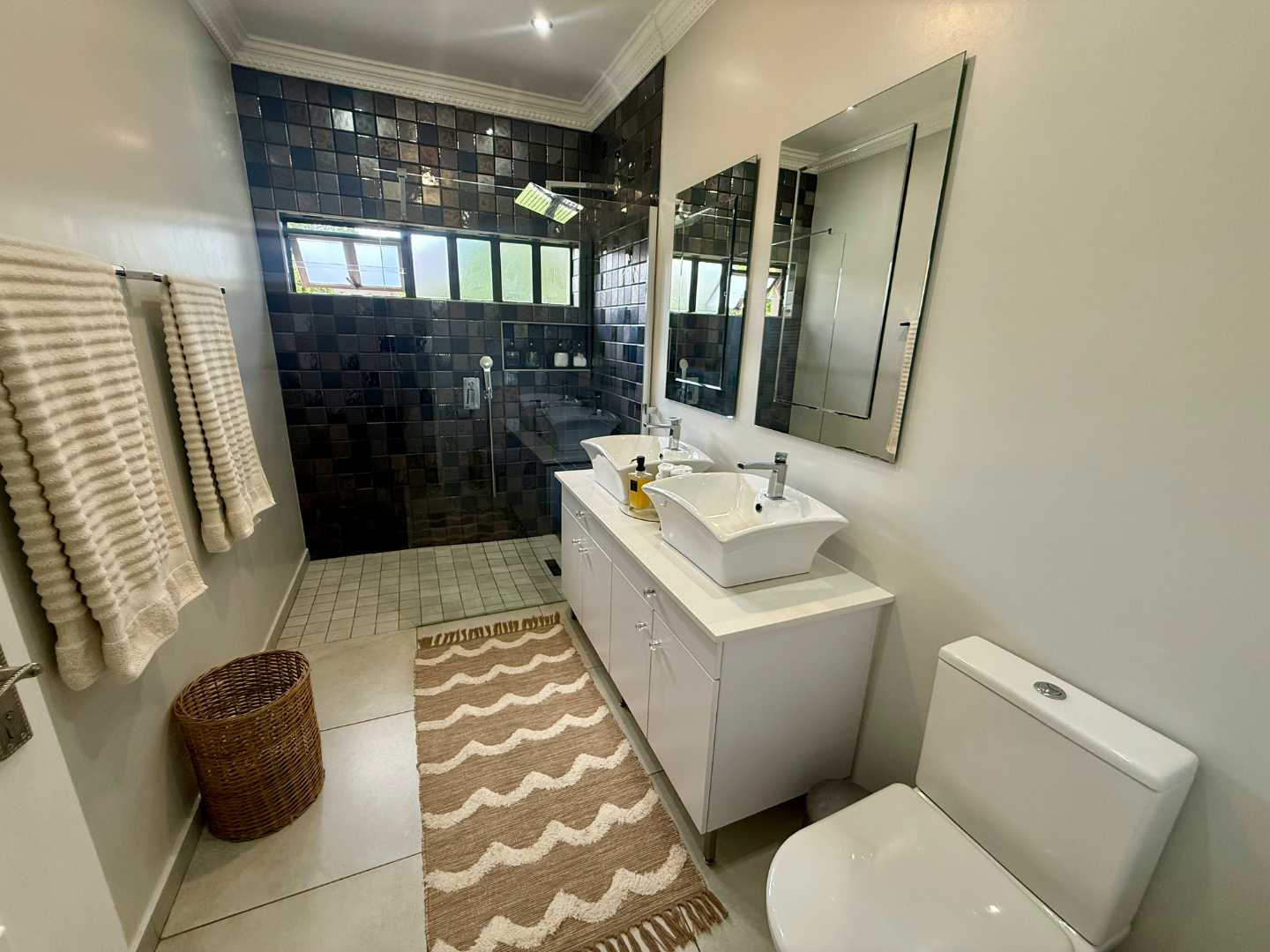 The home offers four well-sized bedrooms, all filled with natural light. Two bedrooms feature en-suite bathrooms. The main bedroom includes a walk-in closet and an elegant en-suite bathroom with double basins, a toilet, and a shower. The second en-suite bathroom includes a bath, shower, and basin. A separate family bathroom with shower, toilet, and basin services the remaining bedrooms.
