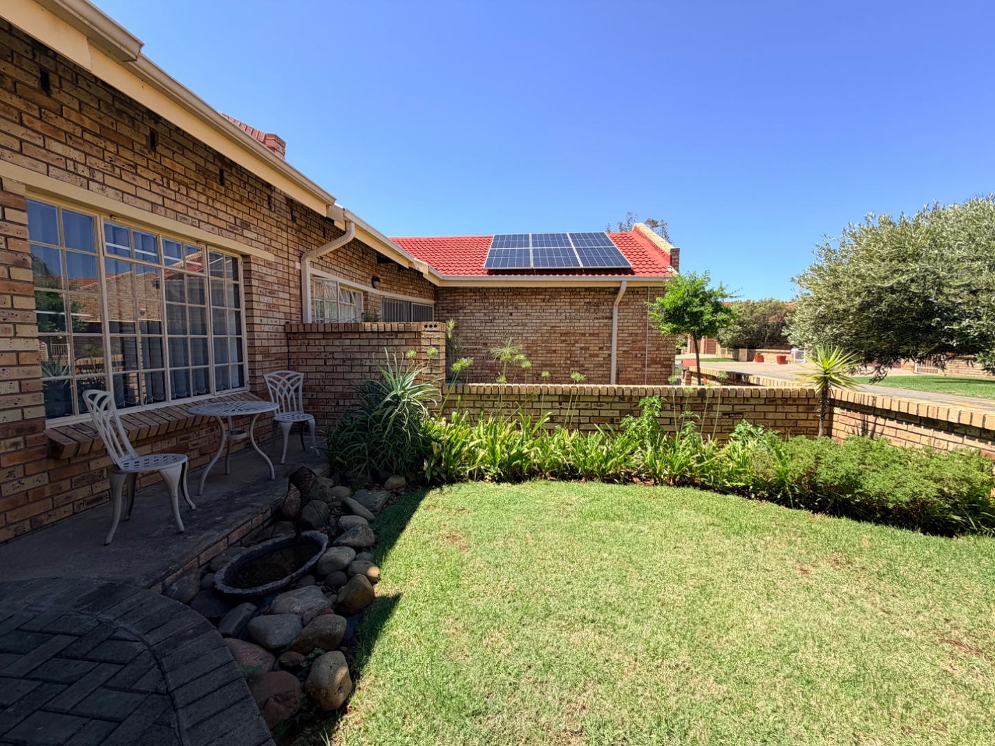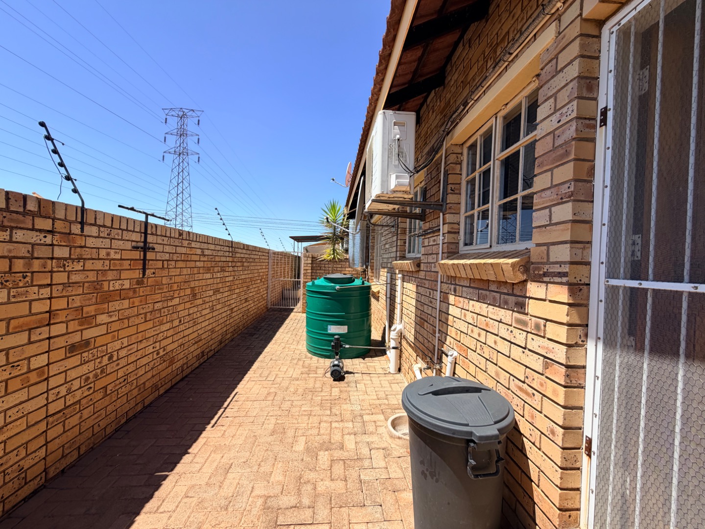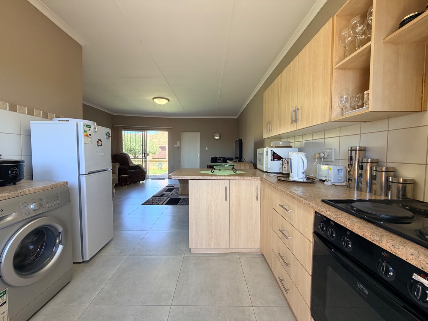The modern, compact kitchen is thoughtfully designed, offering ample cupboard space and practical countertop areas, perfectly suited for easy, everyday living. A back door from the kitchen opens onto a sunny private courtyard, which houses a 1 000-litre JoJo water tank with pump, providing valuable backup water storage and added peace of mind.