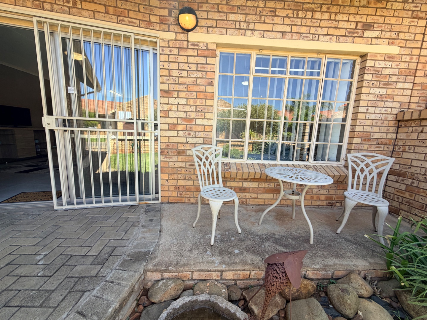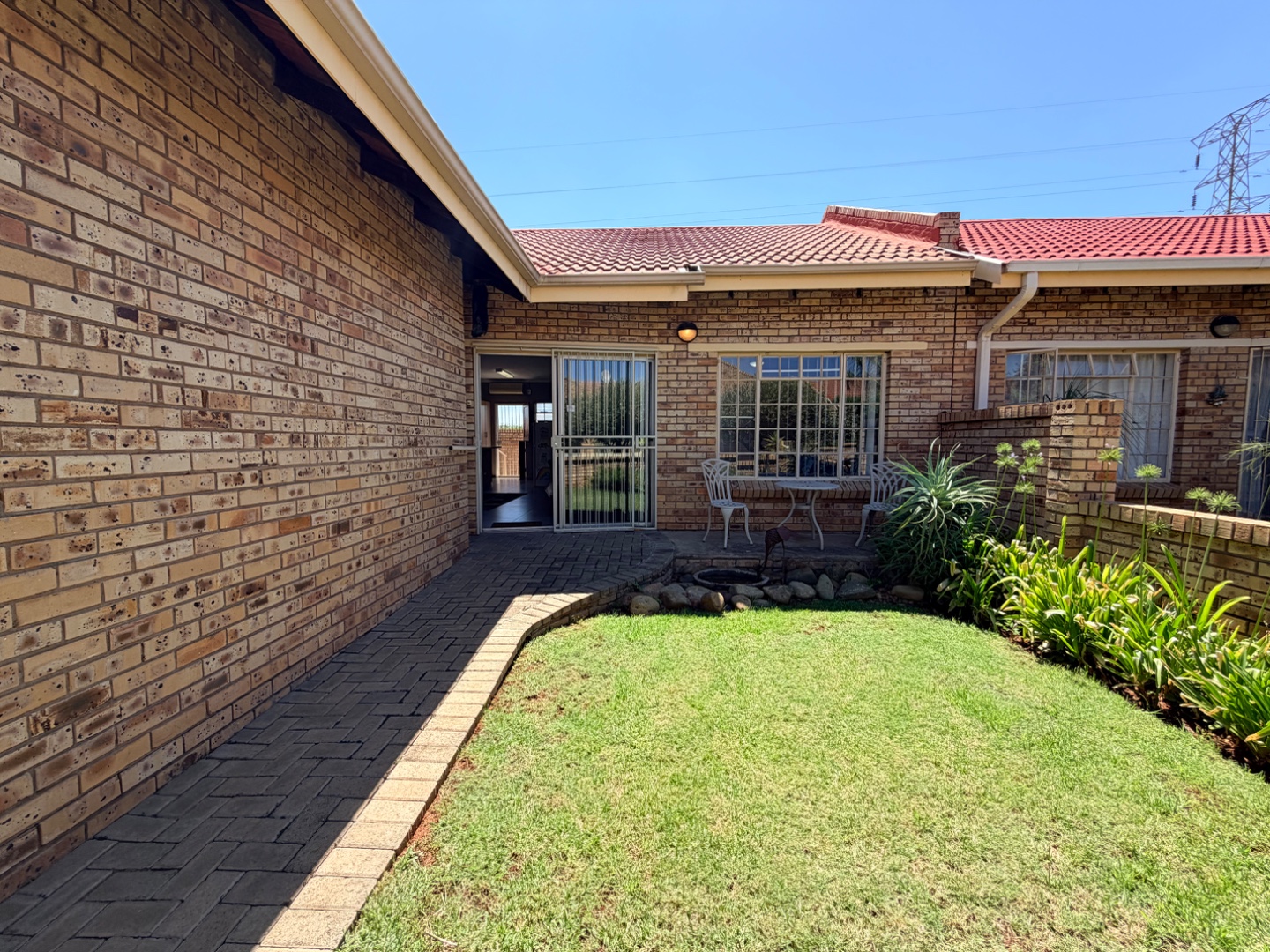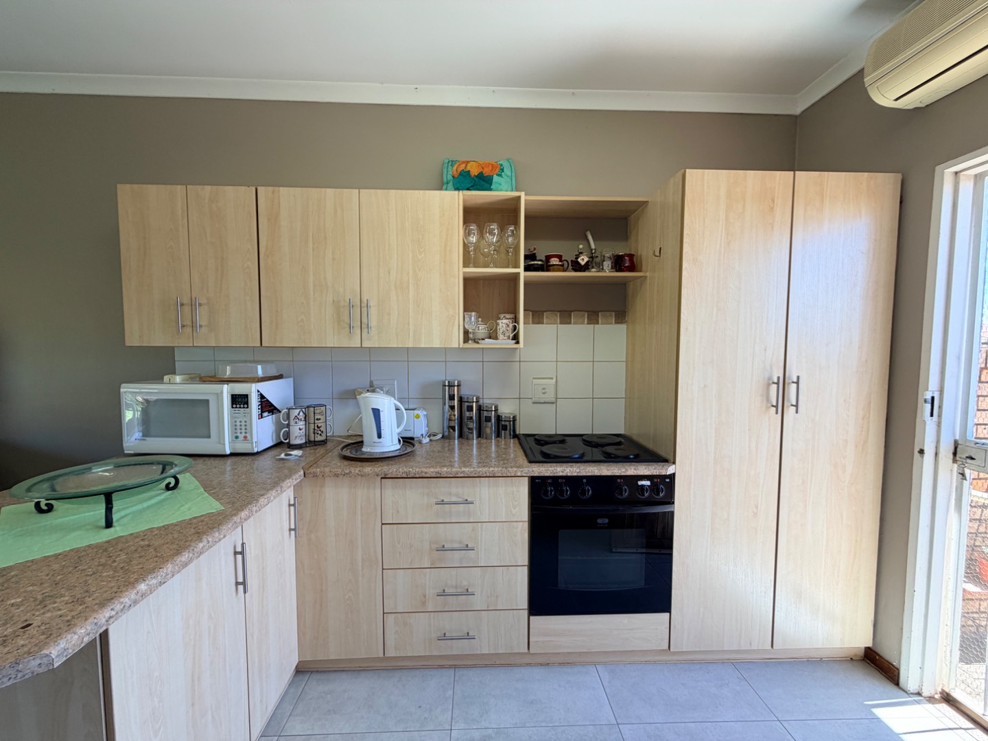 The modern, compact kitchen is thoughtfully designed, offering ample cupboard space and practical countertop areas, perfectly suited for easy, everyday living. A back door from the kitchen opens onto a sunny private courtyard, which houses a 1 000-litre JoJo water tank with pump, providing valuable backup water storage and added peace of mind.
