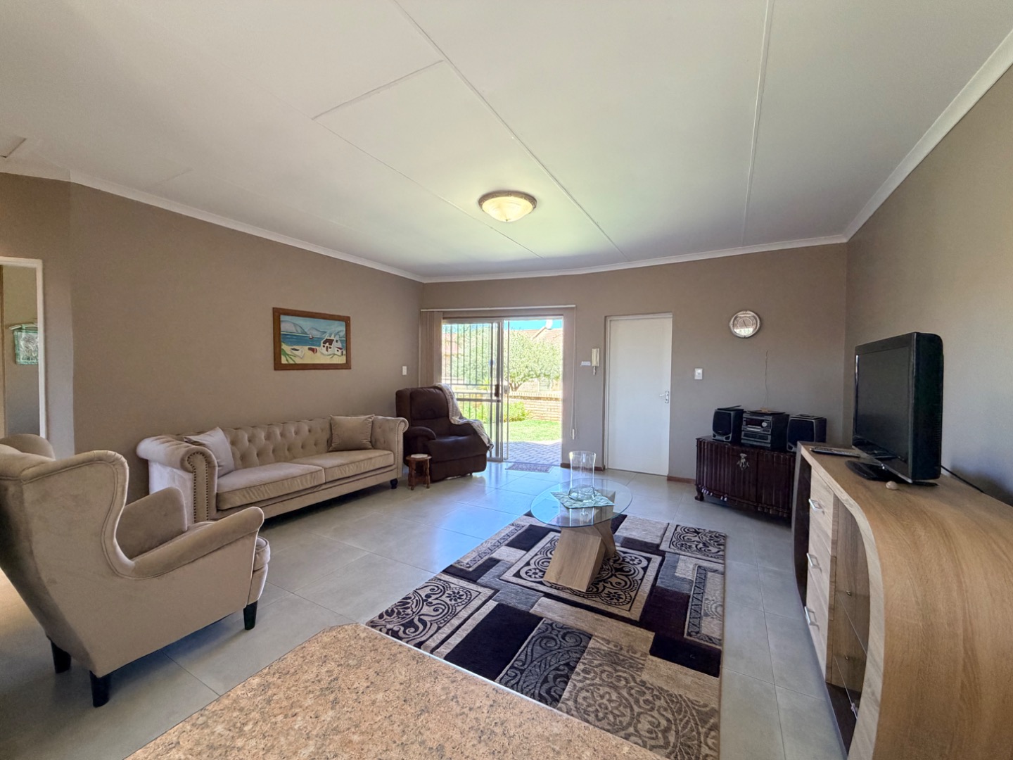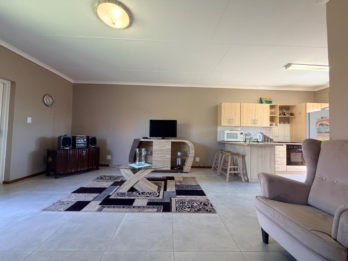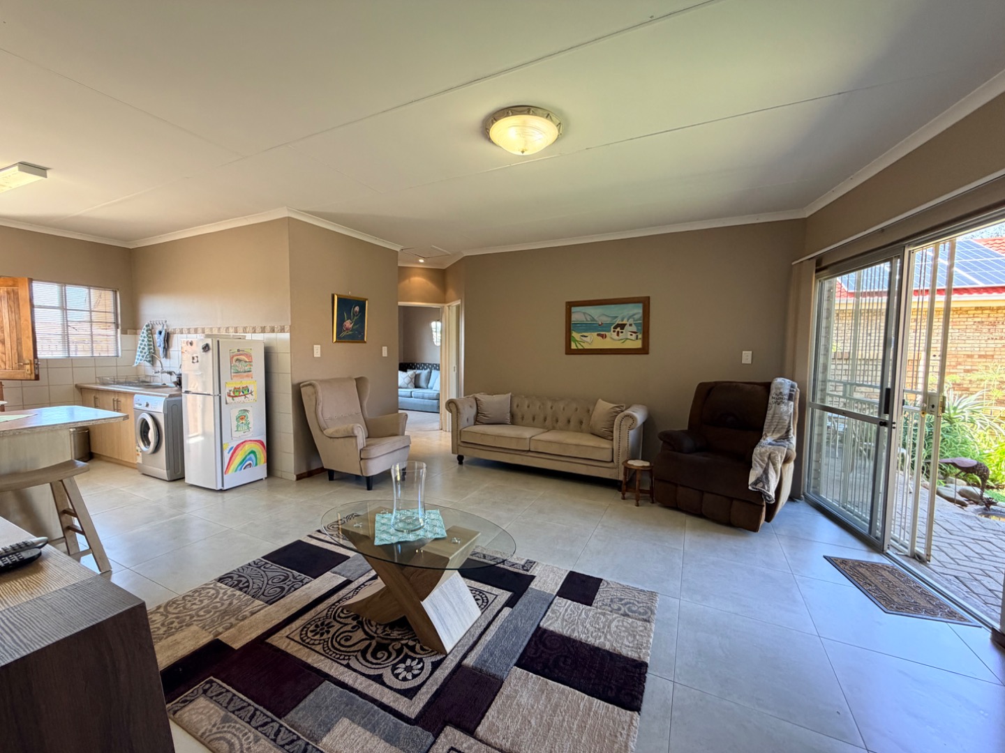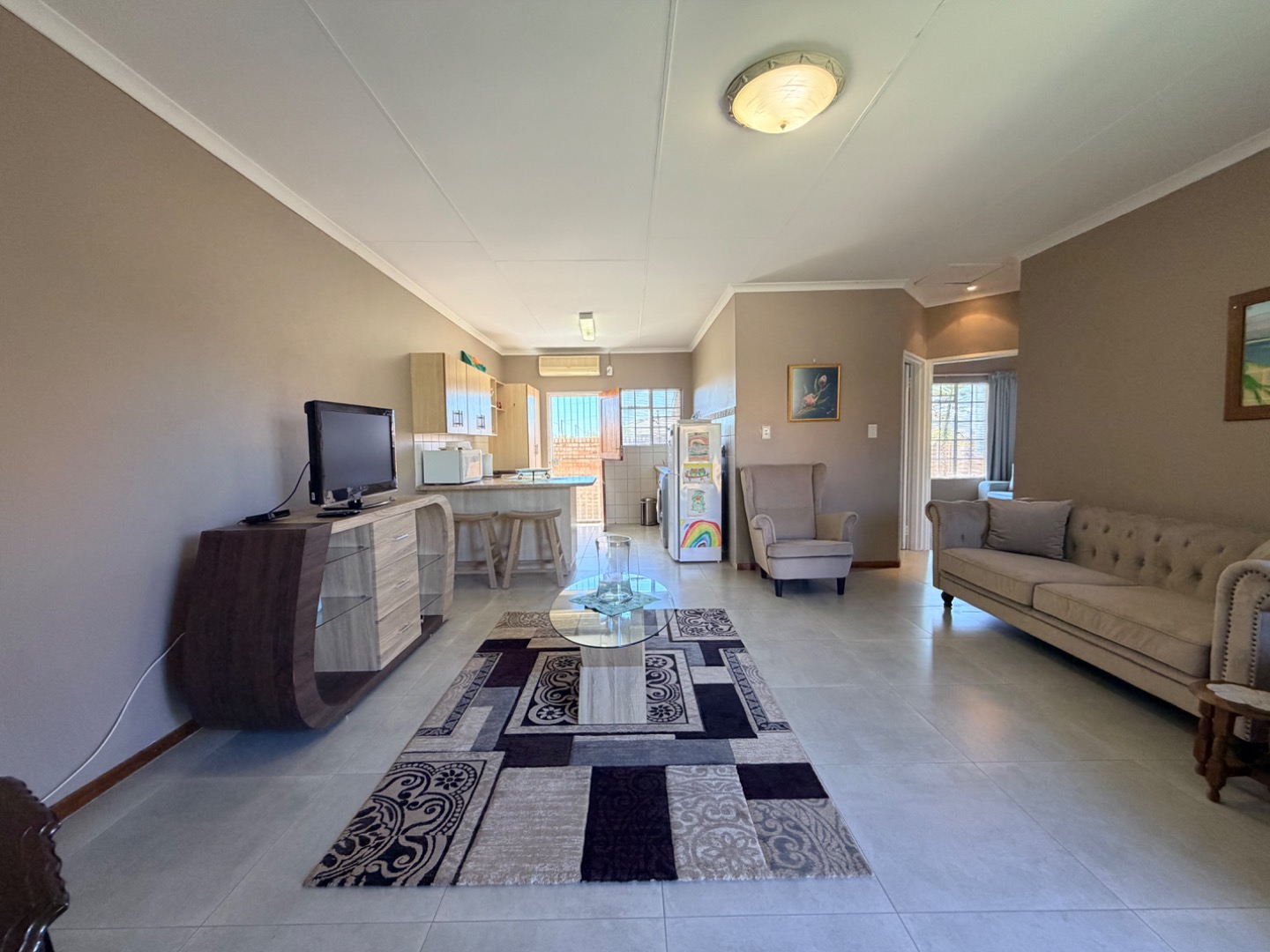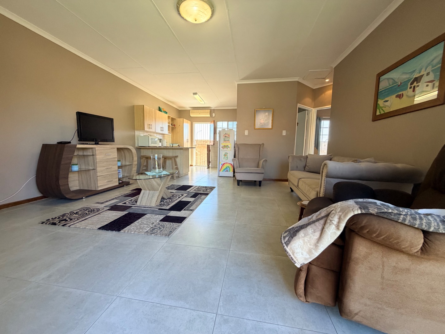 Inside, the spacious open-plan living area creates an immediate impression of comfort and openness. The layout and neutral tones enhance the airy, expansive feel, making it a delightful space to relax or entertain. Airconditioning provides comfort in this living area during those sweltering summer days.