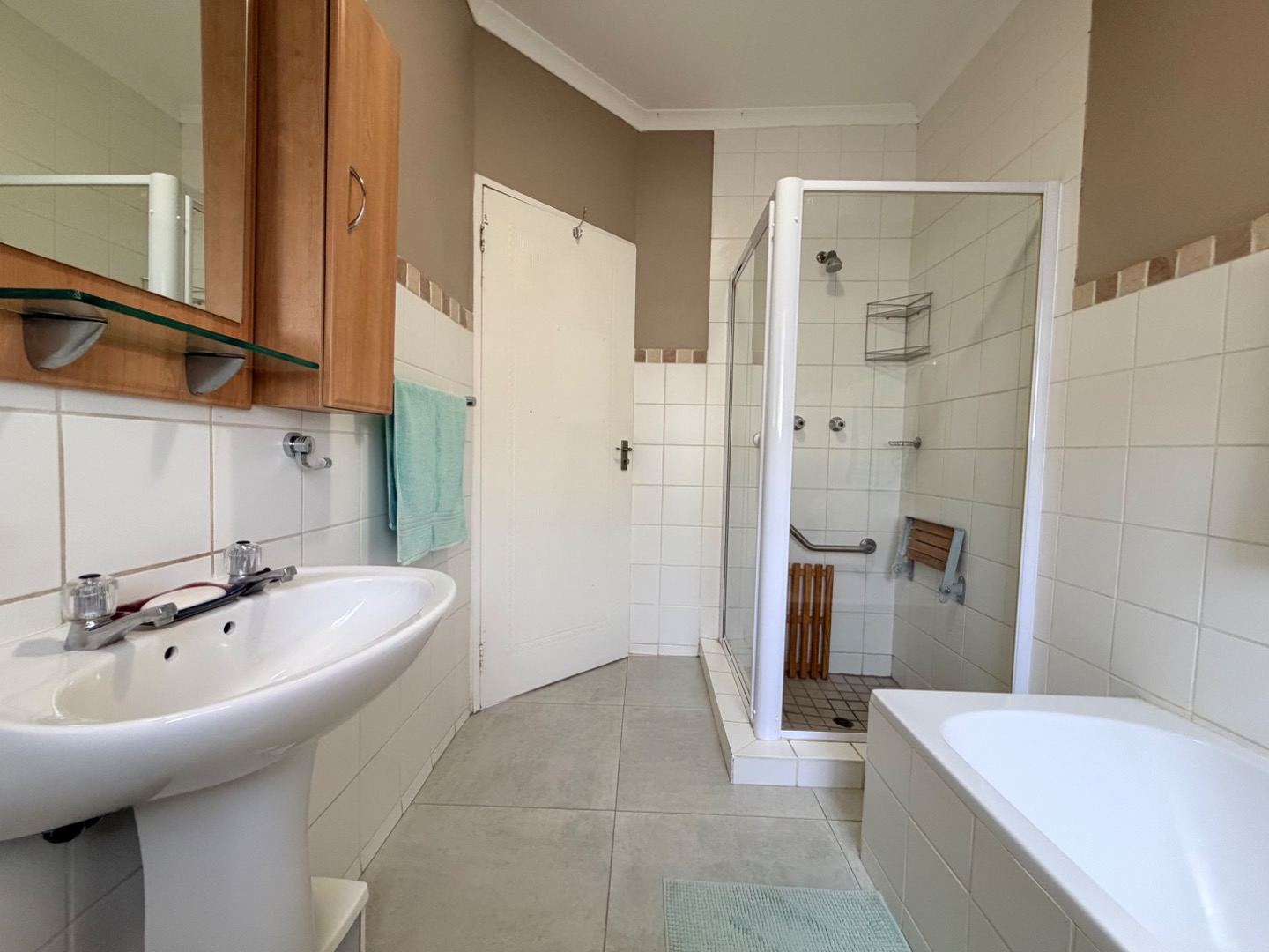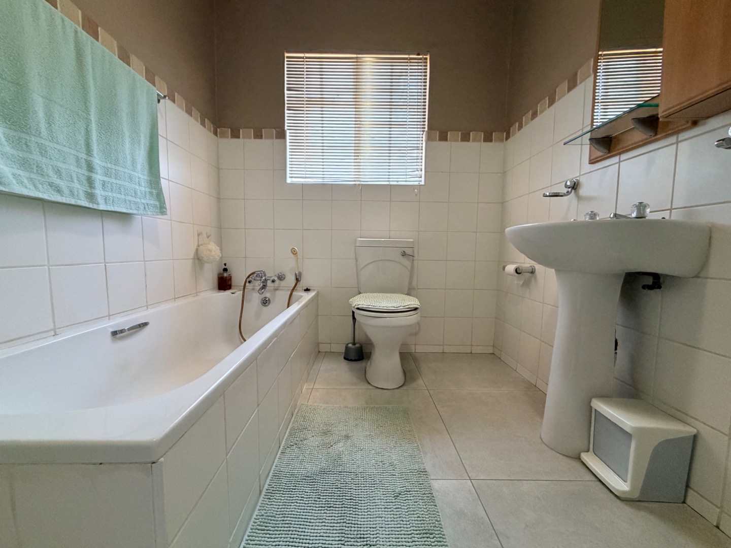 Tiled flooring throughout the living areas ensures low maintenance, while the bedrooms are comfortably finished with lush carpeting for warmth and comfort. The main bedroom is spacious, featuring built-in cupboards and a large window that fills the room with natural light. The second bedroom is smaller and north-facing, creating a warm and cosey retreat during the cooler winter months. The full bathroom is well appointed and includes a bath, shower, basin, and toilet, catering to all preferences.