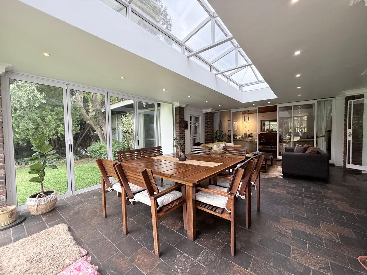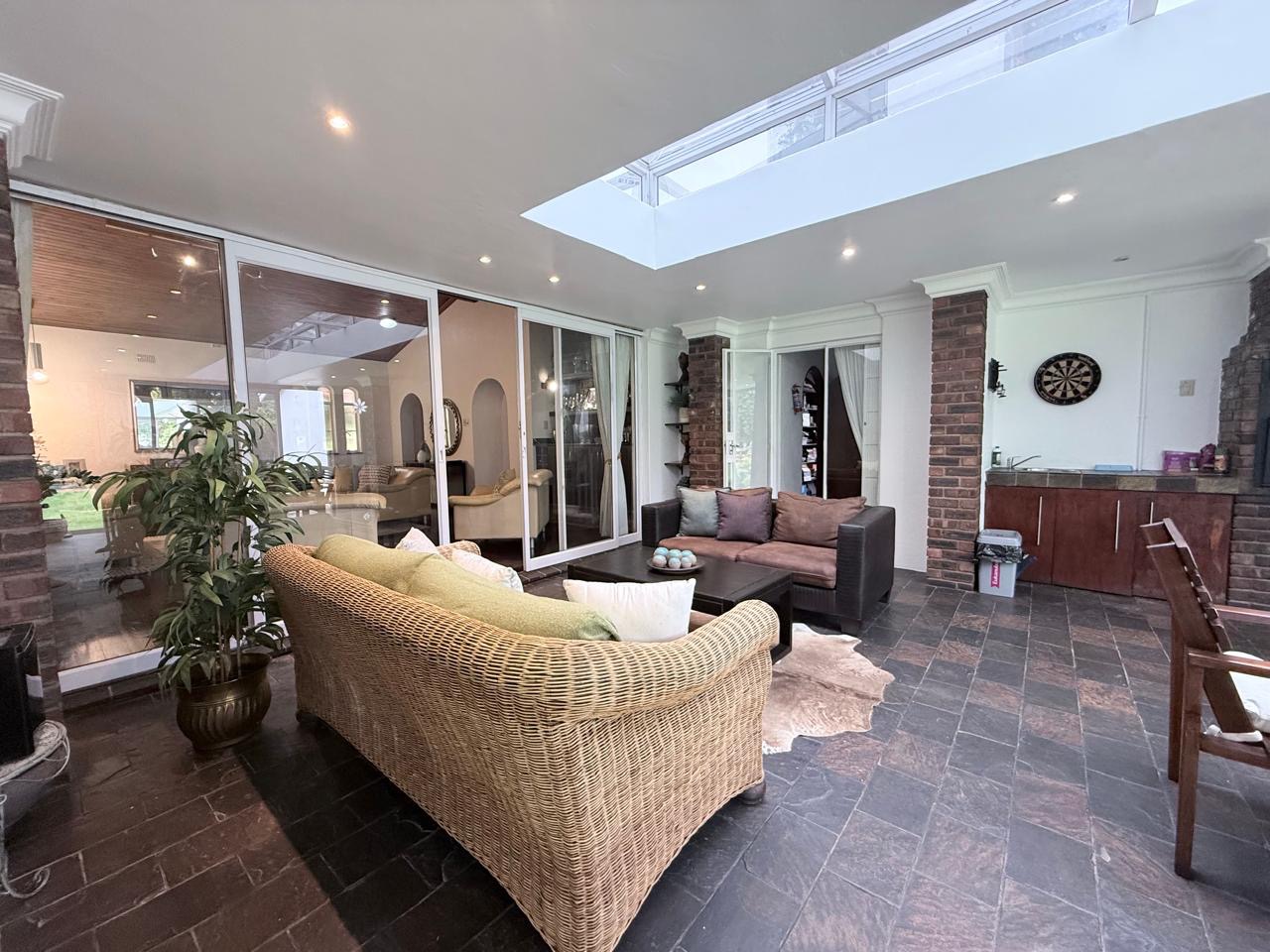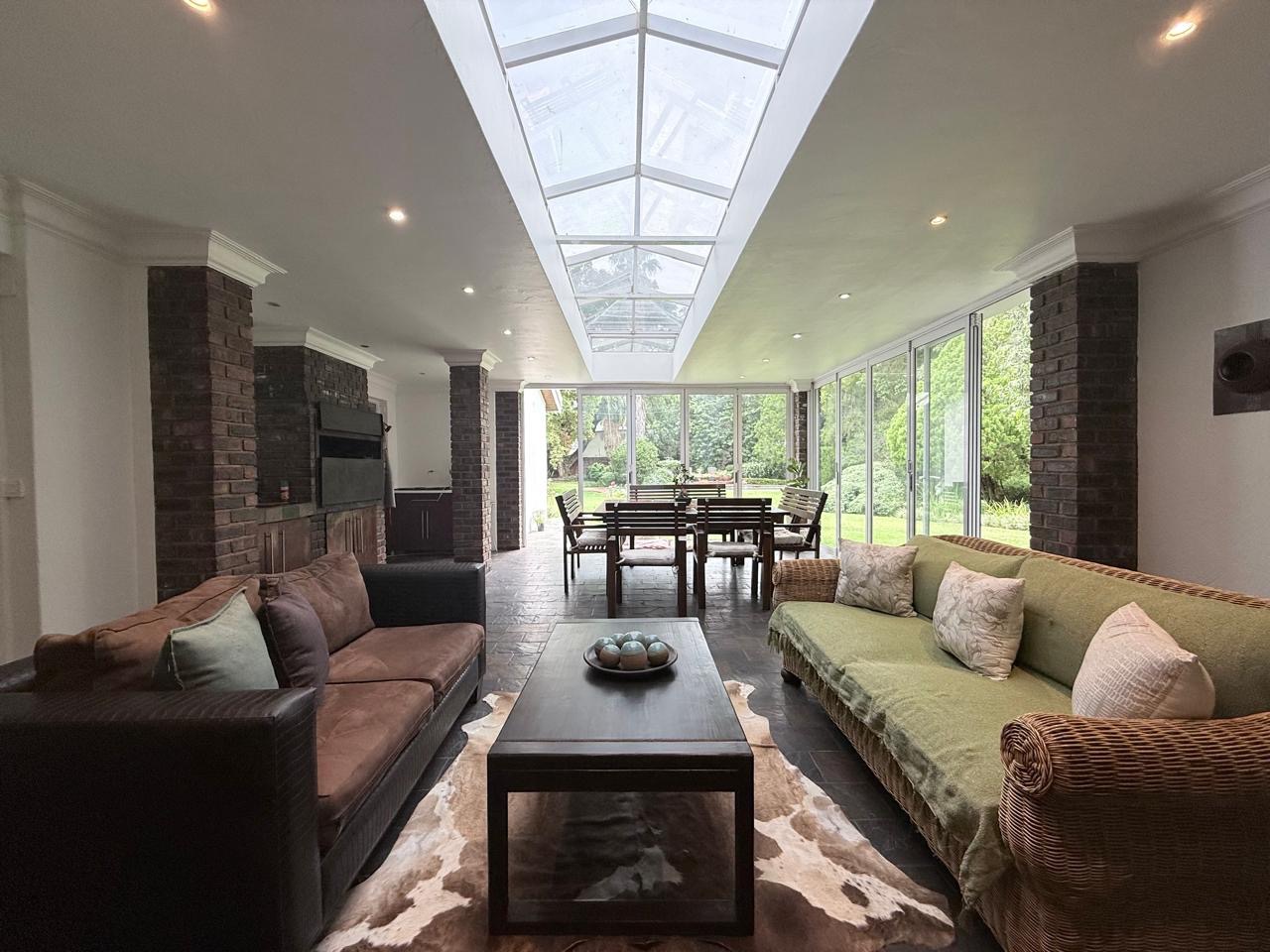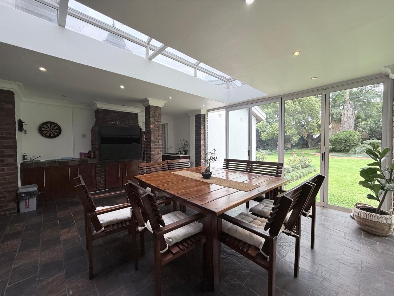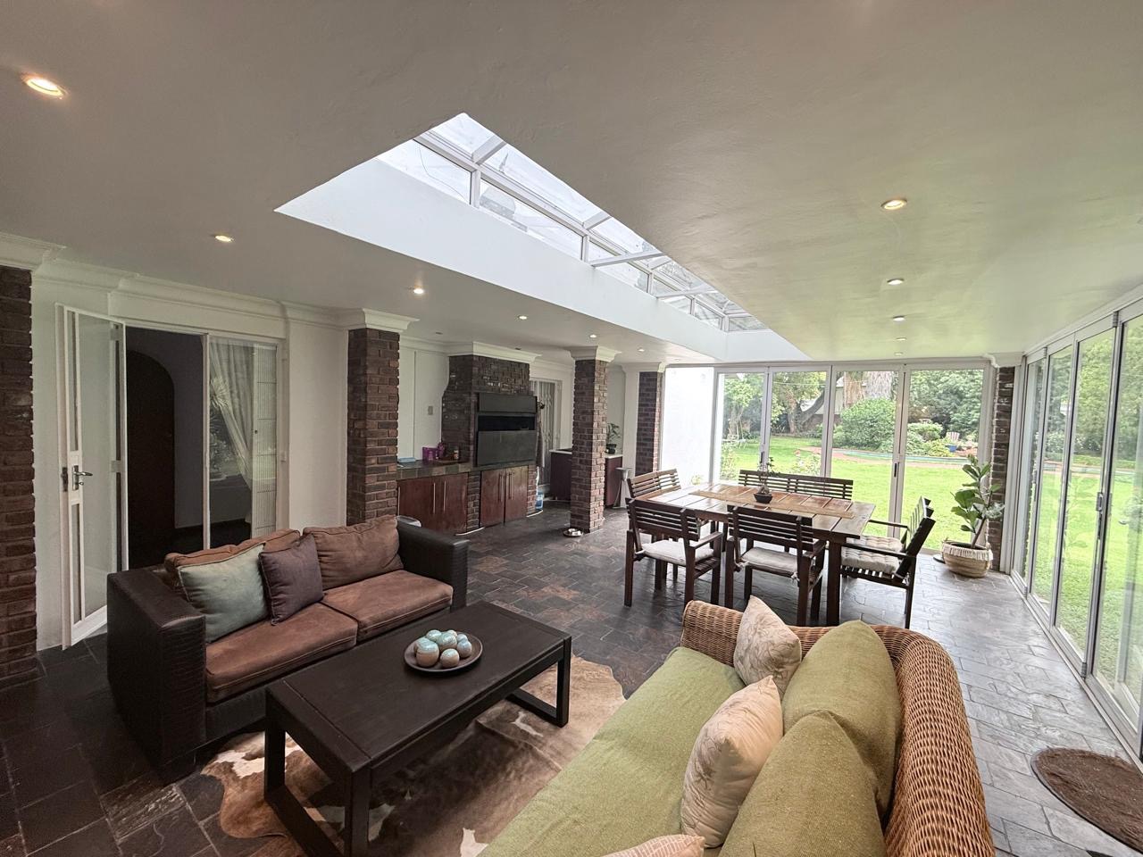 The spacious lounge flows effortlessly into an exceptional entertainment area, complete with a glass awning, stack doors and a built-in braai — ideal for hosting in any season. From here, the home opens out to a lush, landscaped garden oasis with a large swimming pool, creating a serene setting for both relaxation and family enjoyment. A second lounge with a cosy fireplace provides an additional living area for quieter moments.