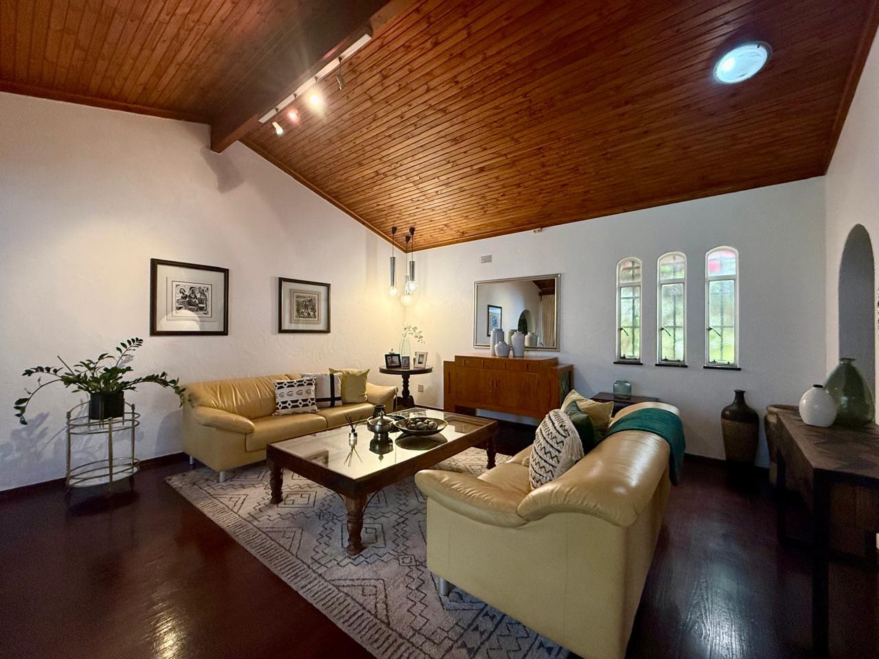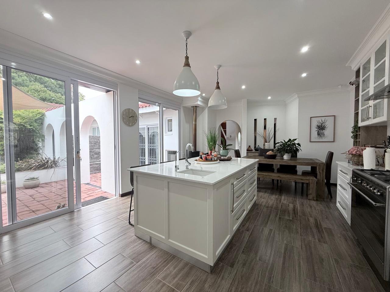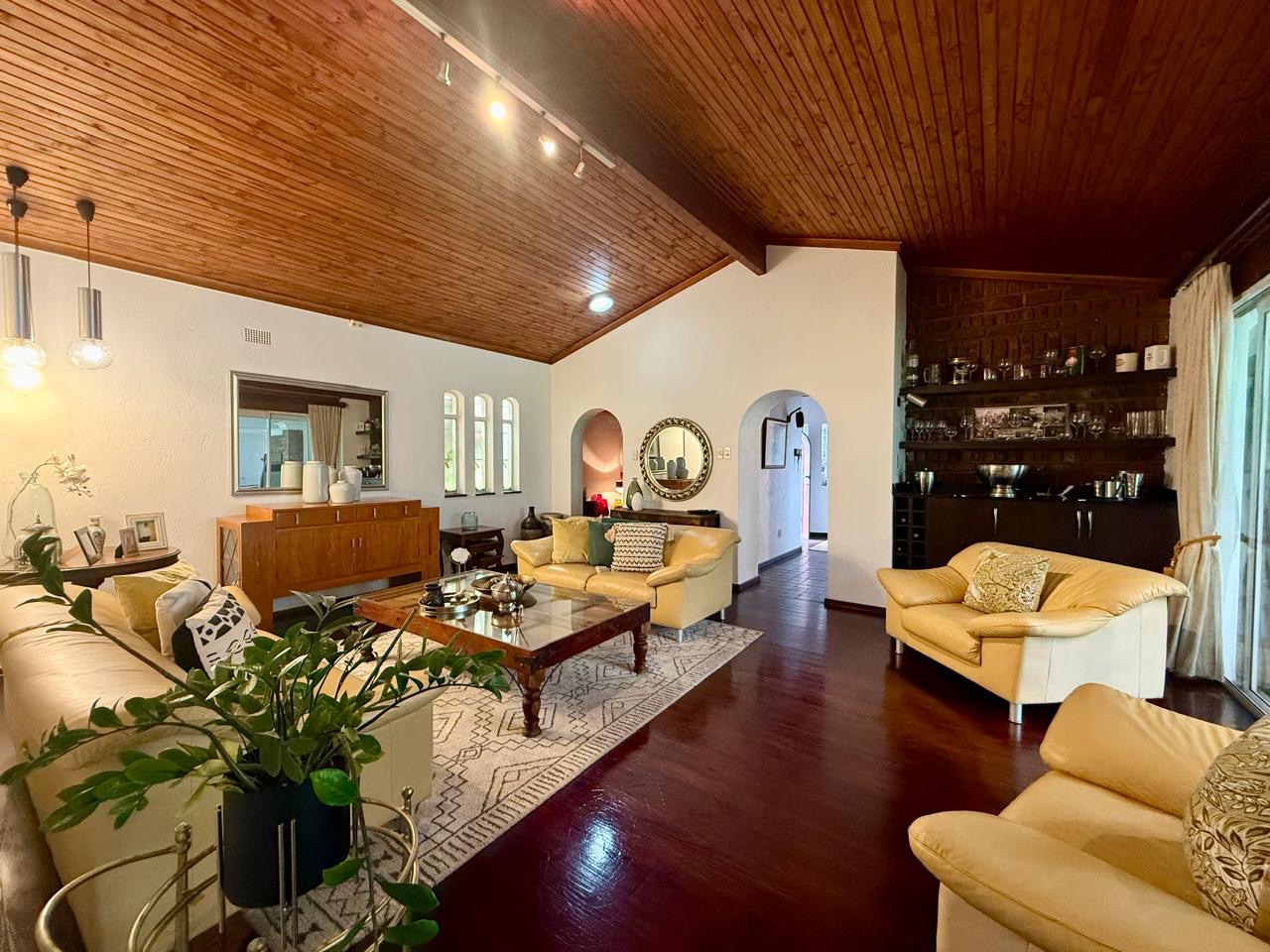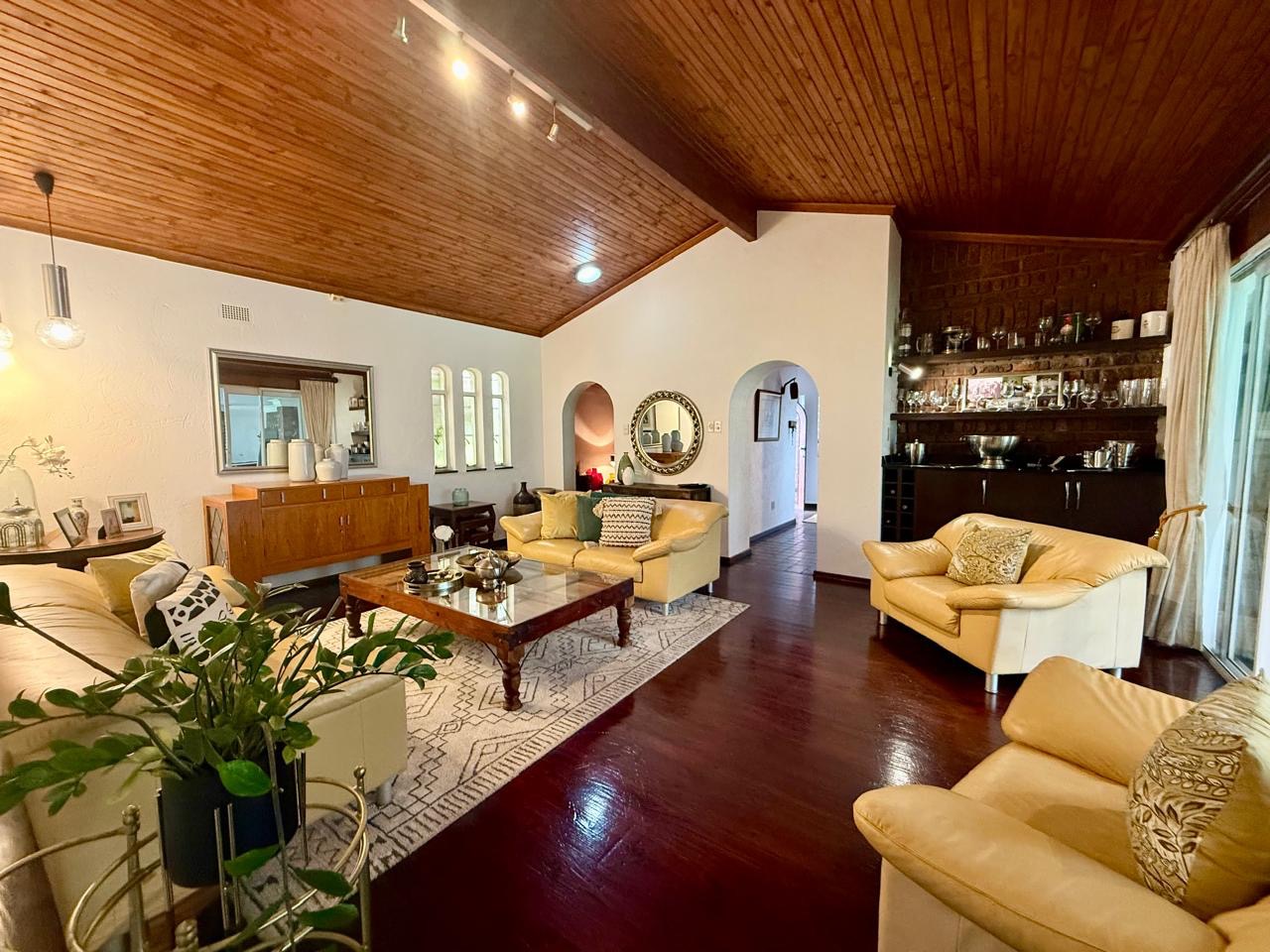 The spacious lounge flows effortlessly into an exceptional entertainment area, complete with a glass awning, stack doors and a built-in braai — ideal for hosting in any season. From here, the home opens out to a lush, landscaped garden oasis with a large swimming pool, creating a serene setting for both relaxation and family enjoyment. A second lounge with a cosy fireplace provides an additional living area for quieter moments.