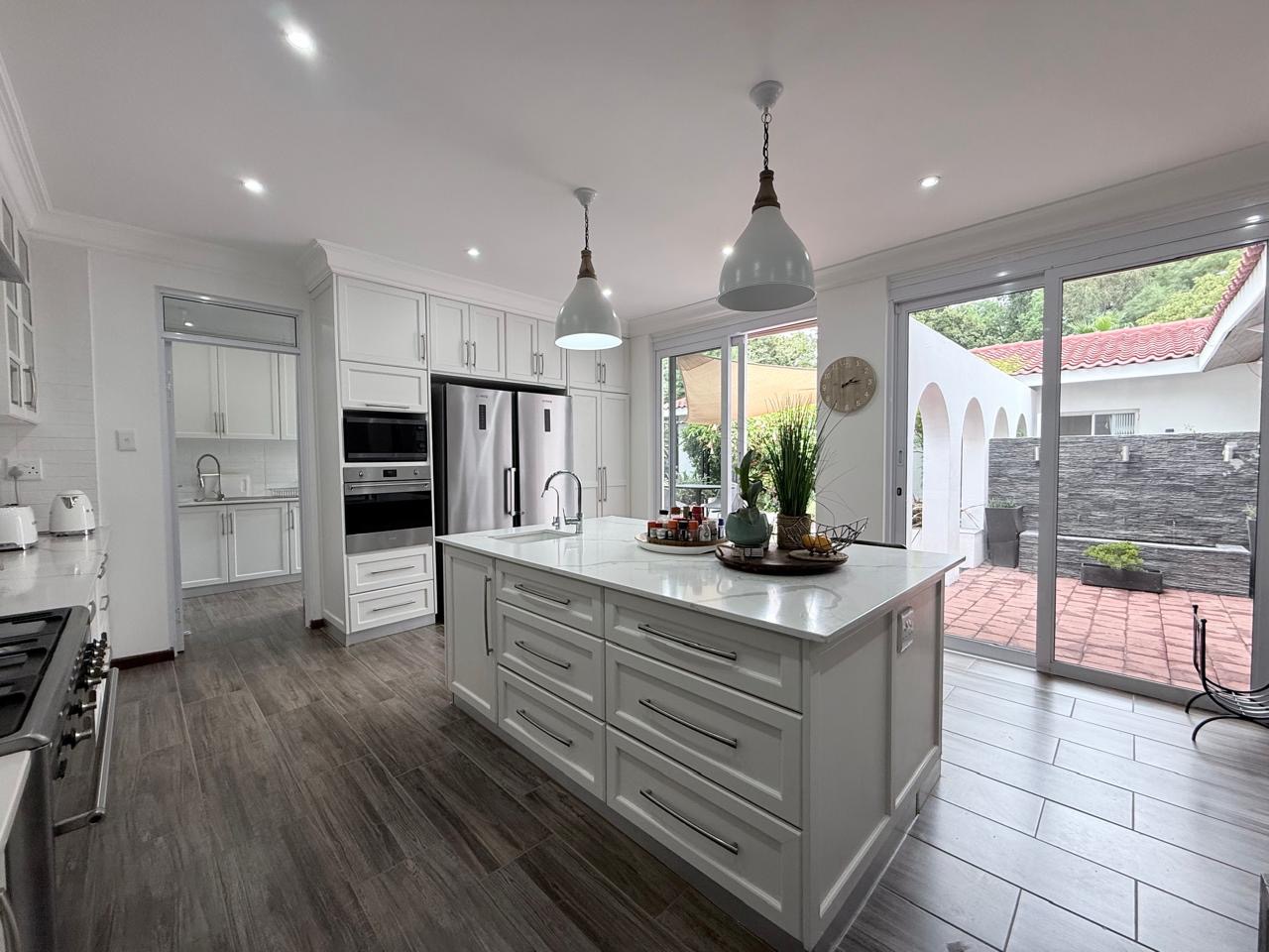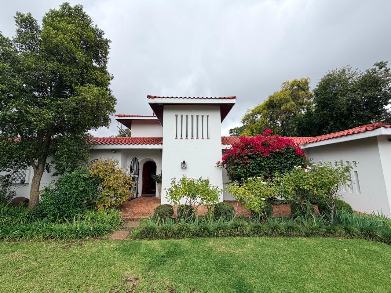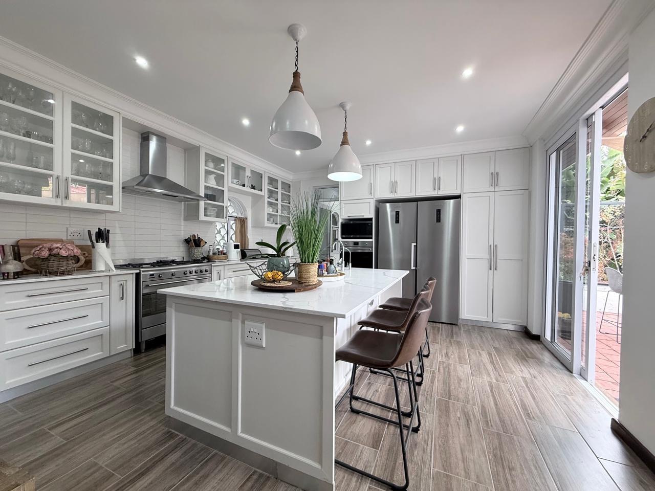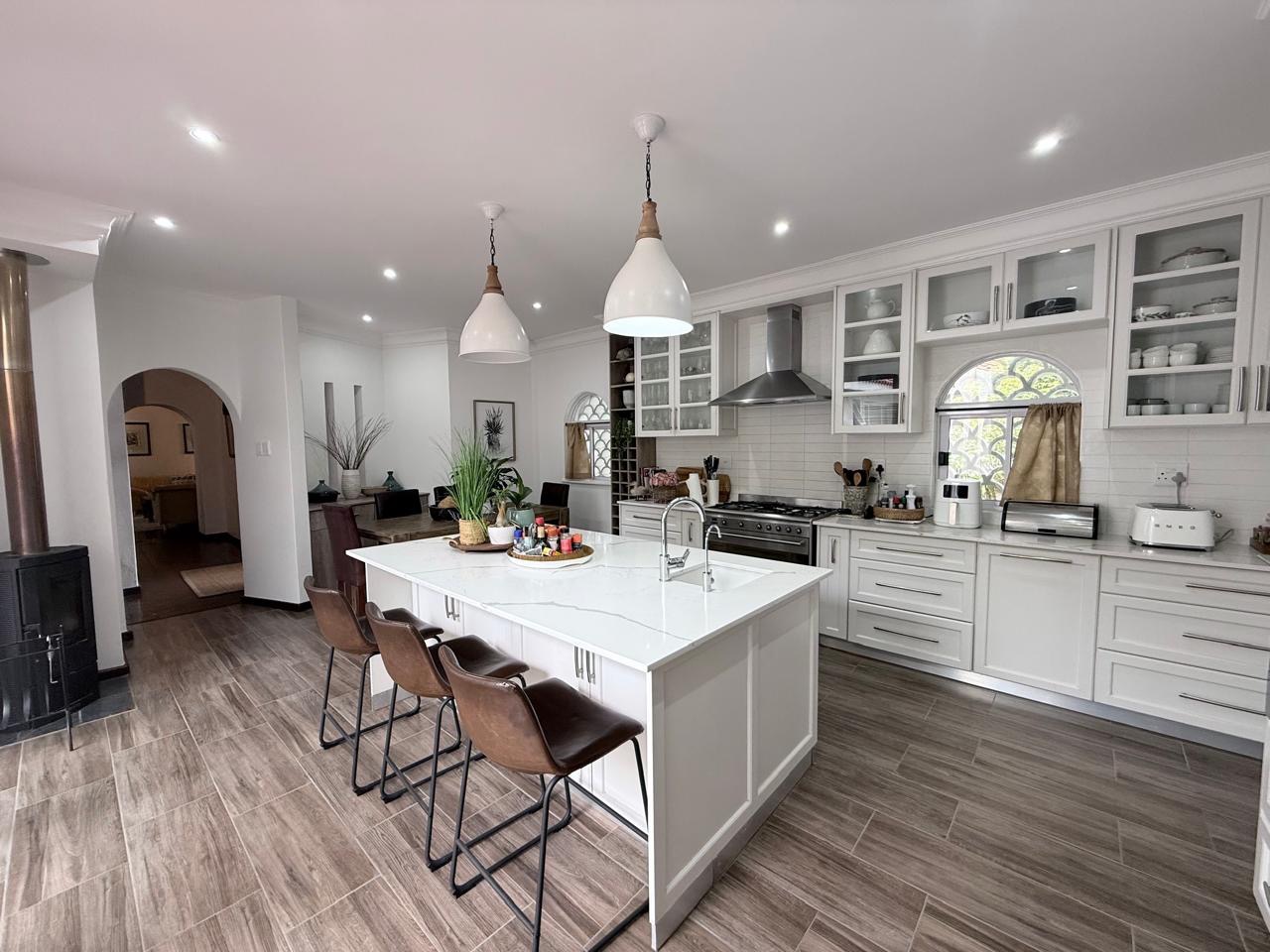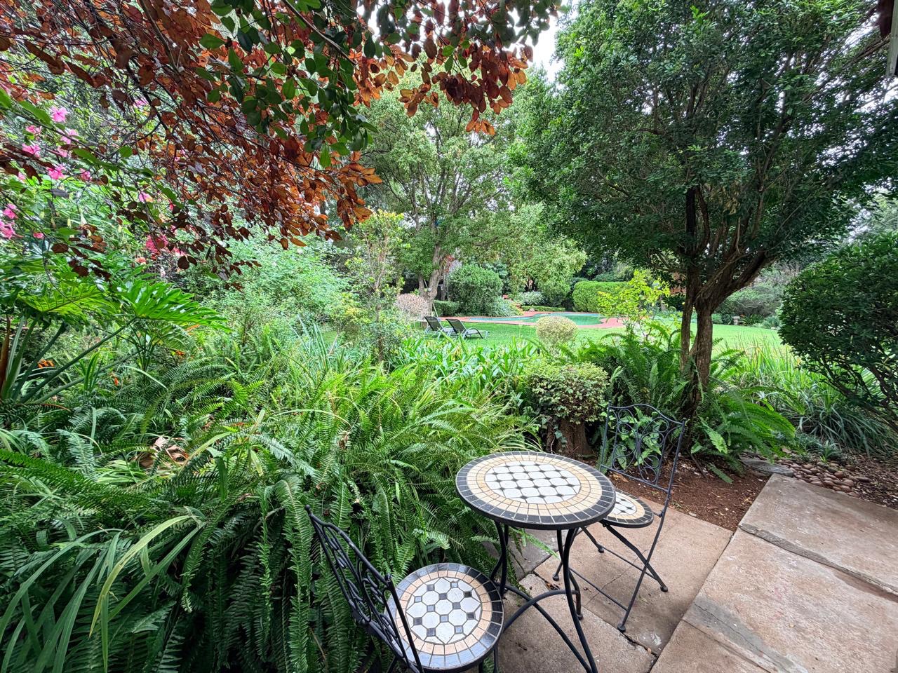 The spacious lounge flows effortlessly into an exceptional entertainment area, complete with a glass awning, stack doors and a built-in braai — ideal for hosting in any season. From here, the home opens out to a lush, landscaped garden oasis with a large swimming pool, creating a serene setting for both relaxation and family enjoyment. A second lounge with a cosy fireplace provides an additional living area for quieter moments.
