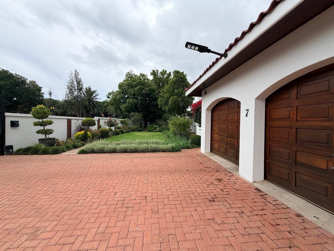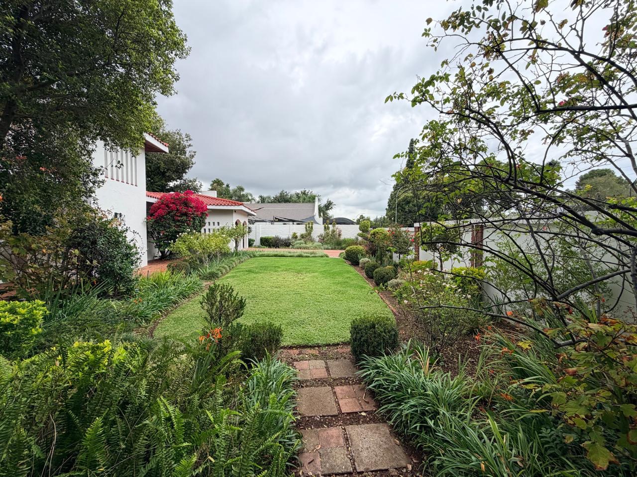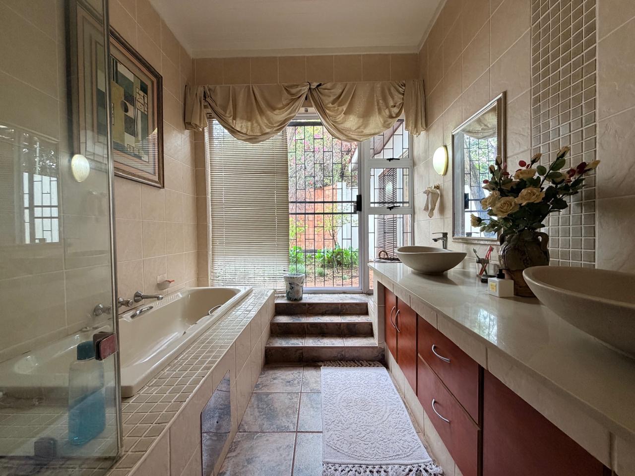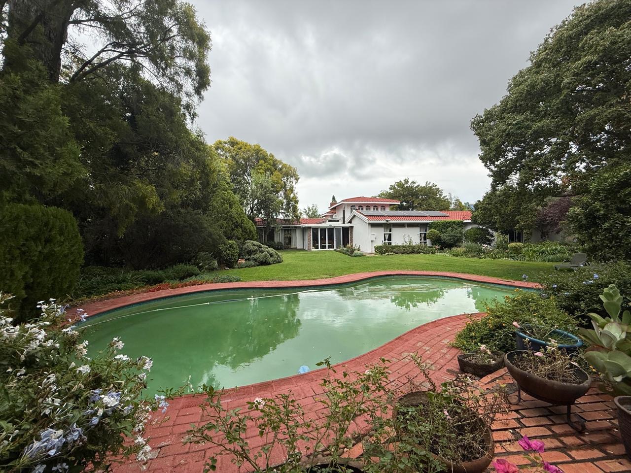 The spacious lounge flows effortlessly into an exceptional entertainment area, complete with a glass awning, stack doors and a built-in braai — ideal for hosting in any season. From here, the home opens out to a lush, landscaped garden oasis with a large swimming pool, creating a serene setting for both relaxation and family enjoyment. A second lounge with a cosy fireplace provides an additional living area for quieter moments.