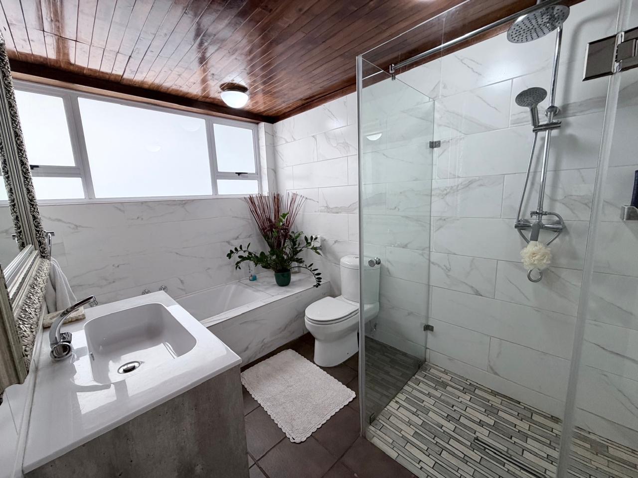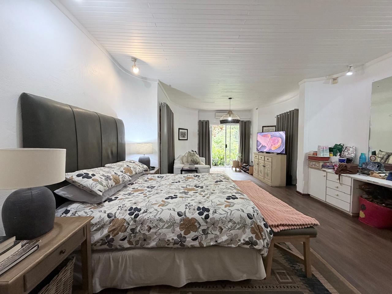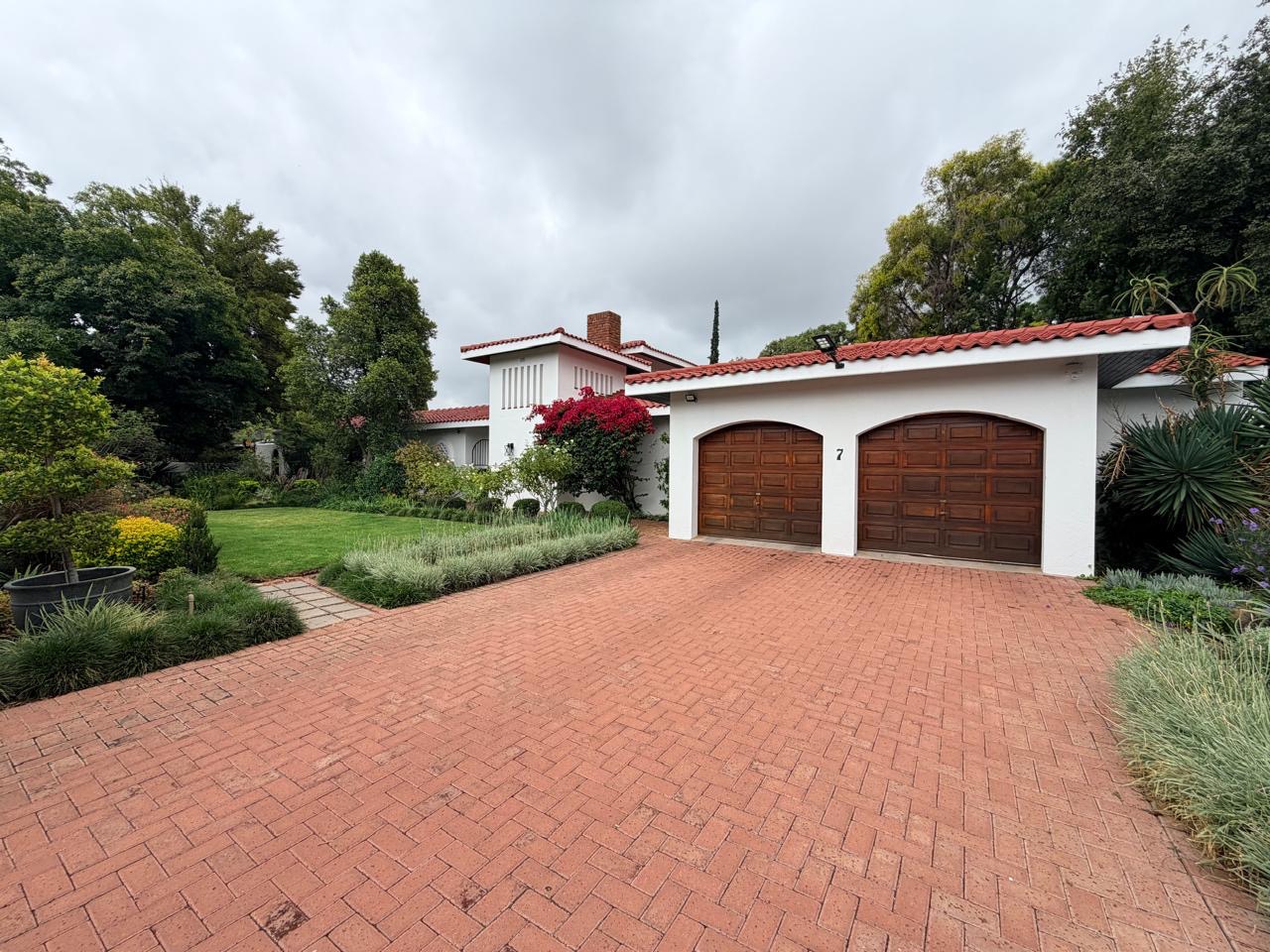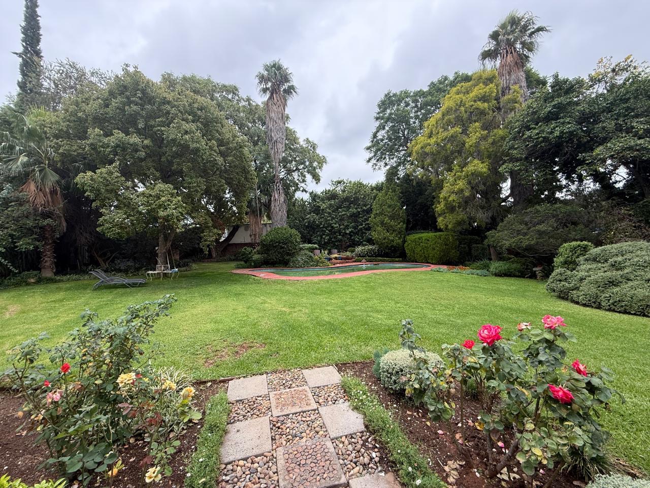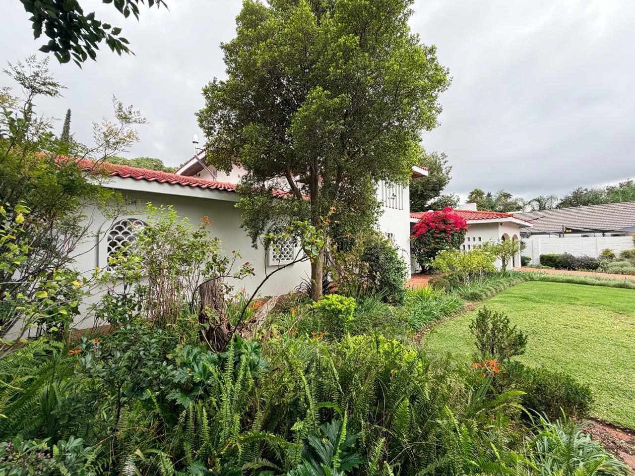 The spacious lounge flows effortlessly into an exceptional entertainment area, complete with a glass awning, stack doors and a built-in braai — ideal for hosting in any season. From here, the home opens out to a lush, landscaped garden oasis with a large swimming pool, creating a serene setting for both relaxation and family enjoyment. A second lounge with a cosy fireplace provides an additional living area for quieter moments.