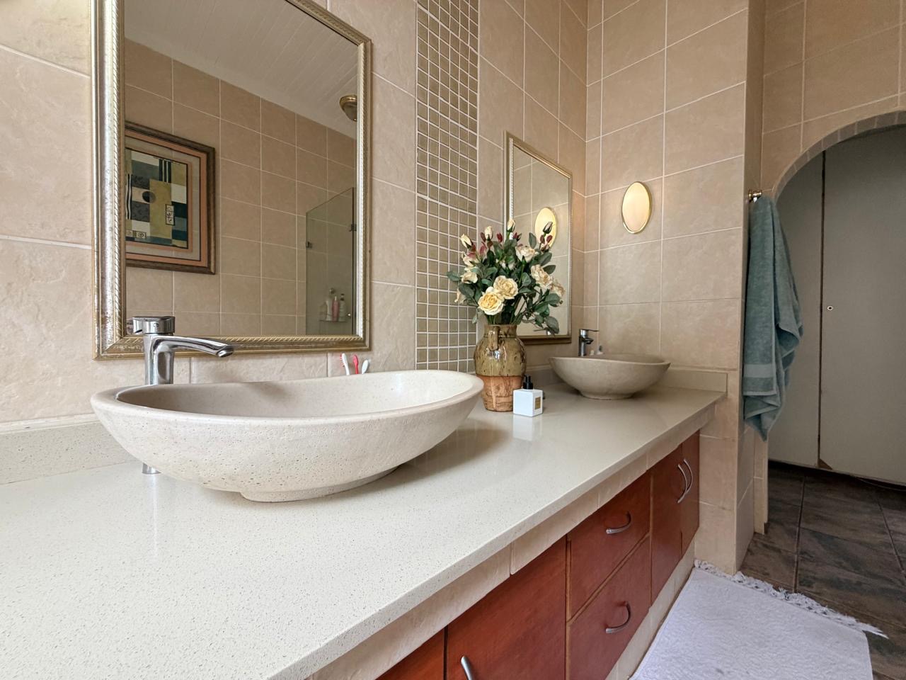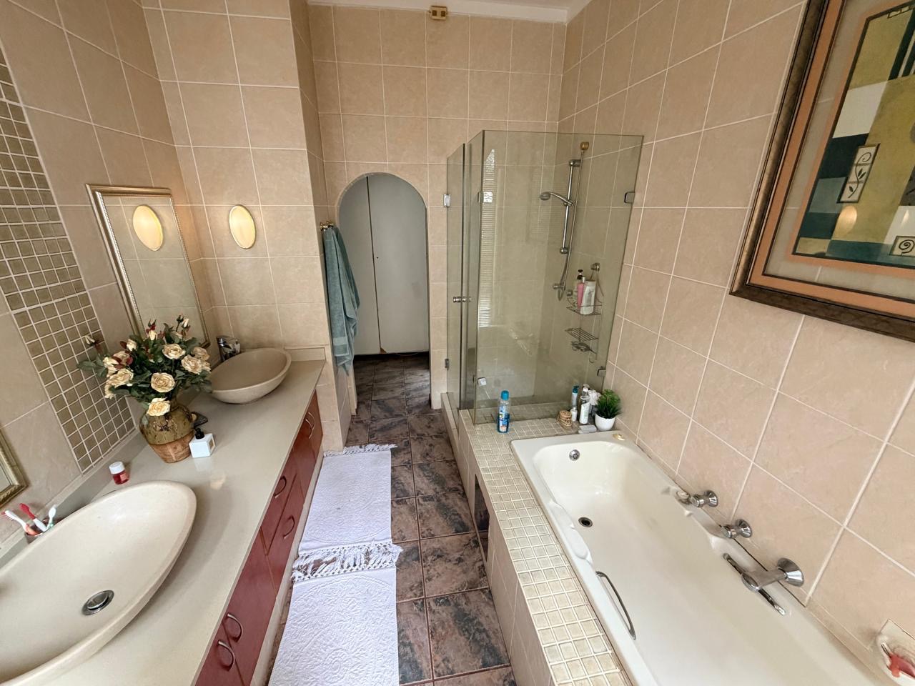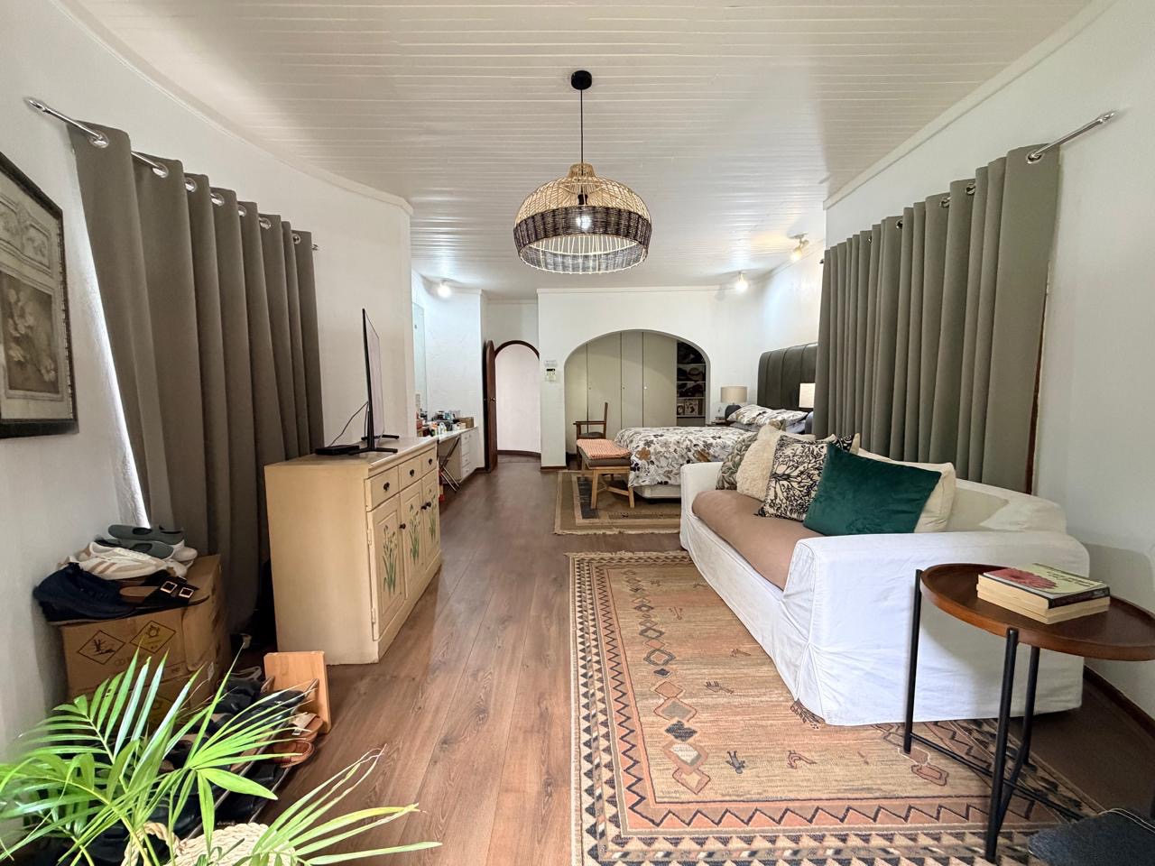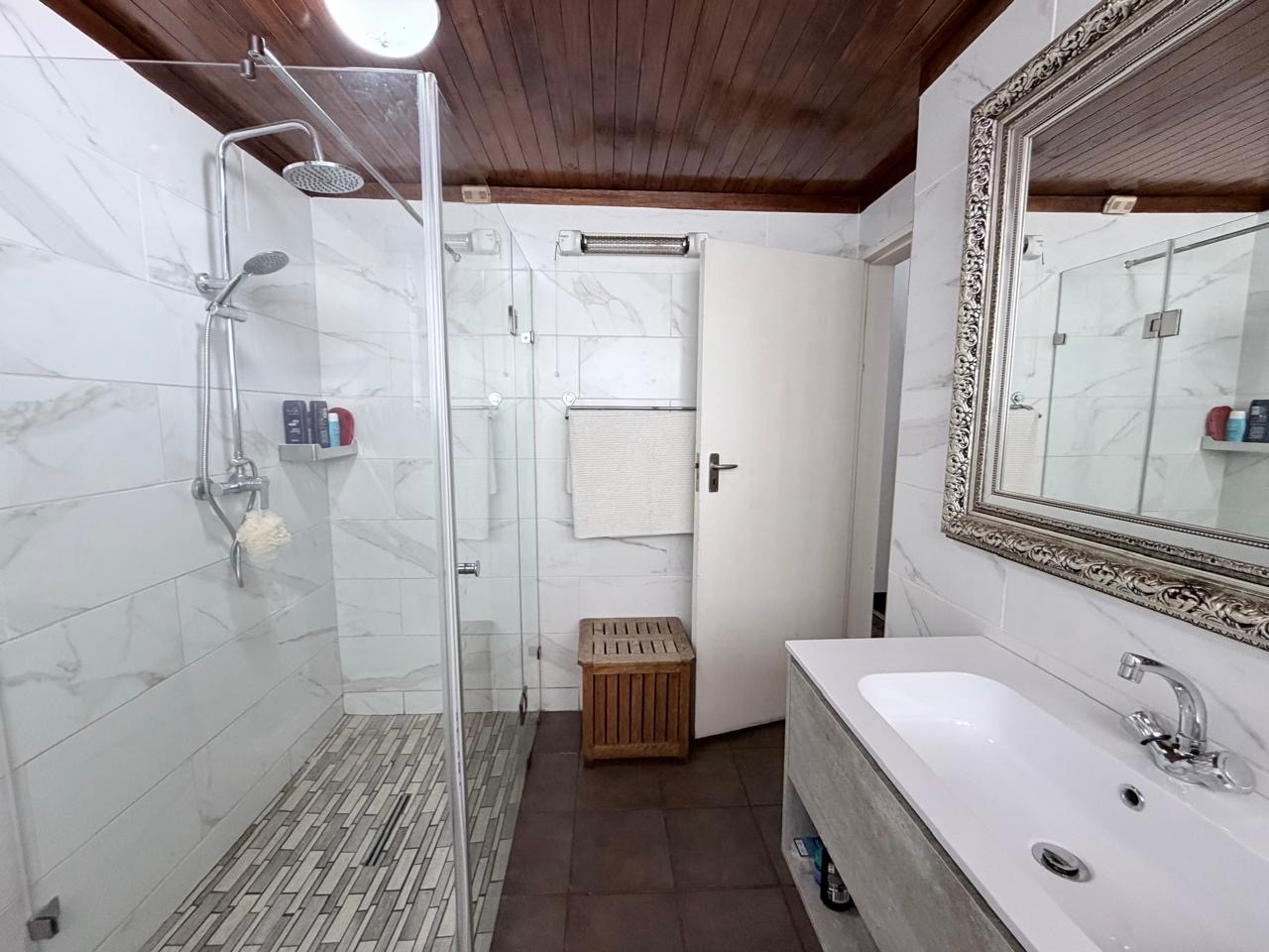 The spacious lounge flows effortlessly into an exceptional entertainment area, complete with a glass awning, stack doors and a built-in braai — ideal for hosting in any season. From here, the home opens out to a lush, landscaped garden oasis with a large swimming pool, creating a serene setting for both relaxation and family enjoyment. A second lounge with a cosy fireplace provides an additional living area for quieter moments.