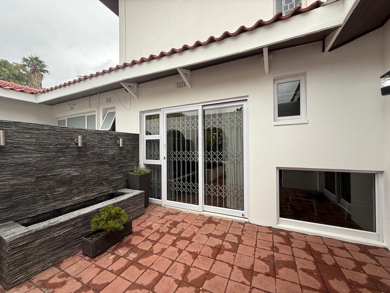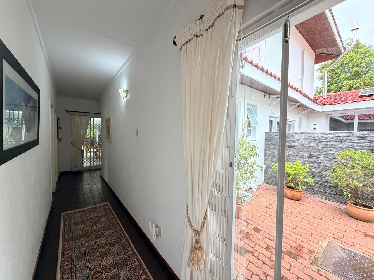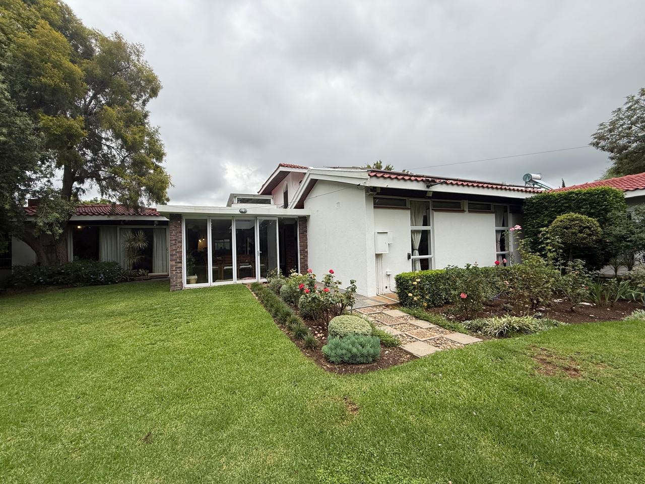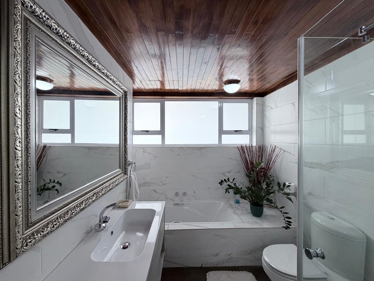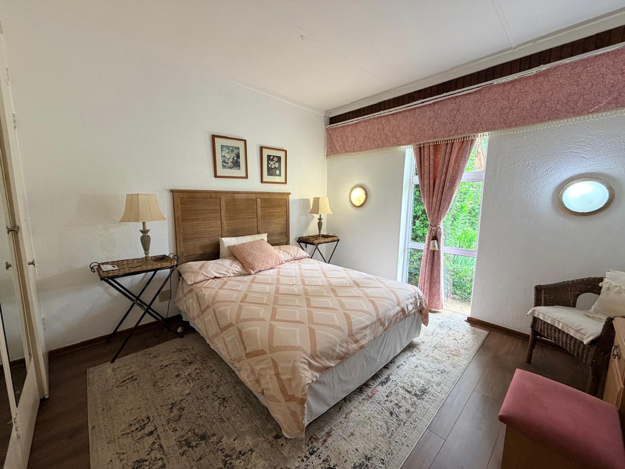 The spacious lounge flows effortlessly into an exceptional entertainment area, complete with a glass awning, stack doors and a built-in braai — ideal for hosting in any season. From here, the home opens out to a lush, landscaped garden oasis with a large swimming pool, creating a serene setting for both relaxation and family enjoyment. A second lounge with a cosy fireplace provides an additional living area for quieter moments.