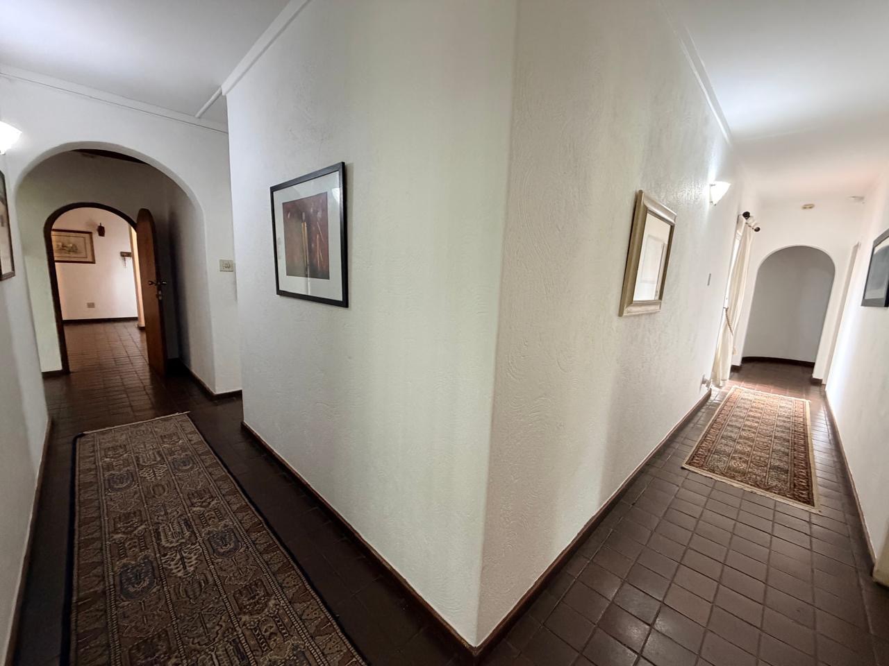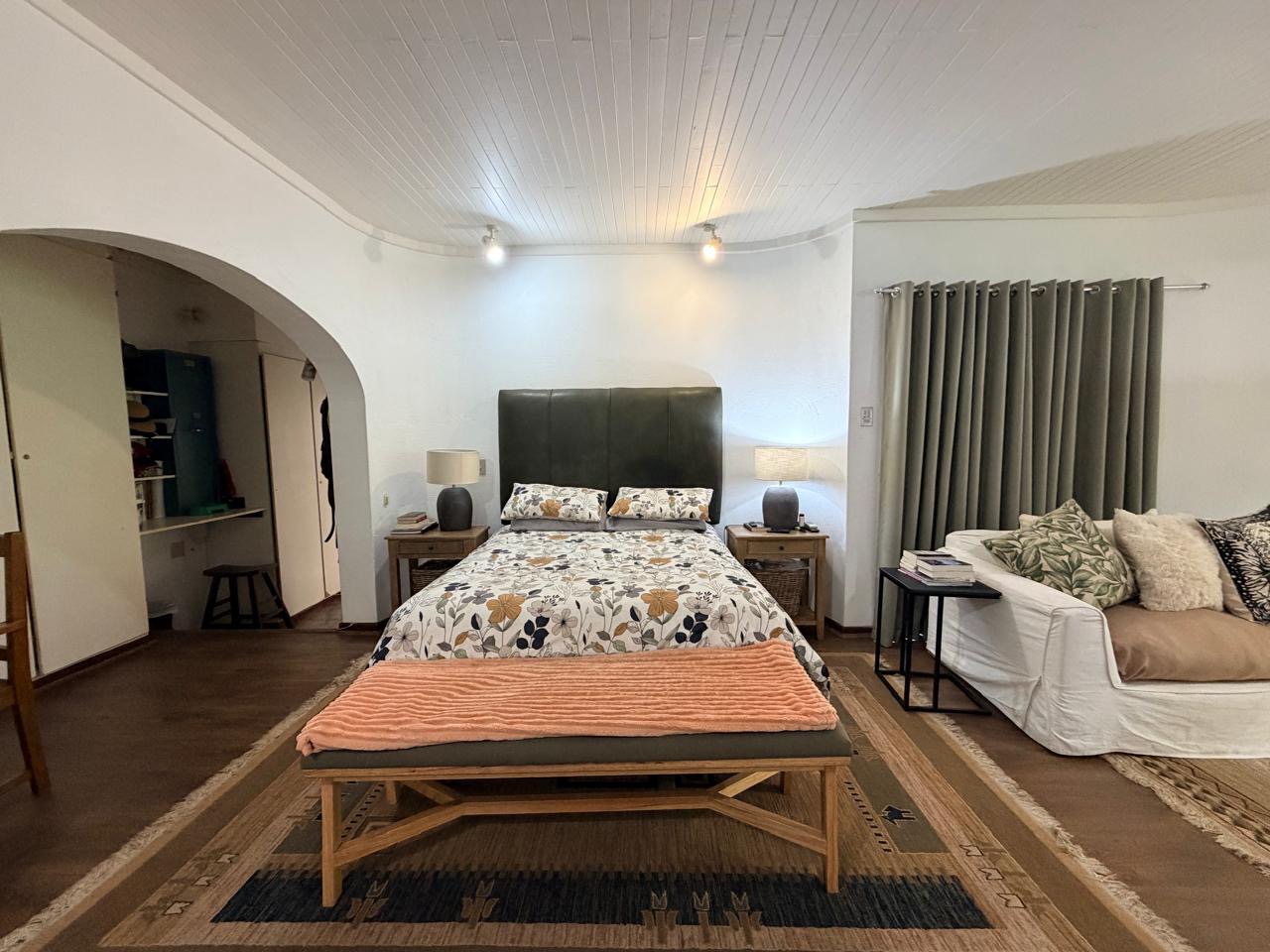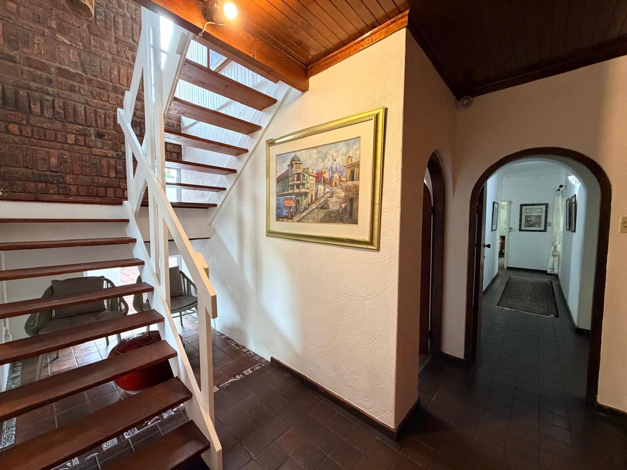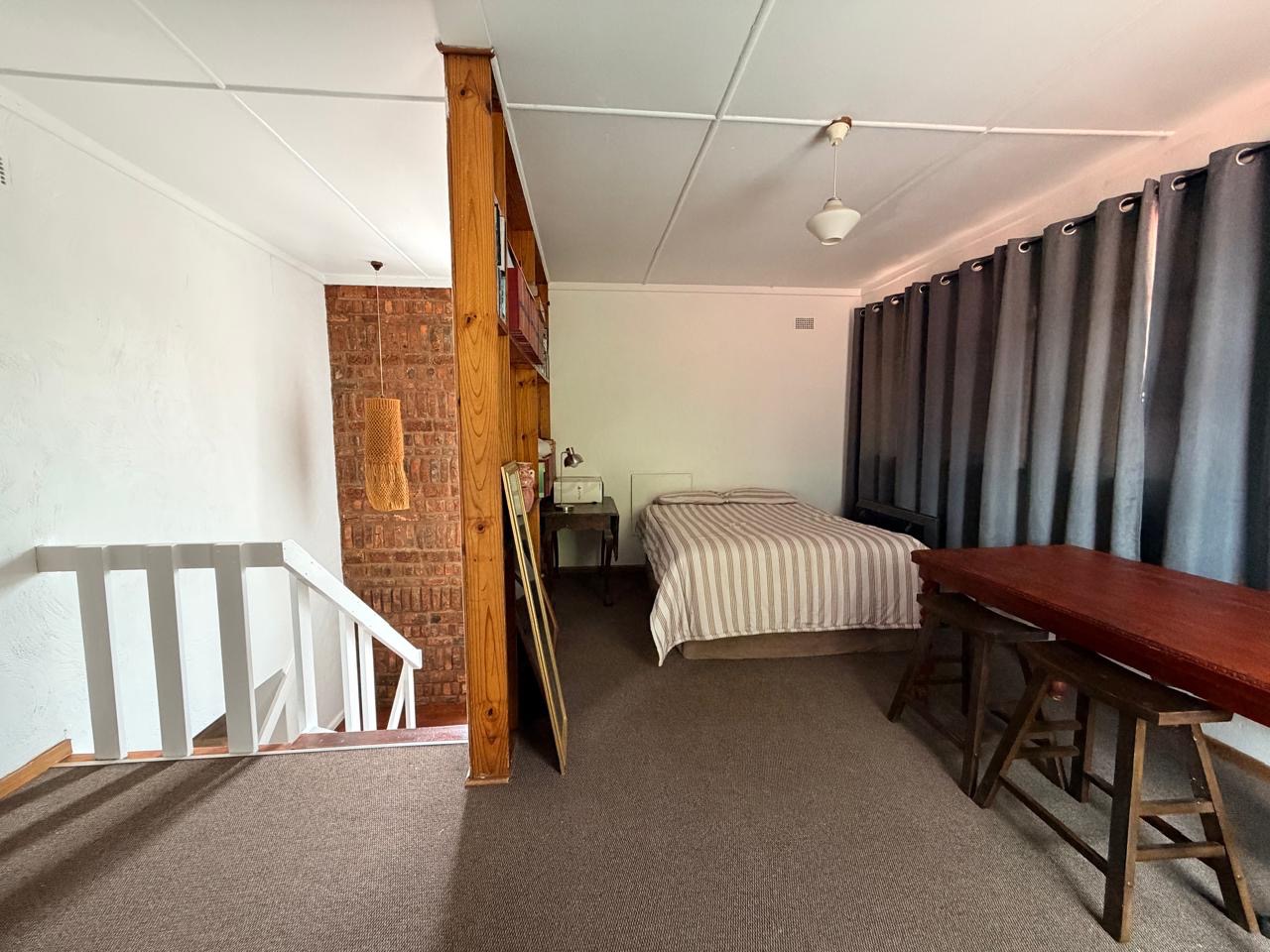 Heading down the hallway, a staircase leads up to a loft-style room, ideal for a home office, studio or reading sanctuary. The main level includes a well-sized dedicated office and four generously proportioned bedrooms, each featuring built-in cupboards. A guest toilet serves the living area, while a beautifully updated modern family bathroom includes a bath, shower, toilet and basin.