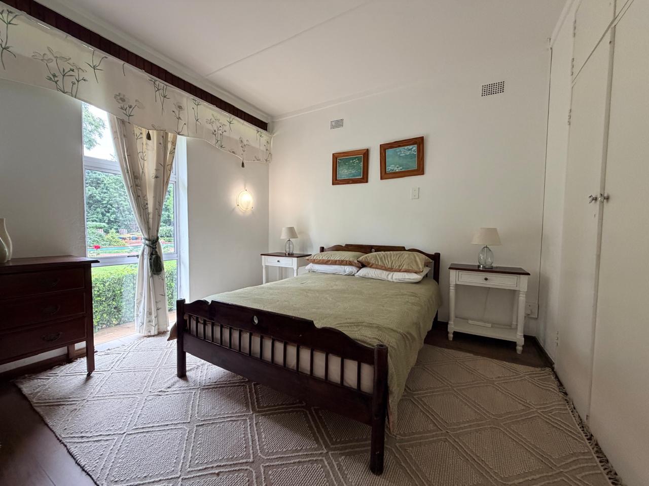 The main bedroom is exceptionally spacious, with its own private door opening directly onto the garden. It also features a stylish en-suite bathroom with a bath, shower, toilet and double basins.
