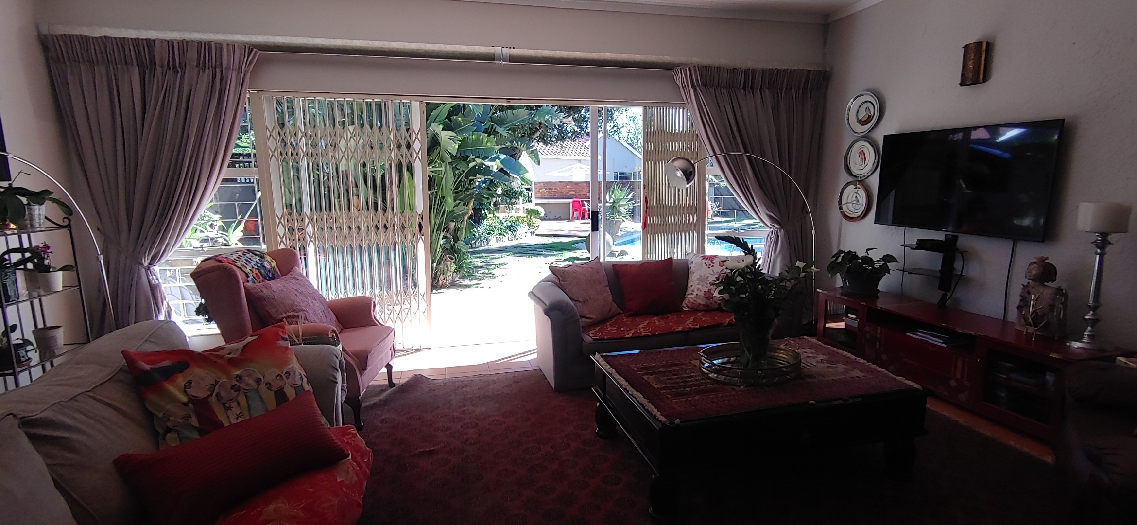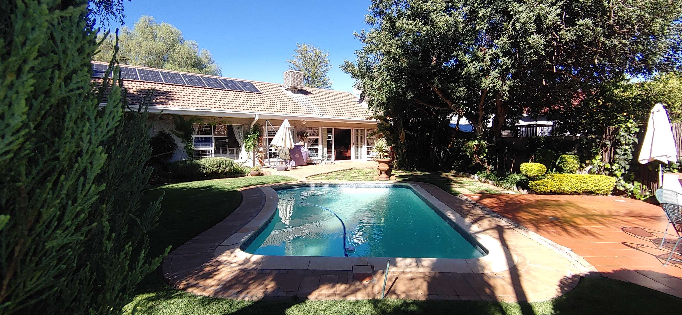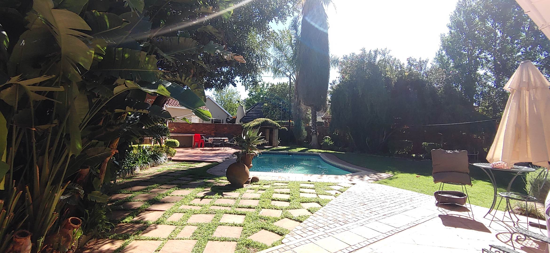 A lovely sunroom overlooks the lush garden and sparkling swimming pool, creating a relaxing space to unwind while enjoying the beautiful