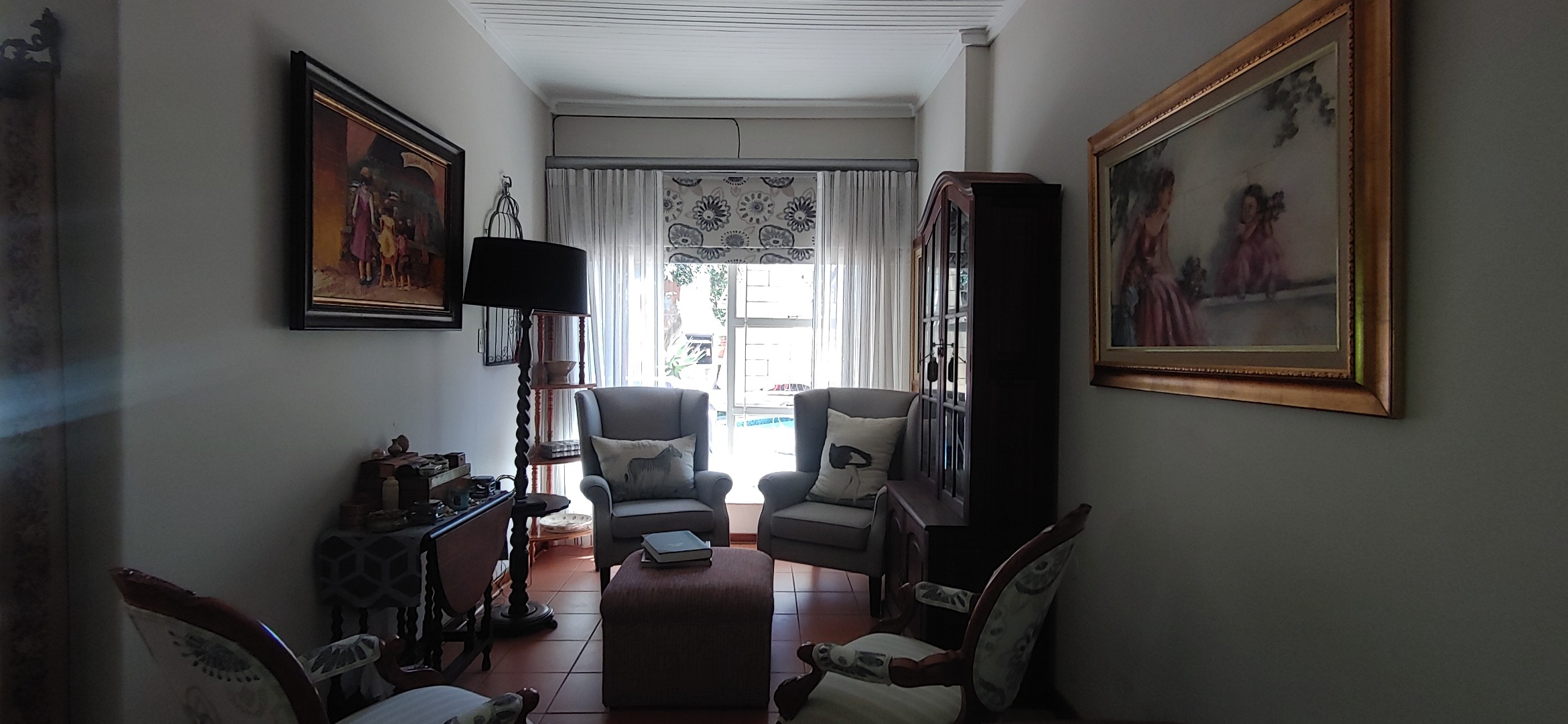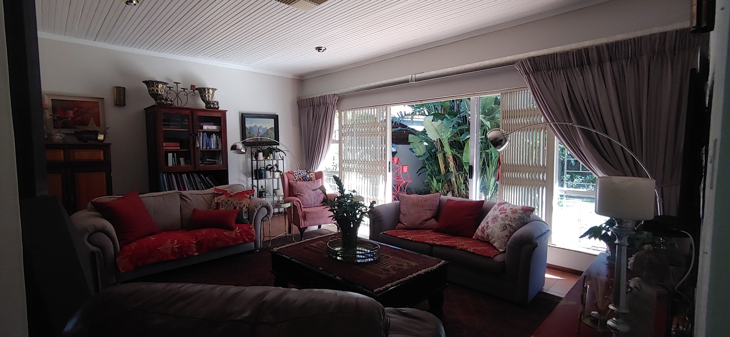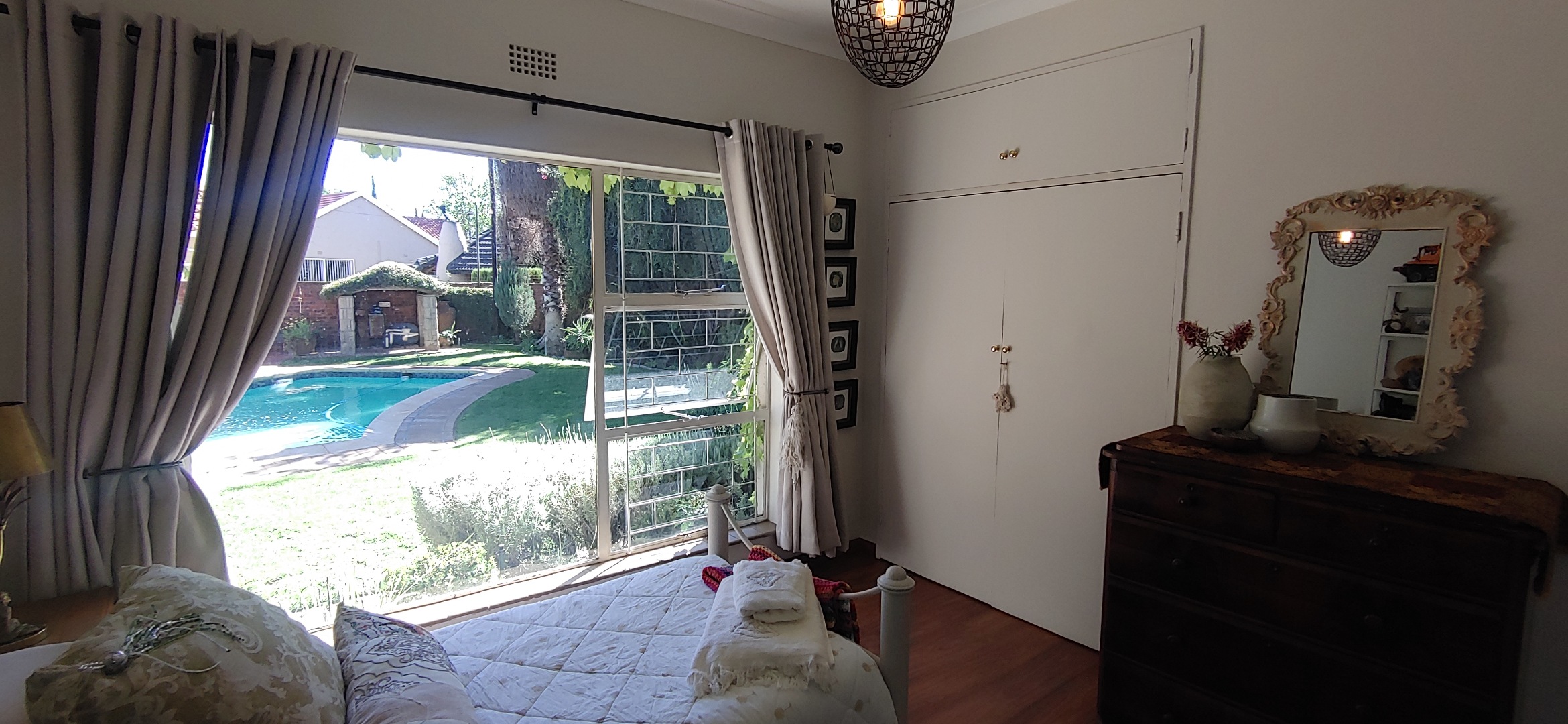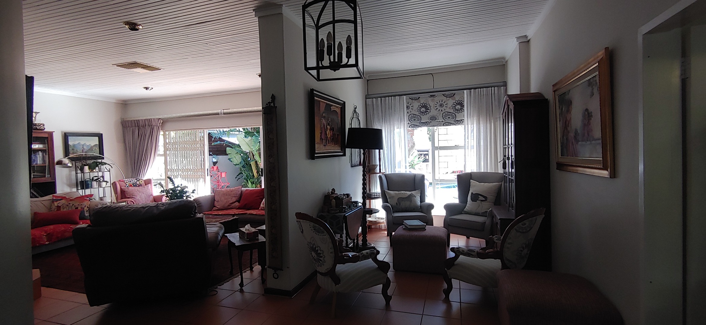 A lovely sunroom overlooks the lush garden and sparkling swimming pool, creating a relaxing space to unwind while enjoying the beautiful