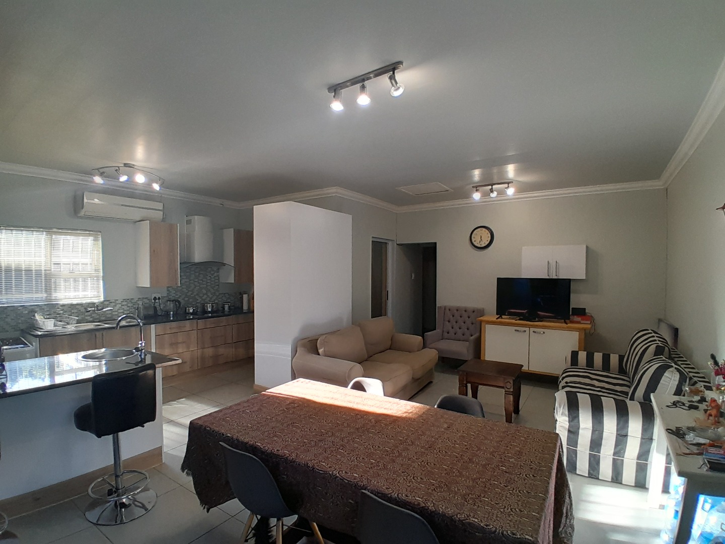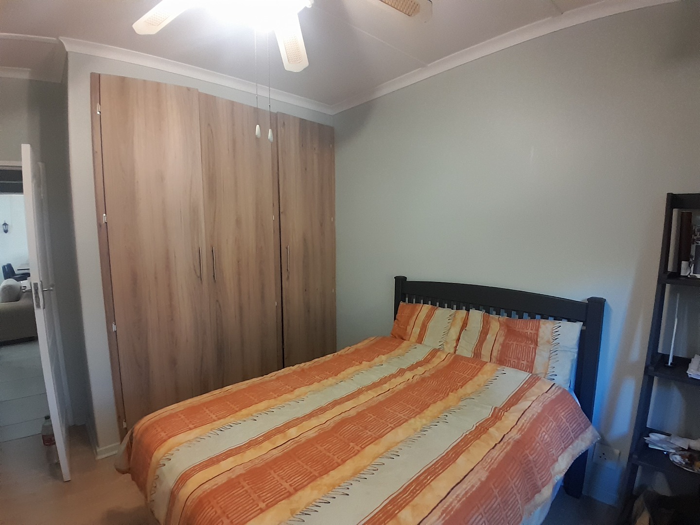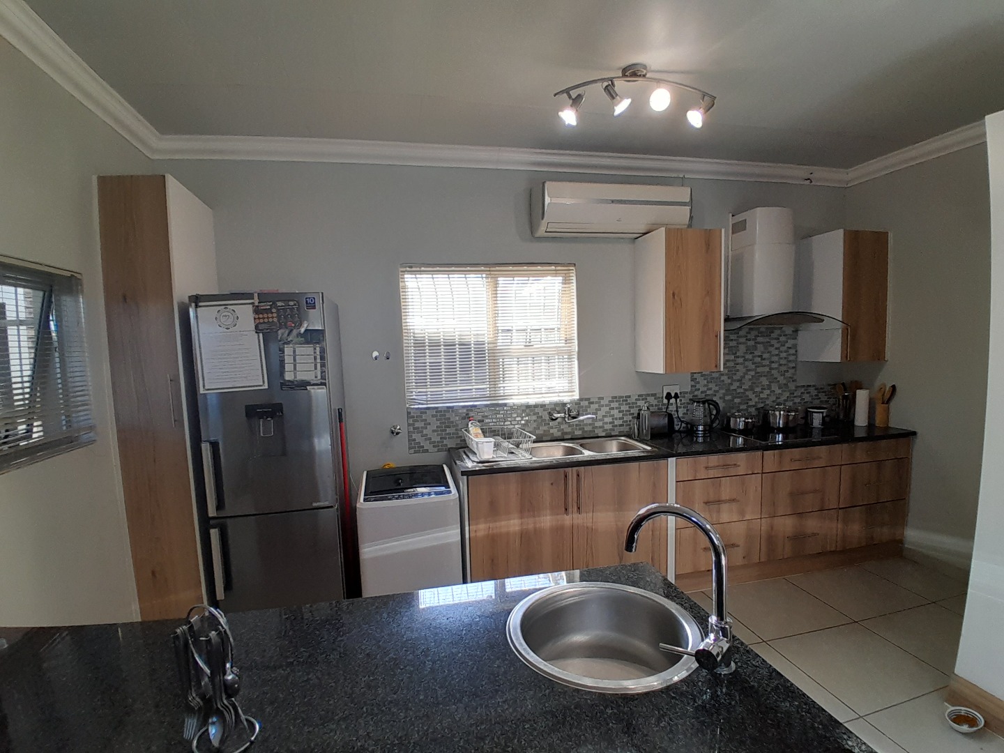 The modern open plan kitchen and lounge welcomes you into the property. The kitchen is equipped with a stove, microwave, fridge and washing machine. Cupboard space is not a problem. Air con.